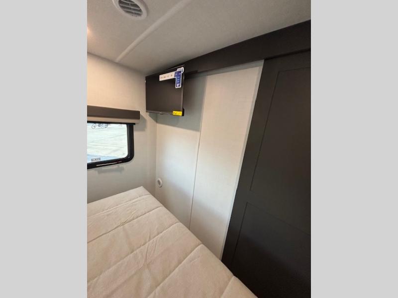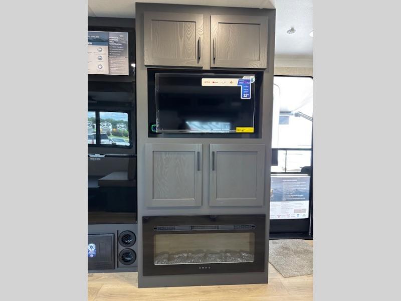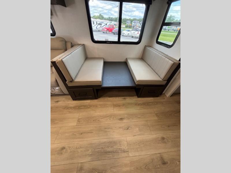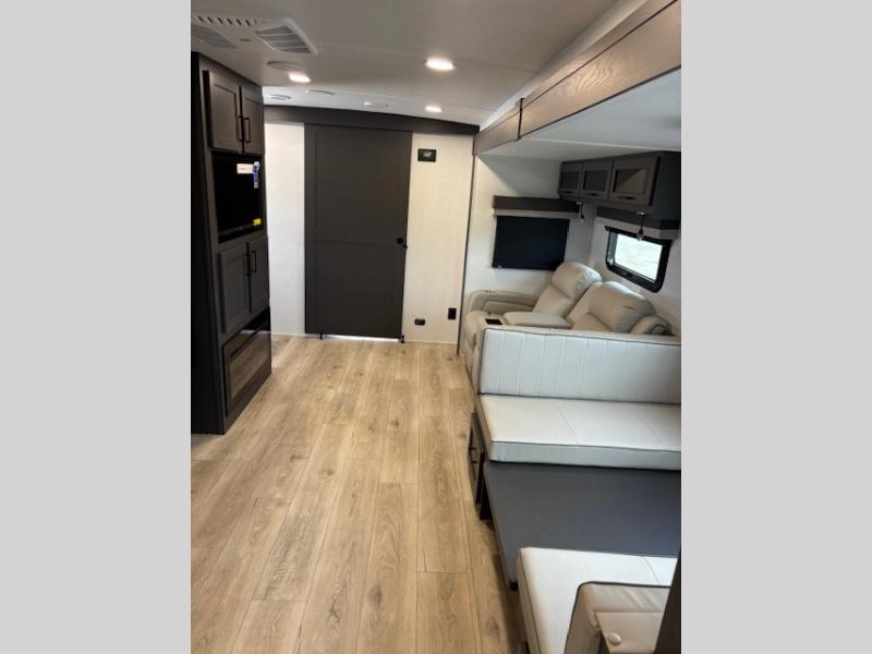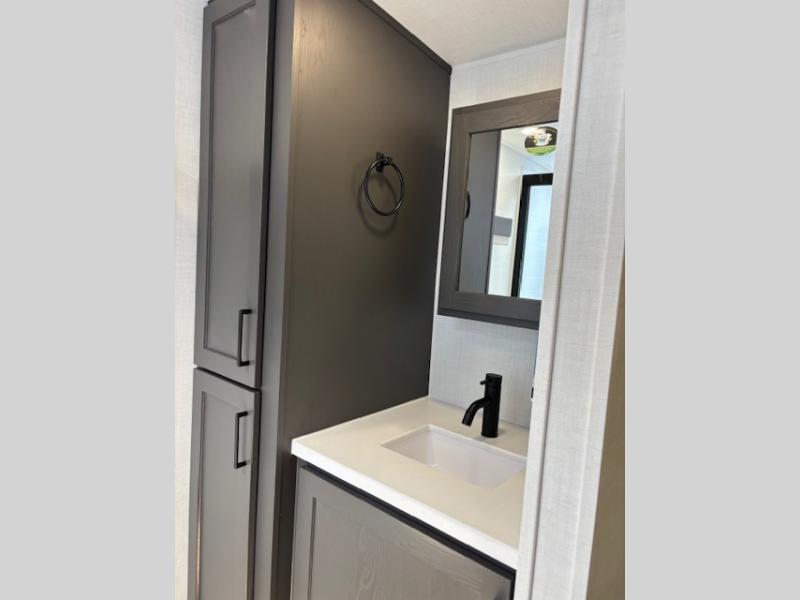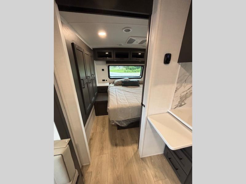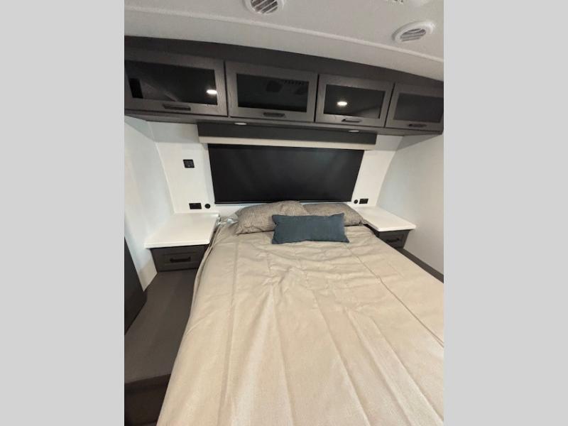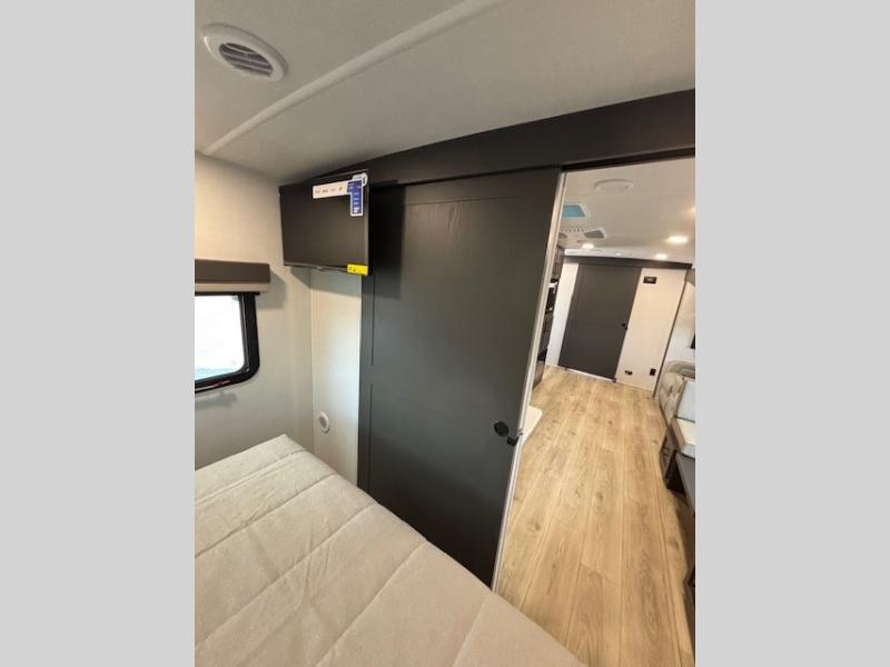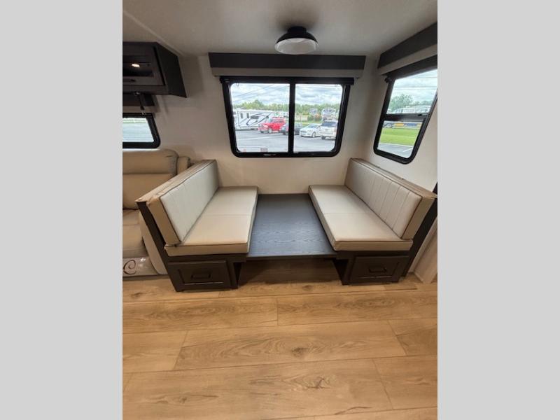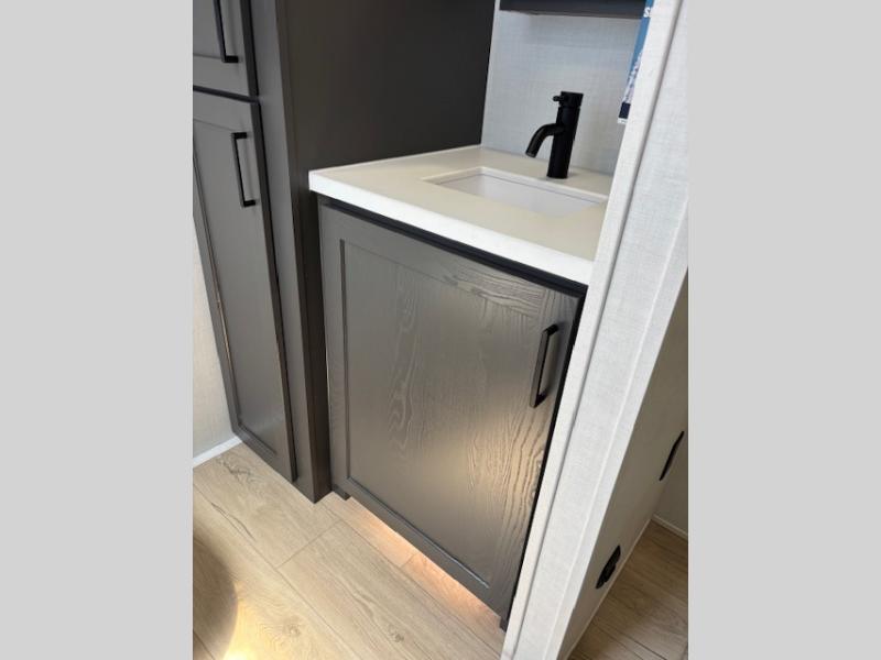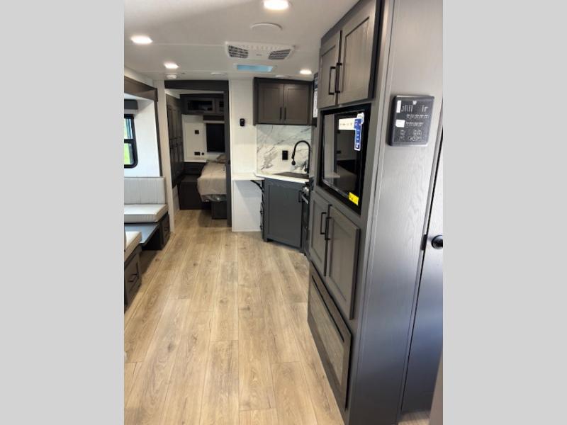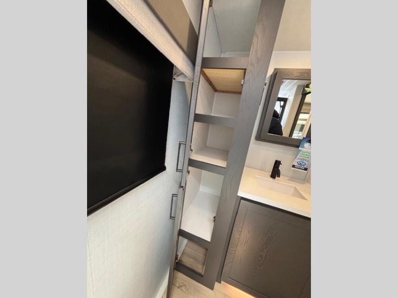 Enjoy inside comforts, and outside conveniences in this trailer. You can relax under the 21' awning which offers an outdoor living area protected from the elements, and a pass-thru storage with an optional steel sliding tray gives you the option to easily access your gear. You'll find ample storage space inside as well, including a walk-in pantry by the entry door for convenience! The cook will have full amenities to make meals, and when you are ready to sleep, head to the front bedroom with a queen bed and plenty of storage, and a wardrobe slide out giving you more floor and storage space.