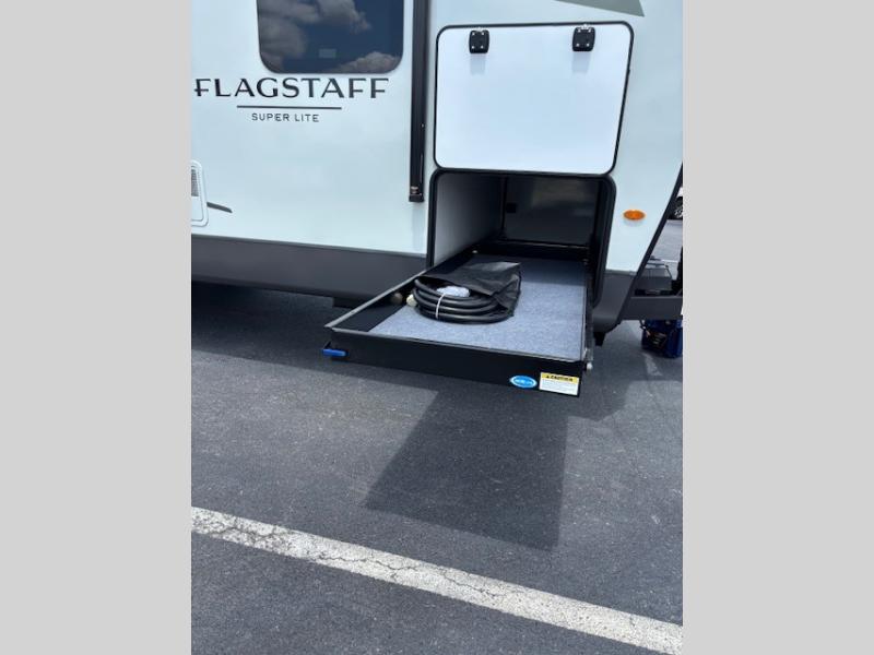 With any Flagstaff Super Lite travel trailer by Forest River the towing features include the TST tire pressure monitor system with a monitor providing safety on the road, Easy Lube axles and Nev-R adjust brakes, a power tongue jack for easy setup, and rear observation camera prep. Each is built with 6 sided aluminum framed side walls, end wall, front, floor and a roof, a plywood tongue and groove subfloor, electronically controlled heated holding tanks and an enclosed underbelly allowing you to travel during any season. The interior includes designer kitchen backsplash, solid surface kitchen countertops, Sedonwood cabinetry, and solid wood cabinet doors and drawers to make you feel right at home.