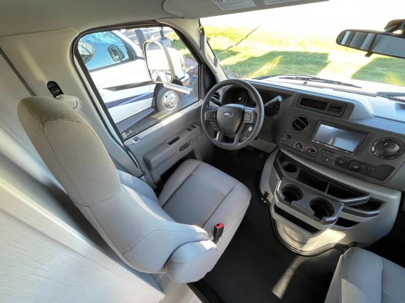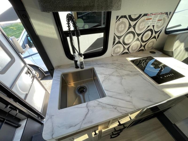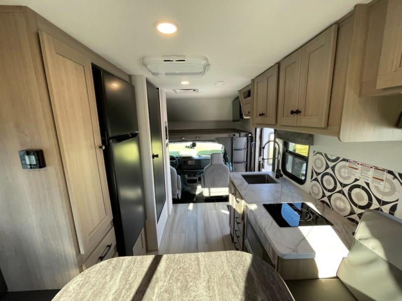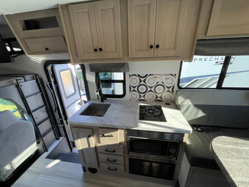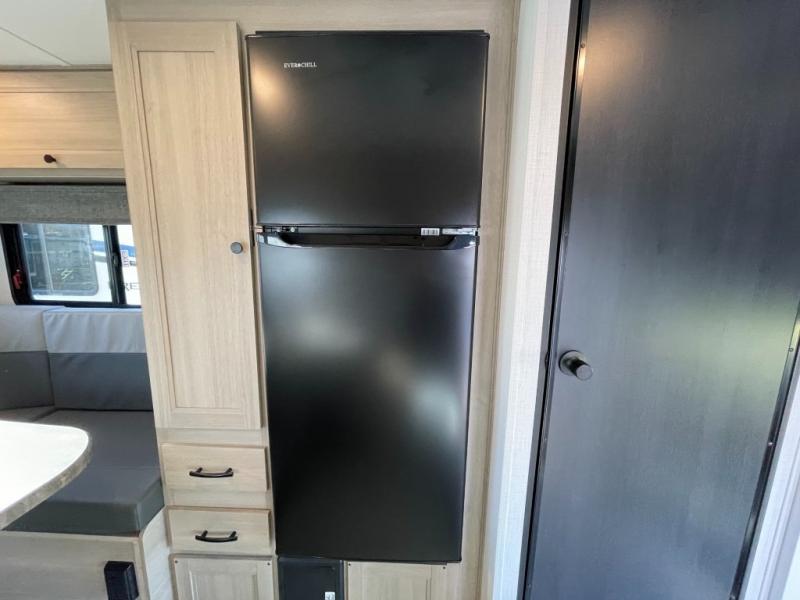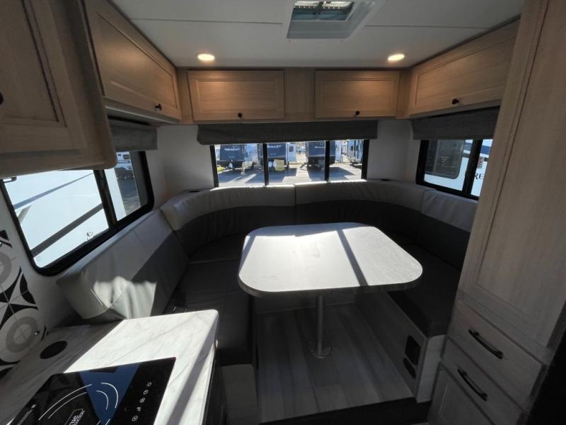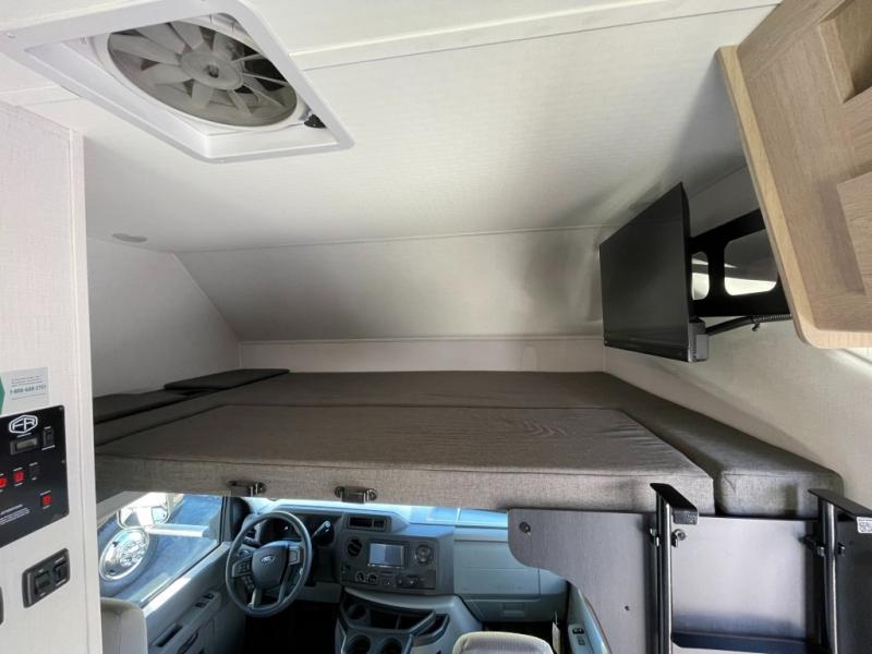 This motorhome is perfect for couples or small families. The bunk over the cab provides a cozy sleeping area, while the U-dinette offers additional sleeping space for guests or family members. The 12V TV is perfect for relaxing in the evenings or enjoying your favorite shows on the go. Plus, the wet bath is a practical and efficient space, making it easy to get ready in the morning or freshen up after a long day. Further, the kitchen is equipped with a 12V fridge, convection microwave/air fryer, and flip-up countertop, providing ample space to prepare meals and snacks. The pantry offers additional storage for your food and cooking essentials. Additionally, overhead cabinets throughout the unit provide plenty of storage for your belongings.