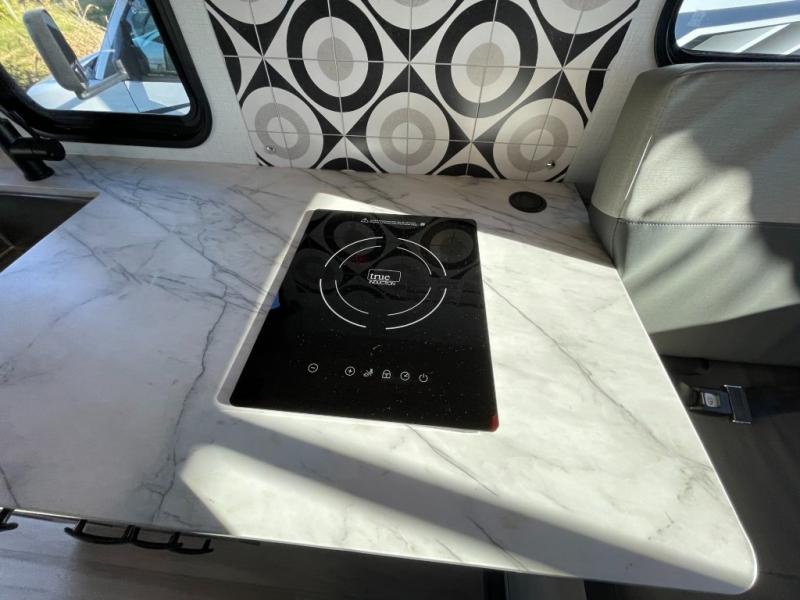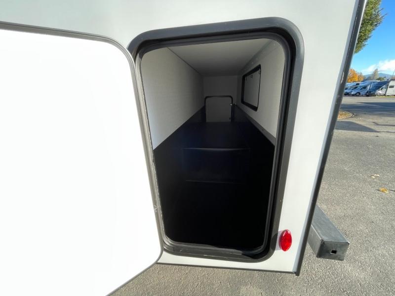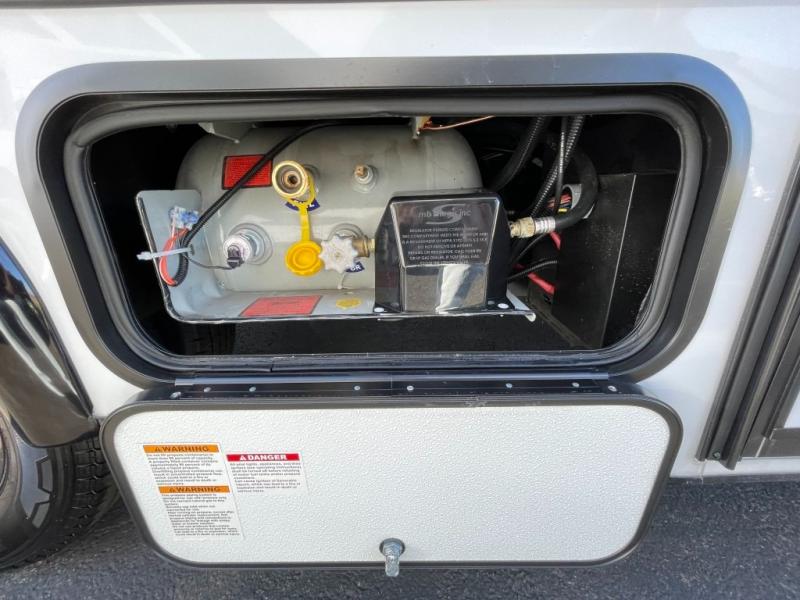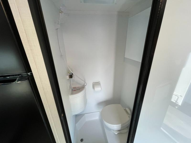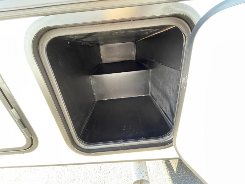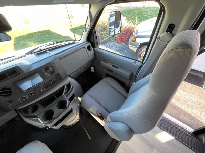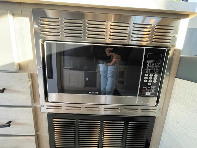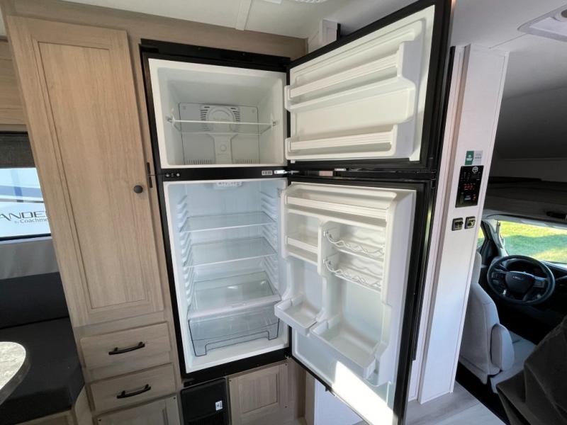 This motorhome is perfect for couples or small families. The bunk over the cab provides a cozy sleeping area, while the U-dinette offers additional sleeping space for guests or family members. The 12V TV is perfect for relaxing in the evenings or enjoying your favorite shows on the go. Plus, the wet bath is a practical and efficient space, making it easy to get ready in the morning or freshen up after a long day. Further, the kitchen is equipped with a 12V fridge, convection microwave/air fryer, and flip-up countertop, providing ample space to prepare meals and snacks. The pantry offers additional storage for your food and cooking essentials. Additionally, overhead cabinets throughout the unit provide plenty of storage for your belongings.