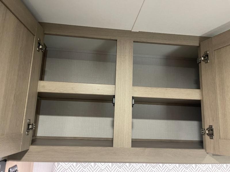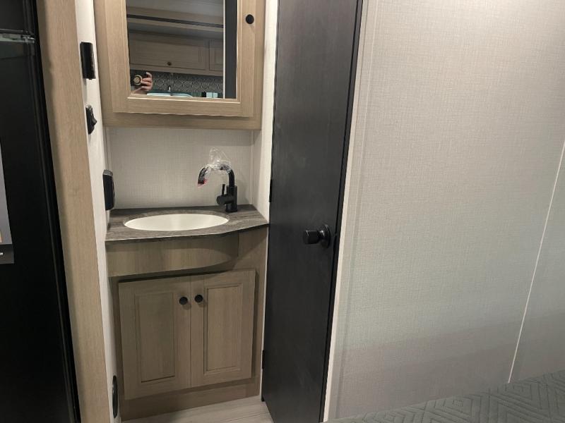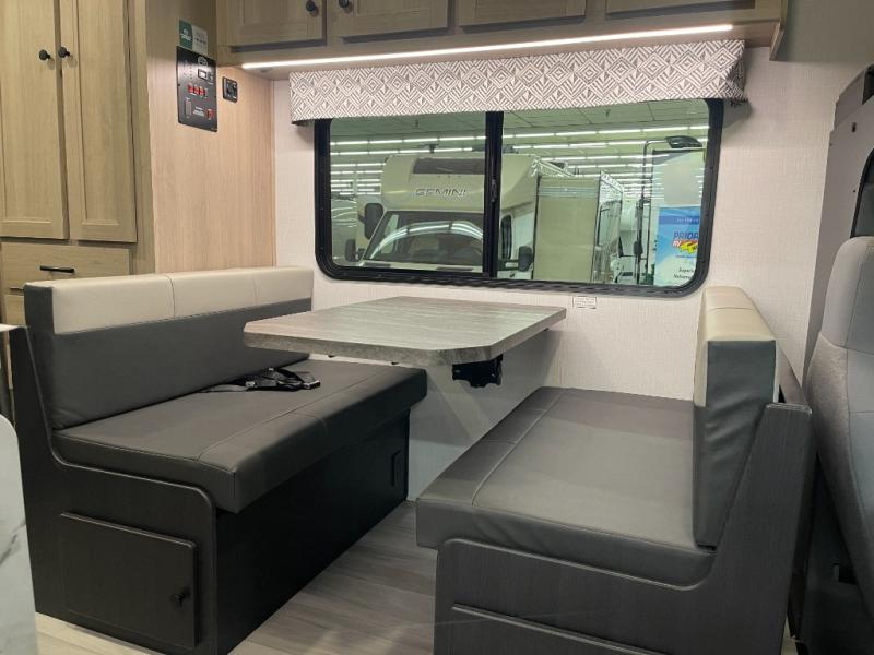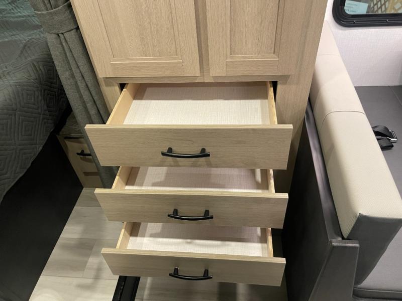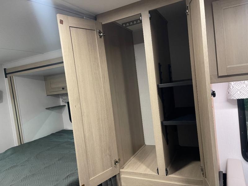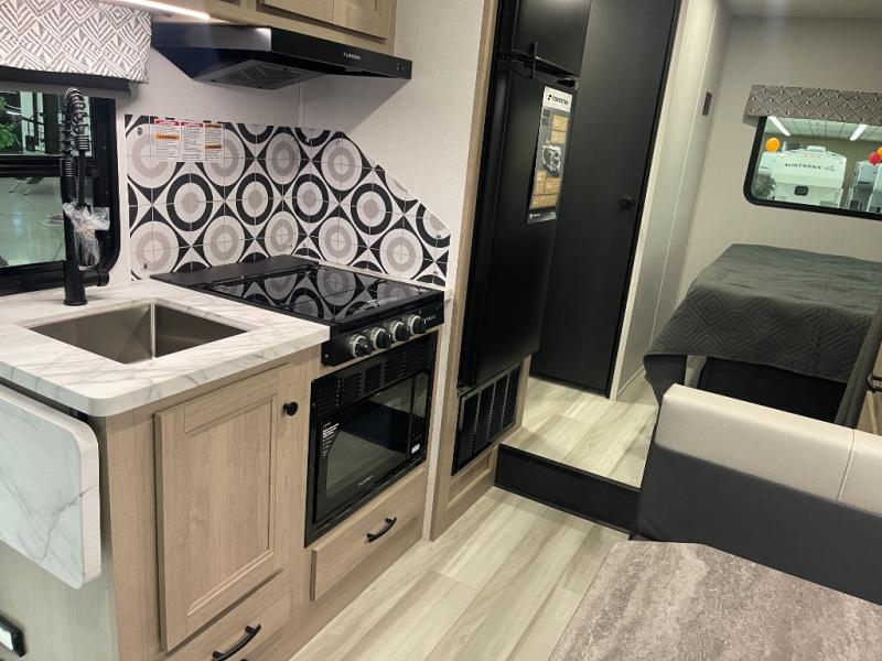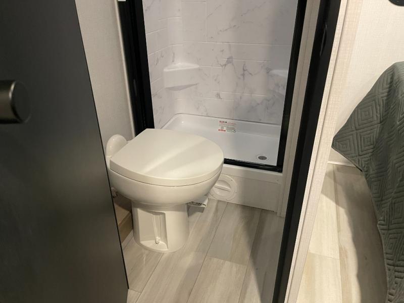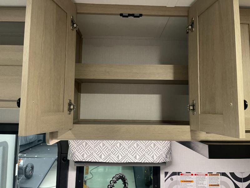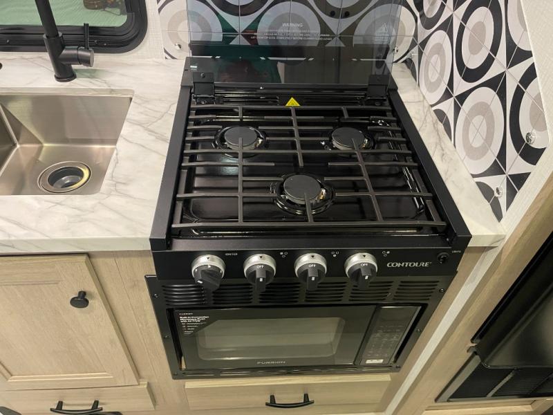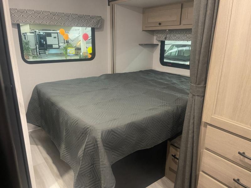 Enjoy trips near and far in this single slide out coach. The kitchen provides a 10.7 cu. ft. 12V refrigerator to store the cold items, a convection microwave and a recessed three-burner range to whip up meals. The private toilet and shower give you a place to get cleaned up, and the bathroom sink is just outside the door. This model includes a queen bed slide out with a wedge mattress, and there is a cab-over bunk for your guests. You can spend your evenings playing cards at the booth dinette, or head outdoors to relax under the 14' power awning with LED lights!