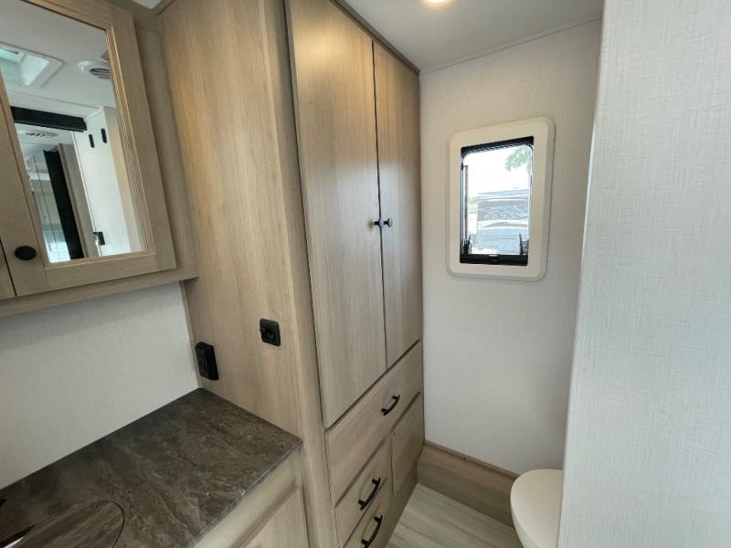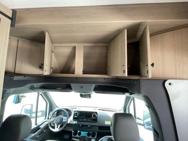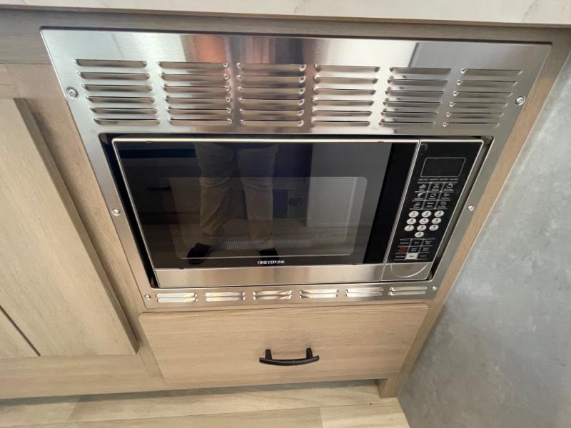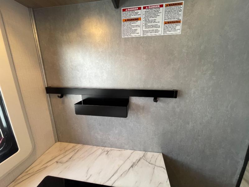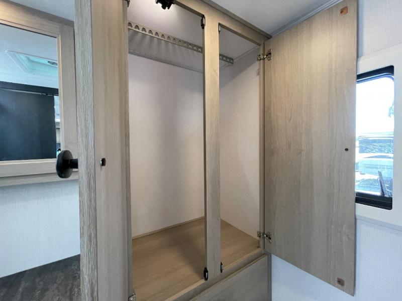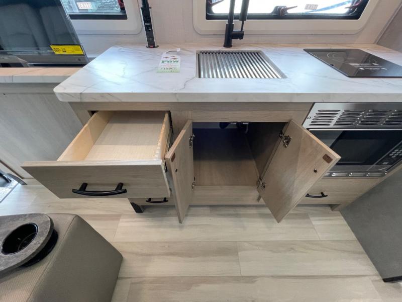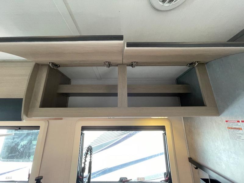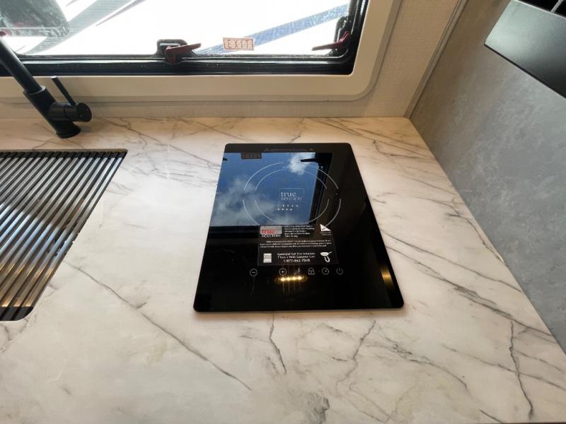 Trips across the state are made cozy in this single slide out coach for two! Once you've parked for the day, you can make lunch on the recessed induction cooktop or in the convection microwave. The sofa slide out provides a place to relax, and the Murphy bed can be folded out when you're ready for some shut-eye. You will appreciate how spacious the full rear bath is, and there is a wardrobe plus a linen closet here for ample storage. The cab-over bunk is only available with the Trekker Cap option; see dealer for more details.