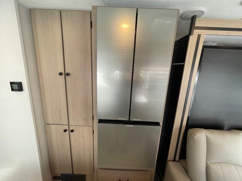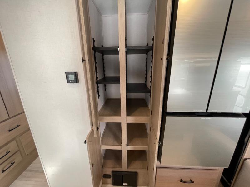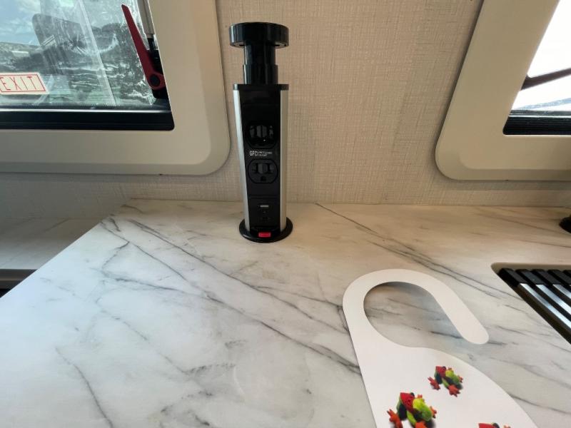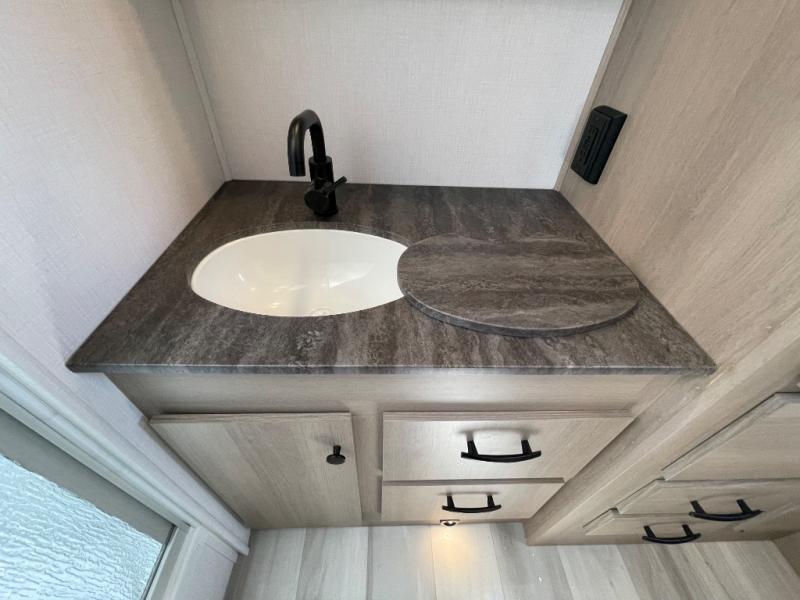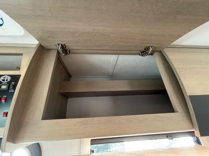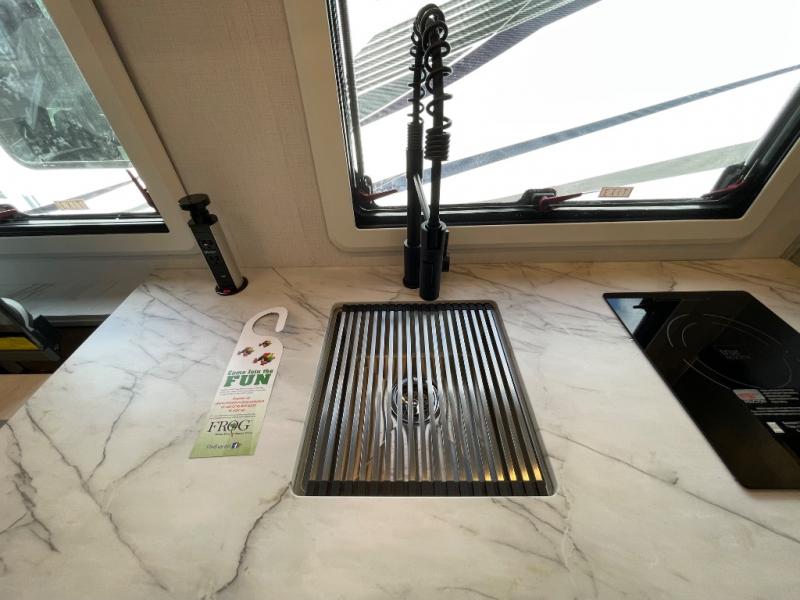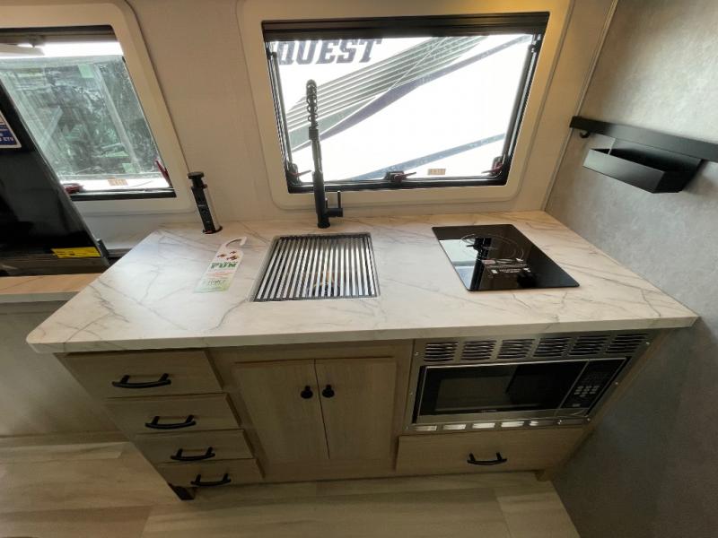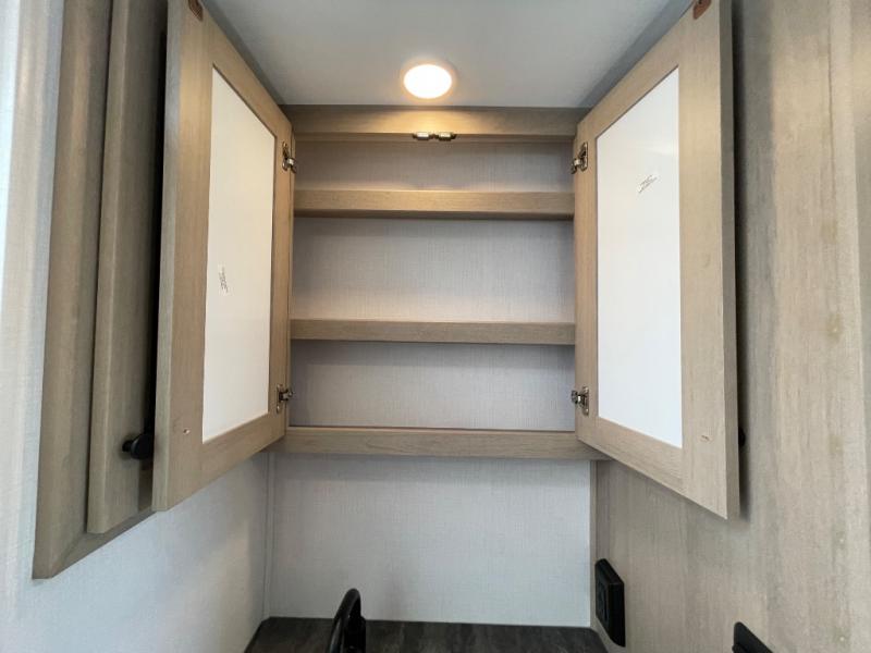 Trips across the state are made cozy in this single slide out coach for two! Once you've parked for the day, you can make lunch on the recessed induction cooktop or in the convection microwave. The sofa slide out provides a place to relax, and the Murphy bed can be folded out when you're ready for some shut-eye. You will appreciate how spacious the full rear bath is, and there is a wardrobe plus a linen closet here for ample storage. The cab-over bunk is only available with the Trekker Cap option; see dealer for more details.