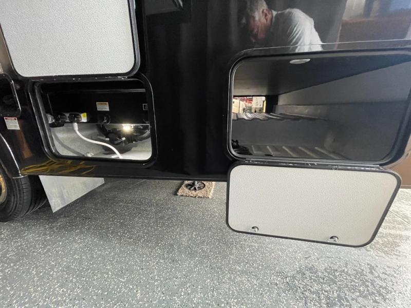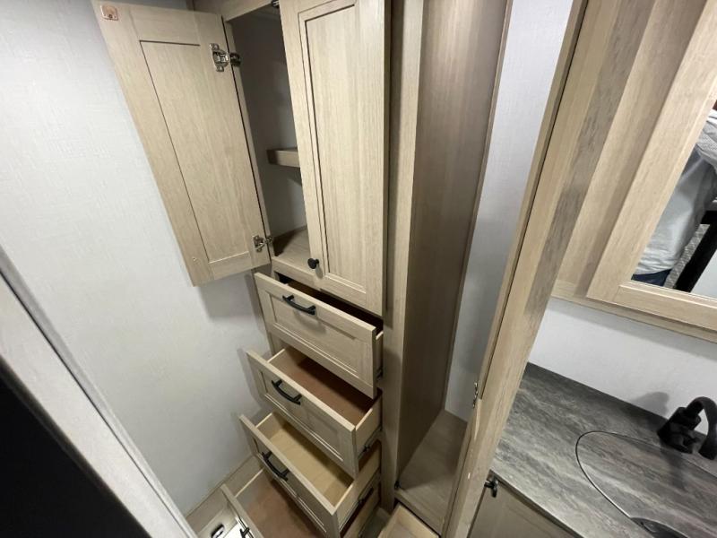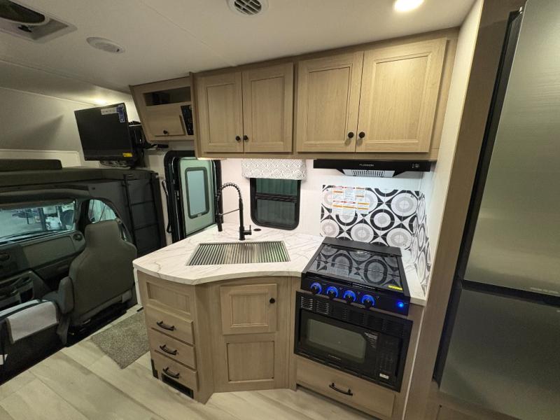 You will feel right at home traveling in this motorhome! The full rear bathroom has a 24" x 36" shower to freshen up in, plus storage space and a private toilet so you both can use this room at once. Inside the bedroom is a 60" x 74" queen bed slide with a wedge mattress for more space, and a 12V TV for movies in bed. Prepare your best meals with the three-burner cooktop and the 10.7 cu. ft. 12V refrigerator or throw some leftovers in the undermount 1.3 cu. ft. convection microwave, then enjoy it at the U-shaped dinette slide. The 60" x 80" bunk over cab mat offers a comfortable place to sleep but if you don't need the extra sleeping space, you can switch it out for the optional Trekker cap with a built-in entertainment center, plus there is an optional outside 12V TV to add!
