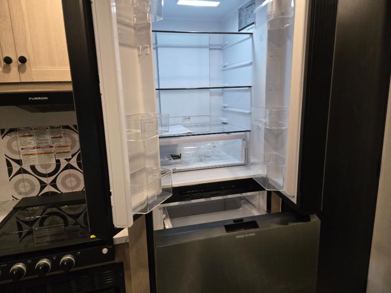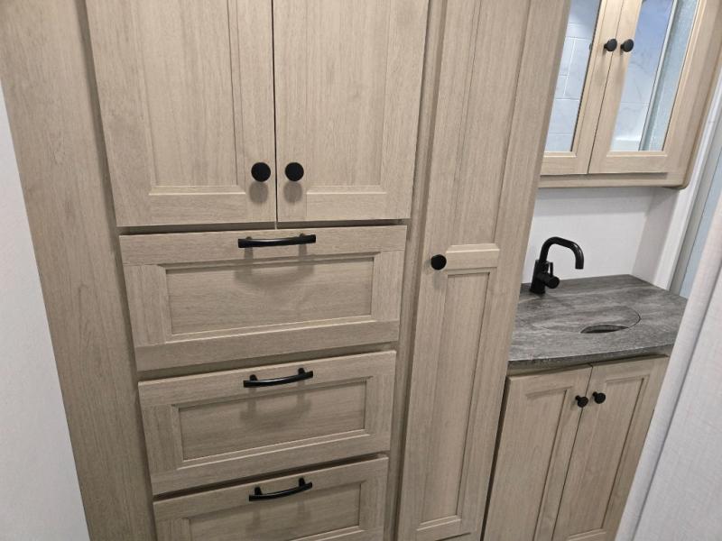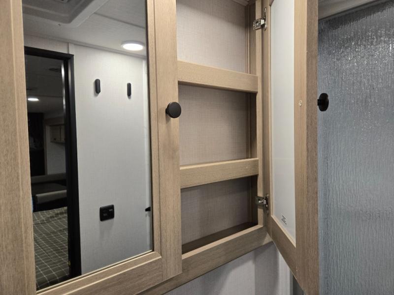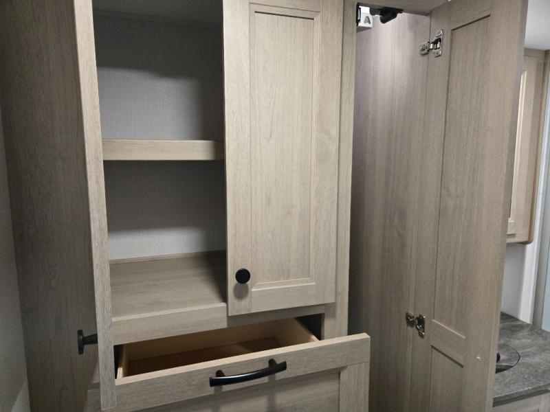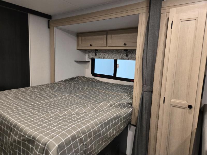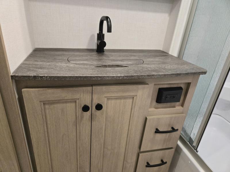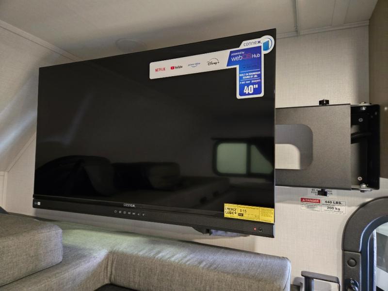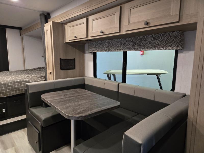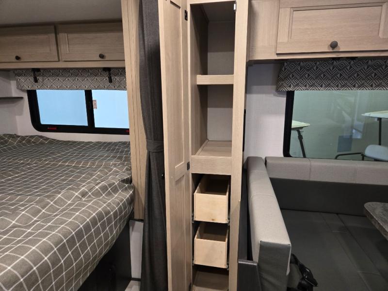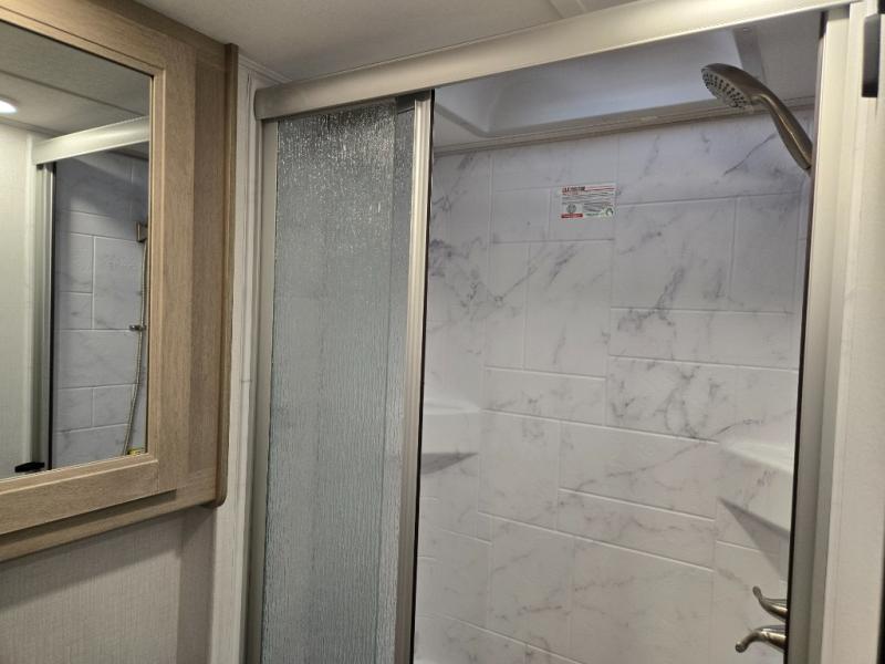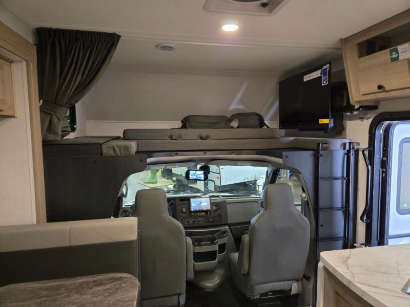 You will feel right at home traveling in this motorhome! The full rear bathroom has a 24" x 36" shower to freshen up in, plus storage space and a private toilet so you both can use this room at once. Inside the bedroom is a 60" x 74" queen bed slide with a wedge mattress for more space, and a 12V TV for movies in bed. Prepare your best meals with the three-burner cooktop and the 10.7 cu. ft. 12V refrigerator or throw some leftovers in the undermount 1.3 cu. ft. convection microwave, then enjoy it at the U-shaped dinette slide. The 60" x 80" bunk over cab mat offers a comfortable place to sleep but if you don't need the extra sleeping space, you can switch it out for the optional Trekker cap with a built-in entertainment center, plus there is an optional outside 12V TV to add!
