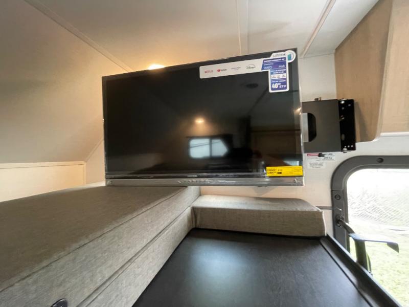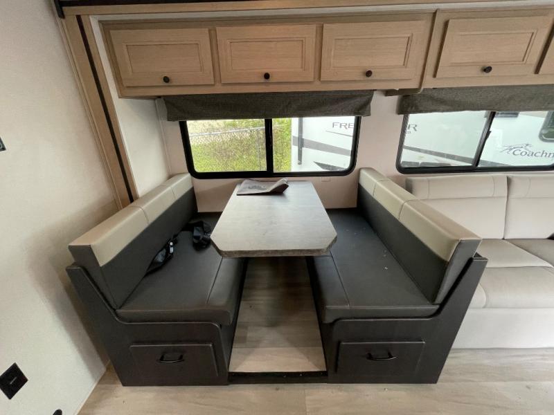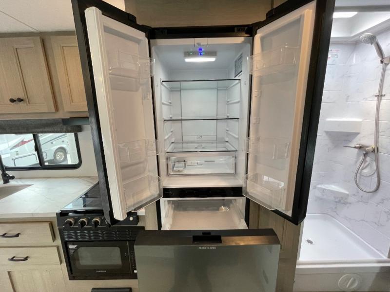 You and your favorite person will love this coach for many reasons including having your own private bedroom with a split bathroom, a walk-around queen bed, plus your own wardrobe. The split bathroom is pretty handy since one person can get ready in the private toilet and sink room while another is taking a shower. The kitchen offers a 10.7 cu. ft. 12V refrigerator, a convection microwave, a recessed three-burner range, soft touch self-closing drawer guides and a cordless 12V charging plate. You will have overhead cabinets and a pantry for storage. The slide out sofa and booth dinette offer a great place to relax and dine plus gives you more floor space. And the queen bunk over the cab will be a popular sleeping space for overnight guests.