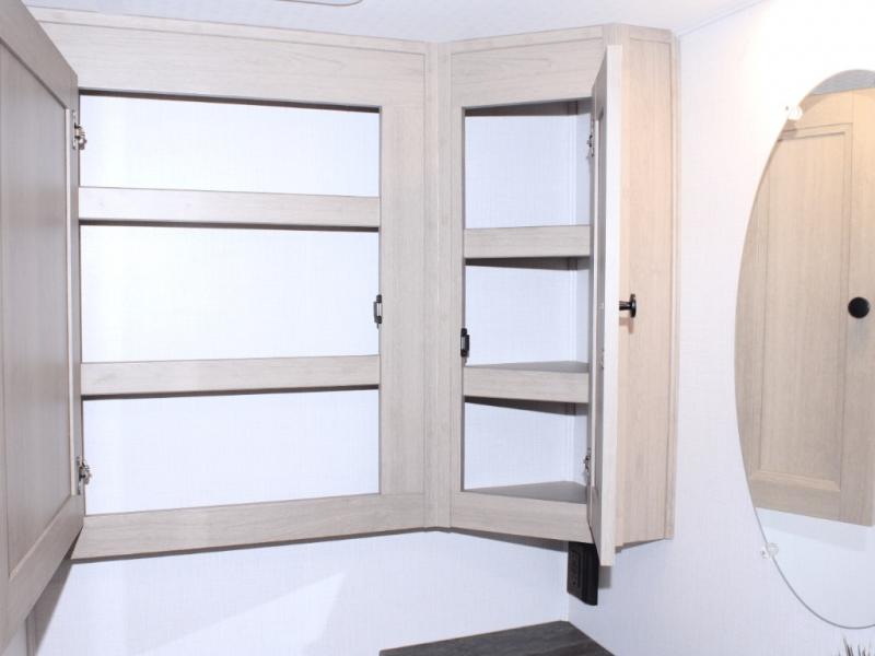 Full bathroom with shower, vanity, and storage