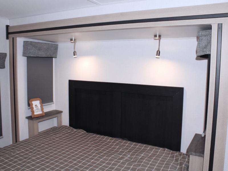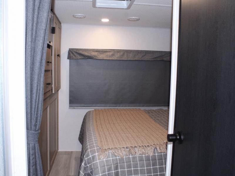 Spacious rear bedroom with queen bed and abundant storage