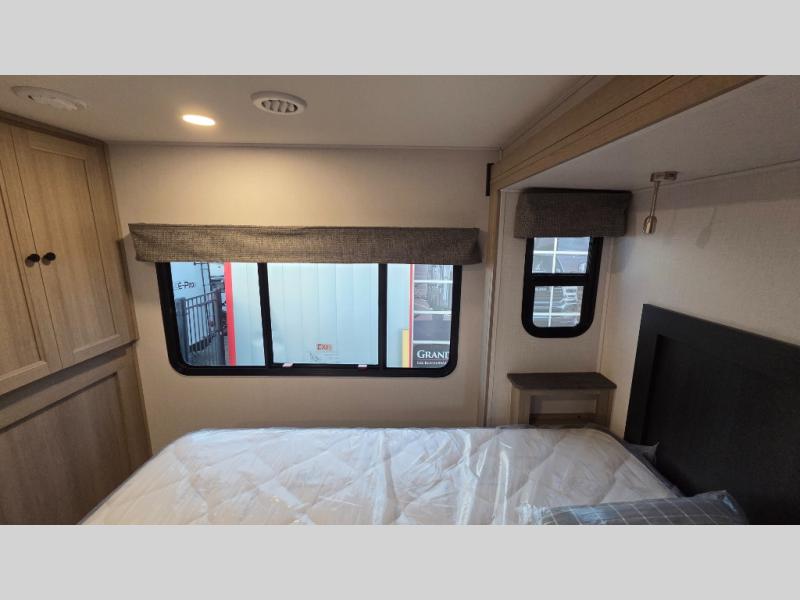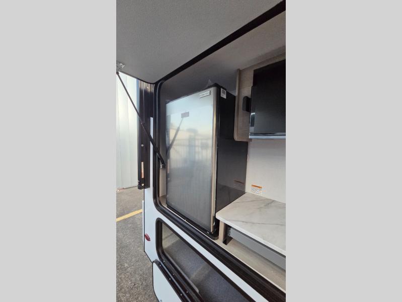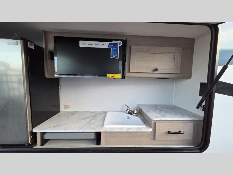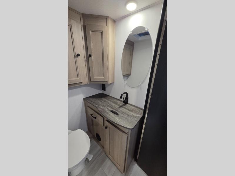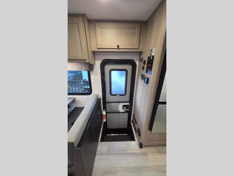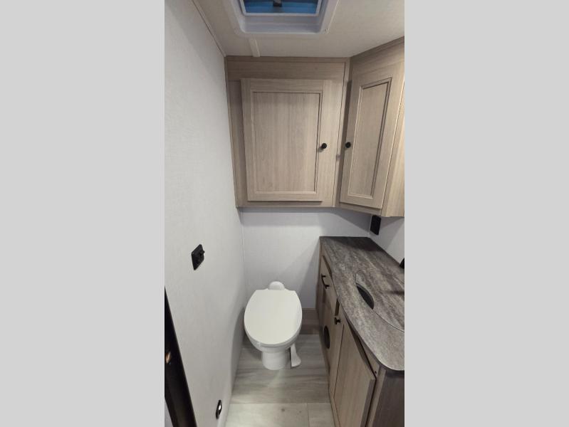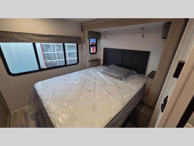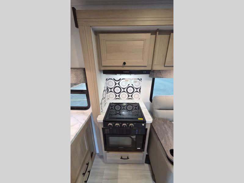 The chef will love cooking with this motorhome! They can choose to cook either indoors with the three burner cooktop and flip-up countertop or head to the outside kitchen to breathe in some fresh air while they grill up some juicy burgers on the cooktop. The separated bathroom makes it easy for one to freshen up in the 24" x 36" shower while another uses the private toilet and sink with a medicine cabinet above it. The rear private bedroom has a 60" x 74" queen bed slide with nightstands to set your glass of water and wardrobes on either side of a linen closet with a 12V TV for your entertainment. The booth dinette and sofa also offer comfortable sleeping spaces once converted, as well as the 60" x 80" bunk over cab mat which can be switched out for an optional Trekker cap with a built-in entertainment center!