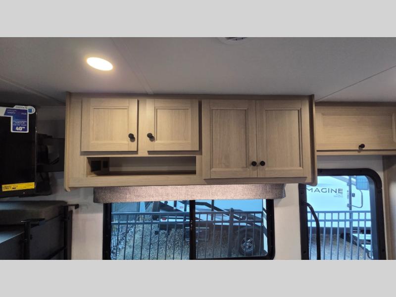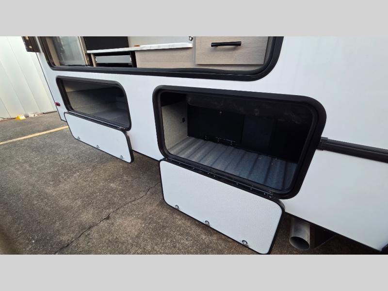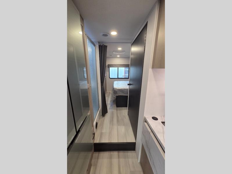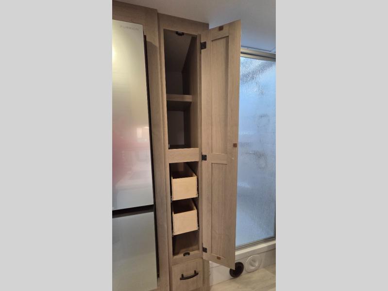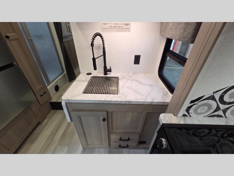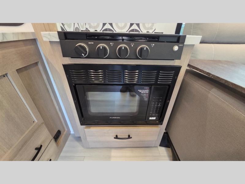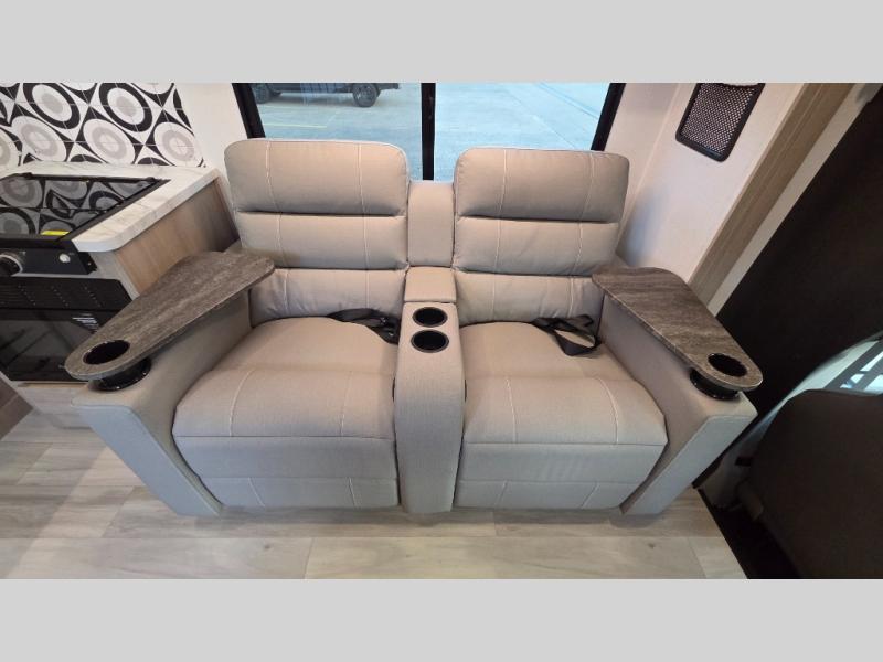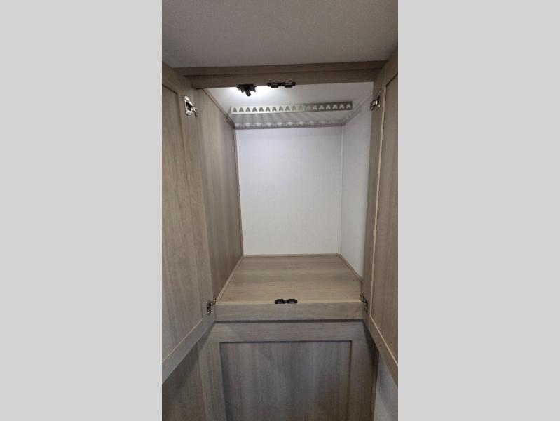 The chef will love cooking with this motorhome! They can choose to cook either indoors with the three burner cooktop and flip-up countertop or head to the outside kitchen to breathe in some fresh air while they grill up some juicy burgers on the cooktop. The separated bathroom makes it easy for one to freshen up in the 24" x 36" shower while another uses the private toilet and sink with a medicine cabinet above it. The rear private bedroom has a 60" x 74" queen bed slide with nightstands to set your glass of water and wardrobes on either side of a linen closet with a 12V TV for your entertainment. The booth dinette and sofa also offer comfortable sleeping spaces once converted, as well as the 60" x 80" bunk over cab mat which can be switched out for an optional Trekker cap with a built-in entertainment center!