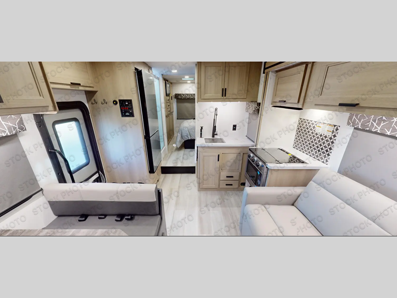 The chef will love cooking with this motorhome! They can choose to cook either indoors with the three burner cooktop and flip-up countertop or head to the outside kitchen to breathe in some fresh air while they grill up some juicy burgers on the cooktop. The separated bathroom makes it easy for one to freshen up in the 24" x 36" shower while another uses the private toilet and sink with a medicine cabinet above it. The rear private bedroom has a 60" x 74" queen bed slide with nightstands to set your glass of water and wardrobes on either side of a linen closet with a 12V TV for your entertainment. The booth dinette and sofa also offer comfortable sleeping spaces once converted, as well as the 60" x 80" bunk over cab mat which can be switched out for an optional Trekker cap with a built-in entertainment center!
