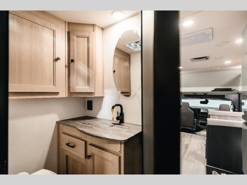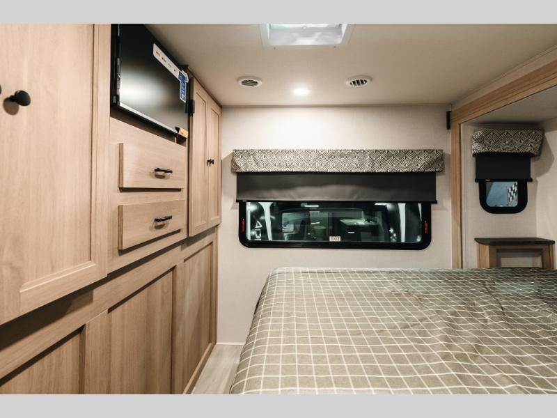 The chef will love cooking with this motorhome! They can choose to cook either indoors with the three burner cooktop and flip-up countertop or head to the outside kitchen to breathe in some fresh air while they grill up some juicy burgers on the cooktop. The separated bathroom makes it easy for one to freshen up in the 24" x 36" shower while another uses the private toilet and sink with a medicine cabinet above it. The rear private bedroom has a 60" x 74" queen bed slide with nightstands to set your glass of water and wardrobes on either side of a linen closet with a 12V TV for your entertainment. The booth dinette and sofa also offer comfortable sleeping spaces once converted, as well as the 60" x 80" bunk over cab mat which can be switched out for an optional Trekker cap with a built-in entertainment center!