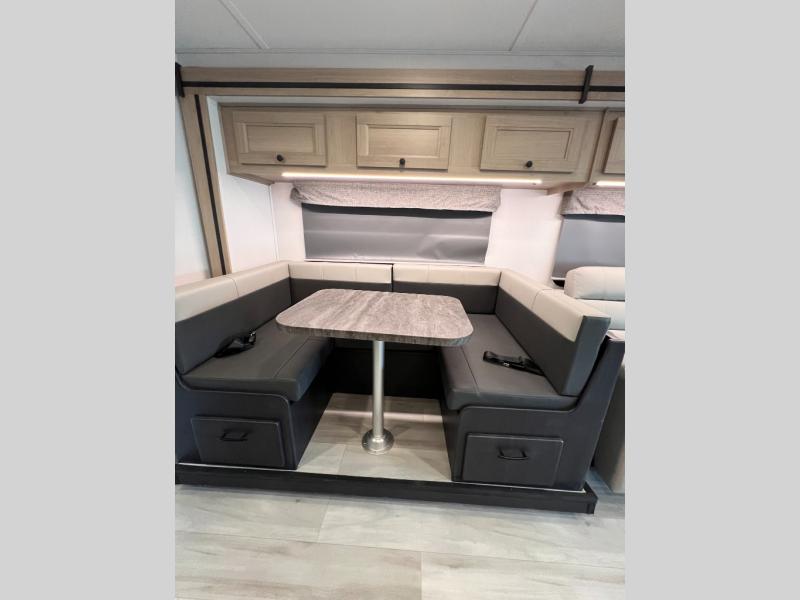The Forester 3011DS is designed to bring all the comforts of home on the road. With a spacious slide-out U-shaped dinette and sofa, you’ll have plenty of room to relax, eat, or sleep. The 60" x 80" bunk over cab adds extra sleeping space—or upgrade to the optional Trekker cap with built-in entertainment center for a sleek, modern touch. Whether you're heading out for the weekend or cross-country, this layout is perfect for couples, families, or solo adventurers.