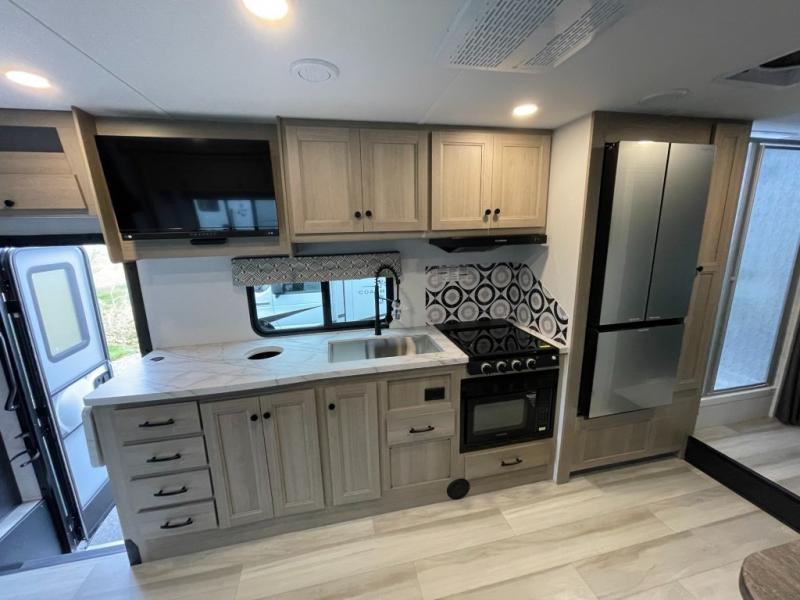 Escape the hustle and bustle of everyday life with this motorhome! It features a 60" x 80" bunk over cab mat which can be switched out for an optional Trekker cap with a built-in entertainment center. The sofa and U-shaped dinette slide offer comfortable places to enjoy meals, socialize, and even sleep once converted. Prepare your best meals with the 10.7 cu. ft. 12V refrigerator, the three burner cooktop, the flip-up countertop, and even the 1.3 cu. ft. undermount convection microwave. The separated bathroom has a 24" x 36" shower across from a toilet with a sink and countertop space, plus it leads directly into the rear private bedroom which has a 60" x 74" queen bed slide across from a linen/12V TV area with wardrobes on either side. You can even add an optional outside 12V TV and stay protected by the 15' 6" power awning!