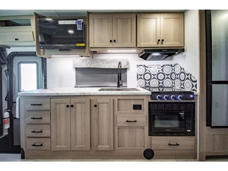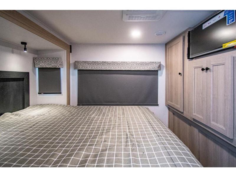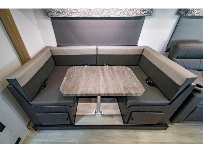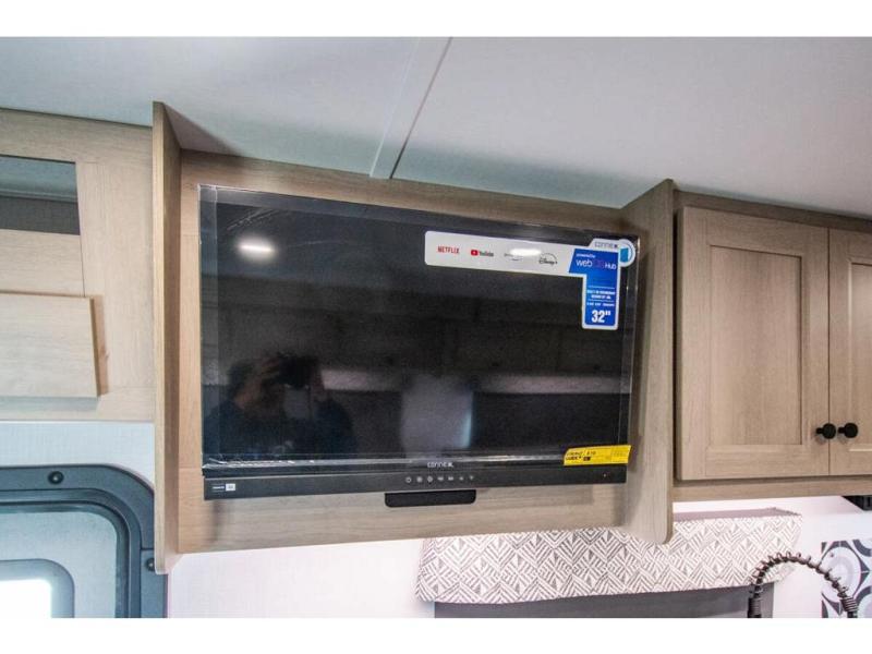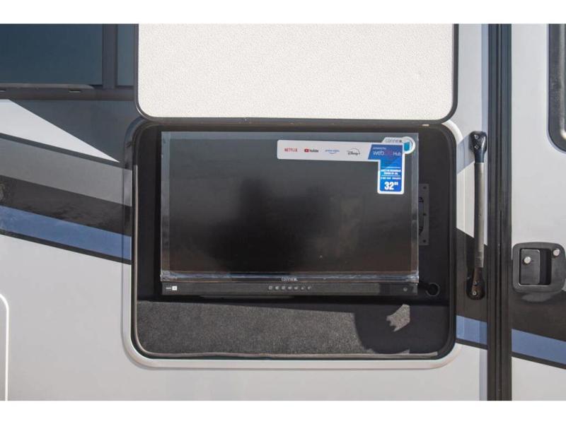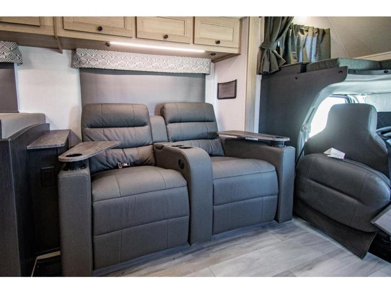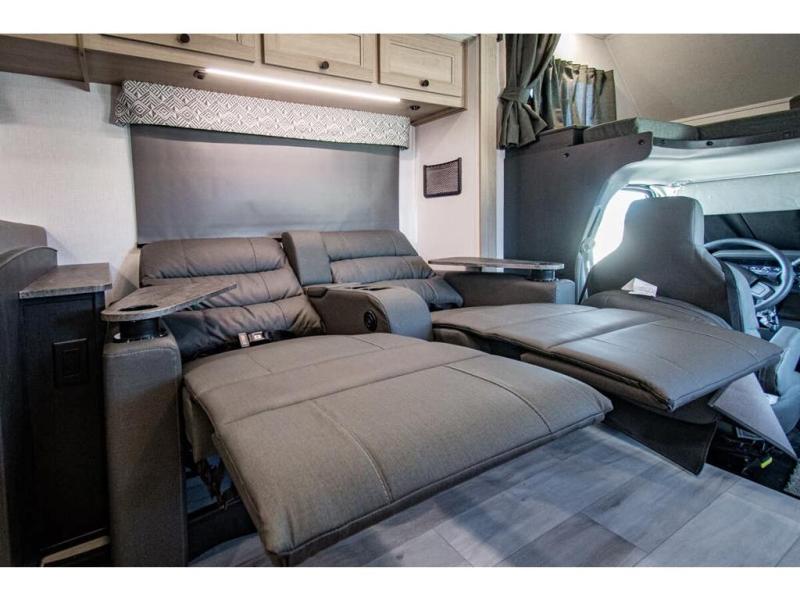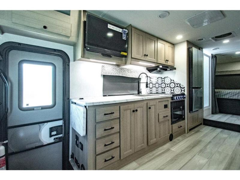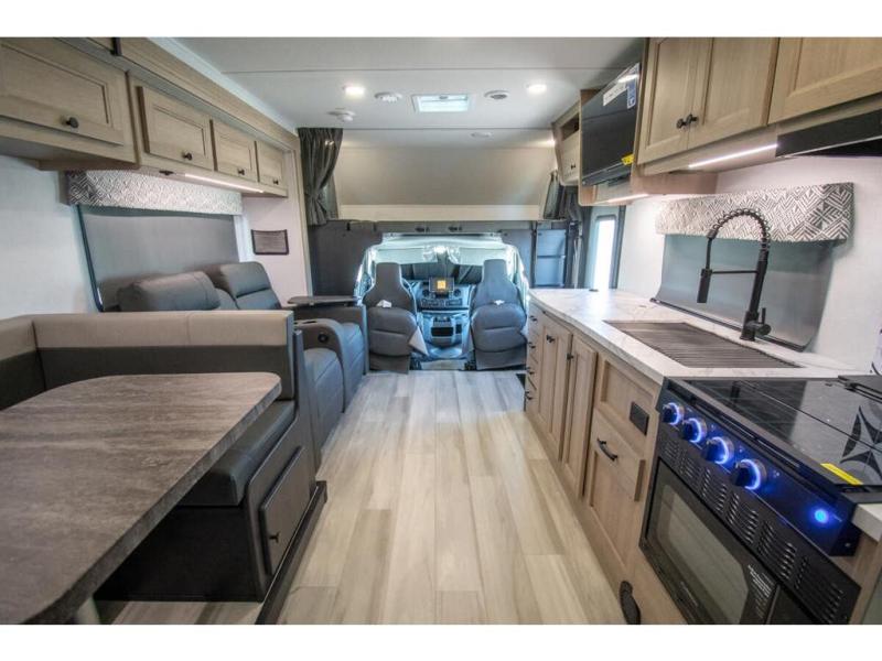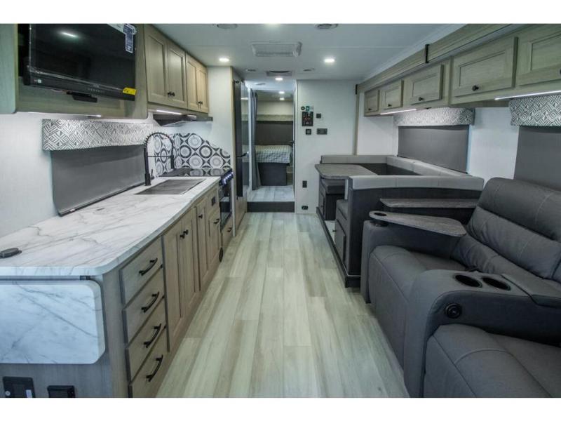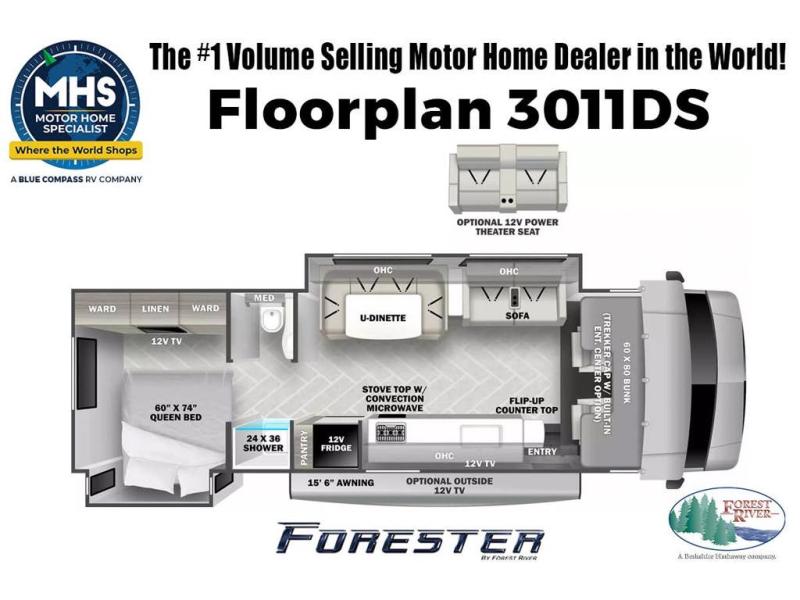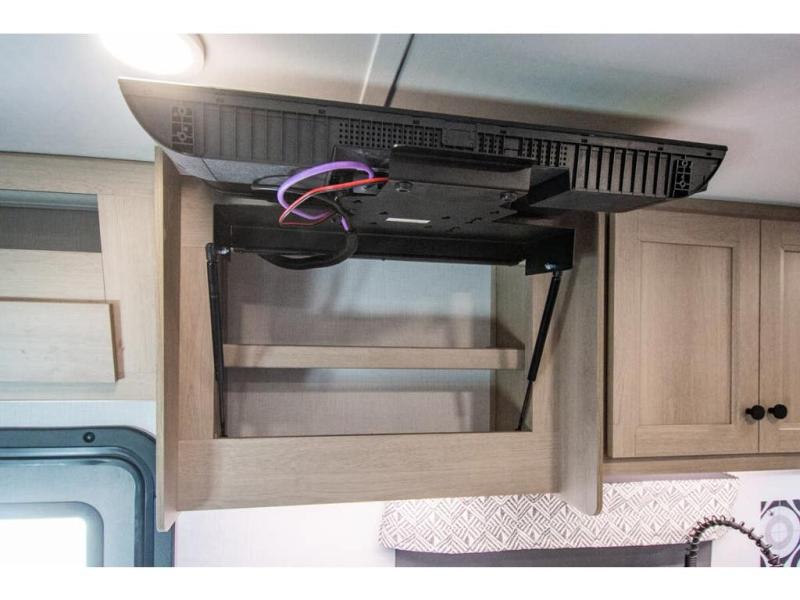 Escape the hustle and bustle of everyday life with this motorhome! It features a 60" x 80" bunk over cab mat which can be switched out for an optional Trekker cap with a built-in entertainment center. The sofa and U-shaped dinette slide offer comfortable places to enjoy meals, socialize, and even sleep once converted. Prepare your best meals with the 10.7 cu. ft. 12V refrigerator, the three burner cooktop, the flip-up countertop, and even the 1.3 cu. ft. undermount convection microwave. The separated bathroom has a 24" x 36" shower across from a toilet with a sink and countertop space, plus it leads directly into the rear private bedroom which has a 60" x 74" queen bed slide across from a linen/12V TV area with wardrobes on either side. You can even add an optional outside 12V TV and stay protected by the 15' 6" power awning!