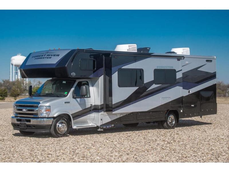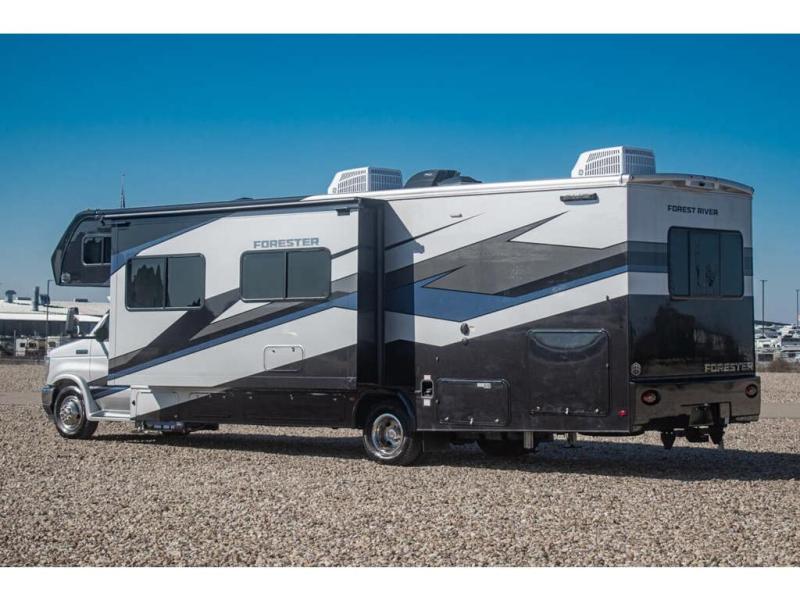 With any Forester Class C gas motorhome by Forest River, you will enjoy comfort at every turn! They offer a smooth ride with the EZ Ryde premium suspension system, and the ultra-leather captain's seats will ensure comfort wherever you go. There are heated, enclosed holding tanks and valves plus block foam insulation to enjoy four-seasons camping, and the gel coat exterior fiberglass is slick and easy to keep clean. A keyless entry comes standard for your convenience, along with a color back-up camera and side view cameras with a 3-way monitor for added safety when parking. The Forester motorhomes also include a Maxx Air multi-speed power fan with a cover, a shower skylight, a cordless 12V charging plate, plus black out roller shades for privacy any time.