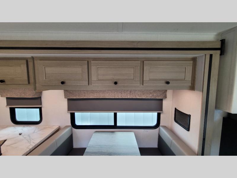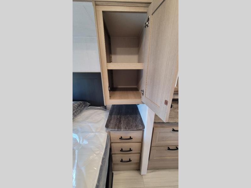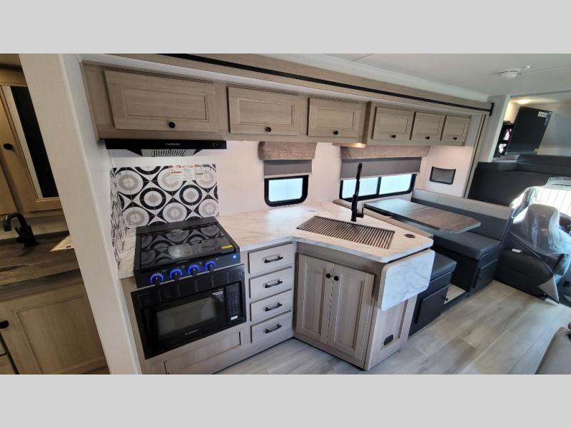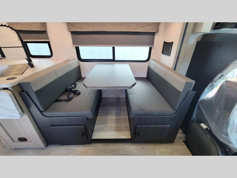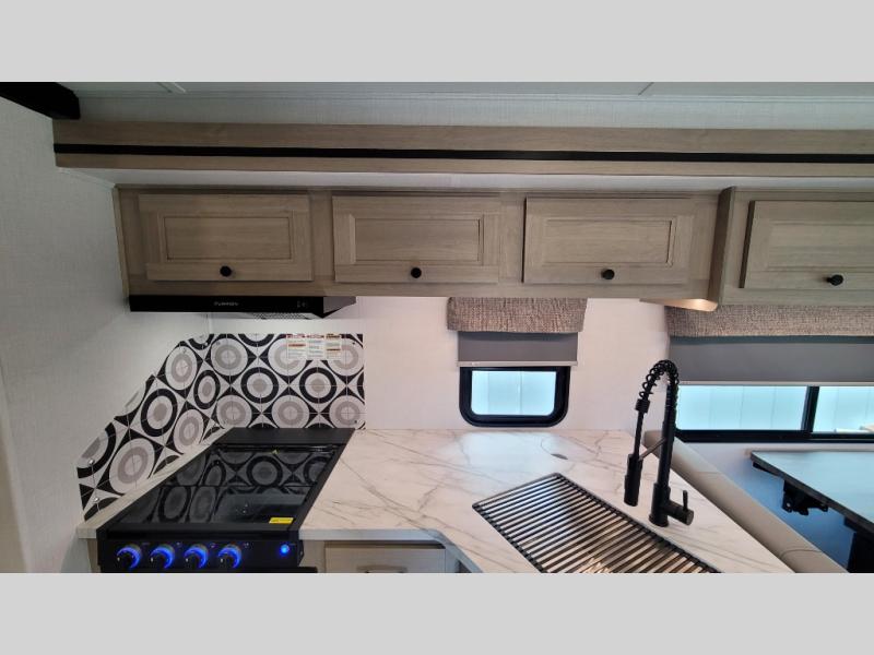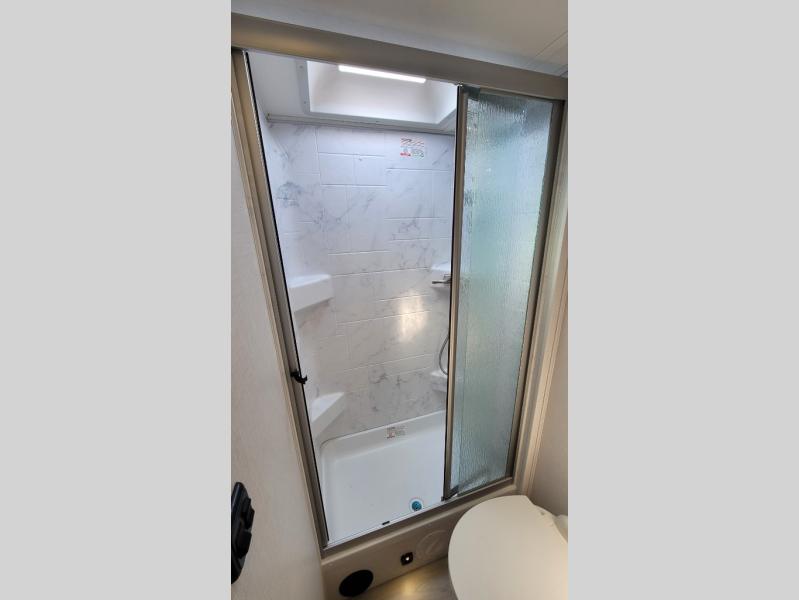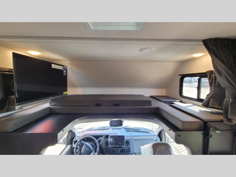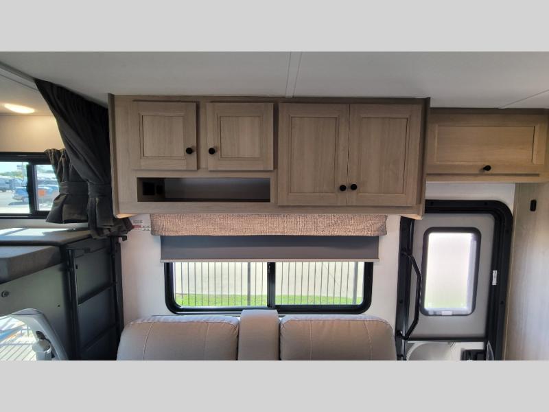 Start traveling in true luxury with this motorhome! The rear private bedroom has a queen bed to lay your head at night, a closet, and wardrobes on either side of the 12V TV. It also leads into the separated bathroom which has a 24" x 36" shower and toilet across from a sink with a medicine cabinet above it. The undermount 1.3 cu. ft. convection microwave will come in handy on those nights when you don't feel like cooking and the flip-up countertop will make your meal prepping easier. You can enjoy your meals at the booth dinette and lay down on the sofa to catch up on your book. The 60" x 80" bunk over cab mat offers a comfortable sleeping space but can be switched out for the optional Trekker cap with a built-in entertainment center!