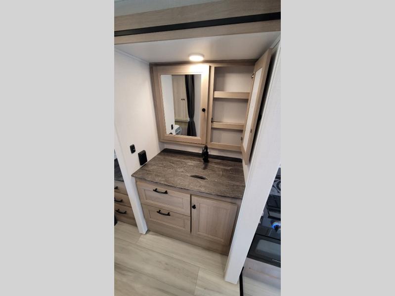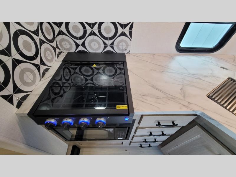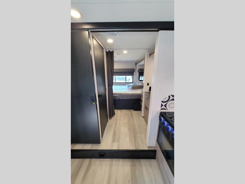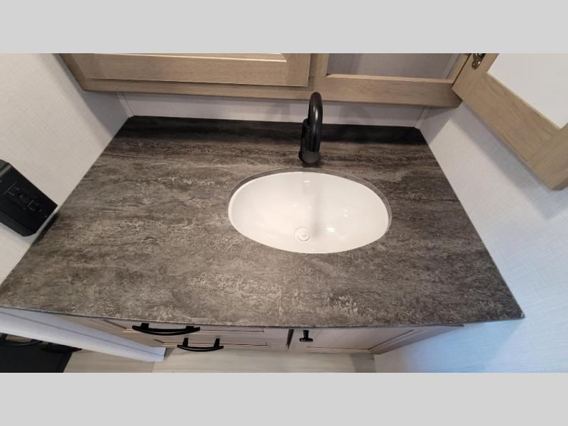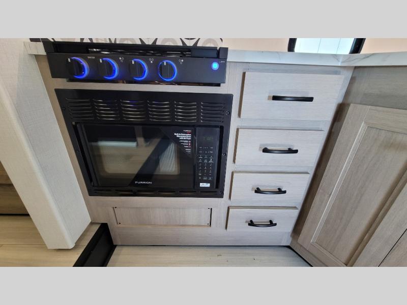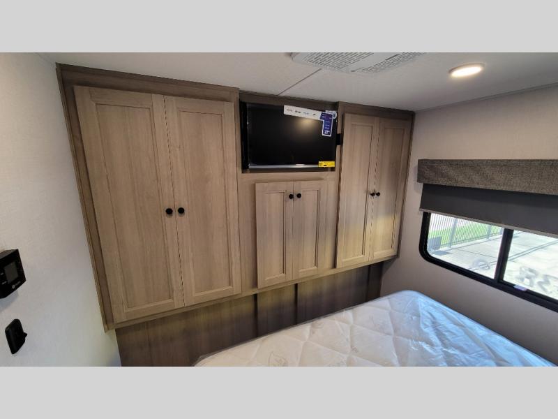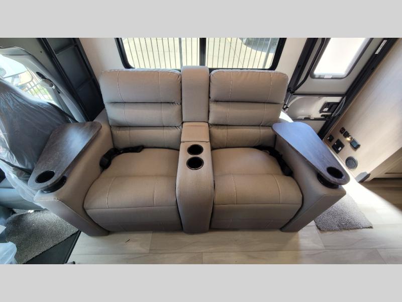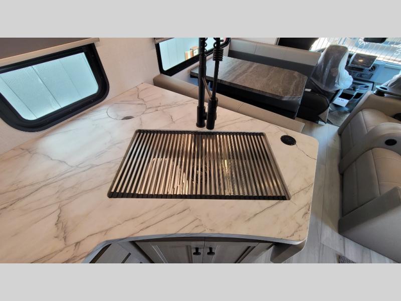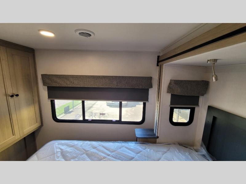 Start traveling in true luxury with this motorhome! The rear private bedroom has a queen bed to lay your head at night, a closet, and wardrobes on either side of the 12V TV. It also leads into the separated bathroom which has a 24" x 36" shower and toilet across from a sink with a medicine cabinet above it. The undermount 1.3 cu. ft. convection microwave will come in handy on those nights when you don't feel like cooking and the flip-up countertop will make your meal prepping easier. You can enjoy your meals at the booth dinette and lay down on the sofa to catch up on your book. The 60" x 80" bunk over cab mat offers a comfortable sleeping space but can be switched out for the optional Trekker cap with a built-in entertainment center!
