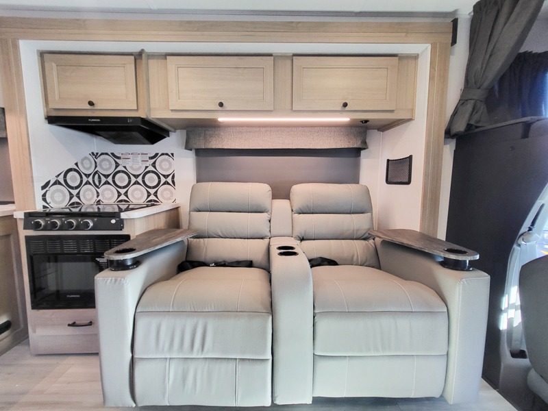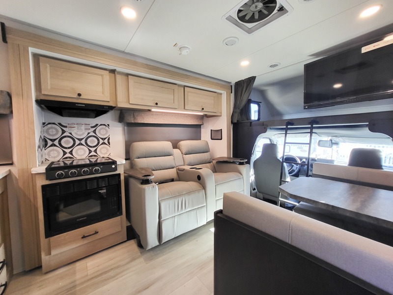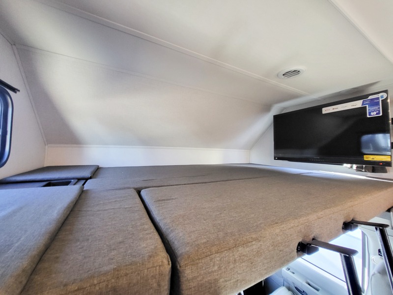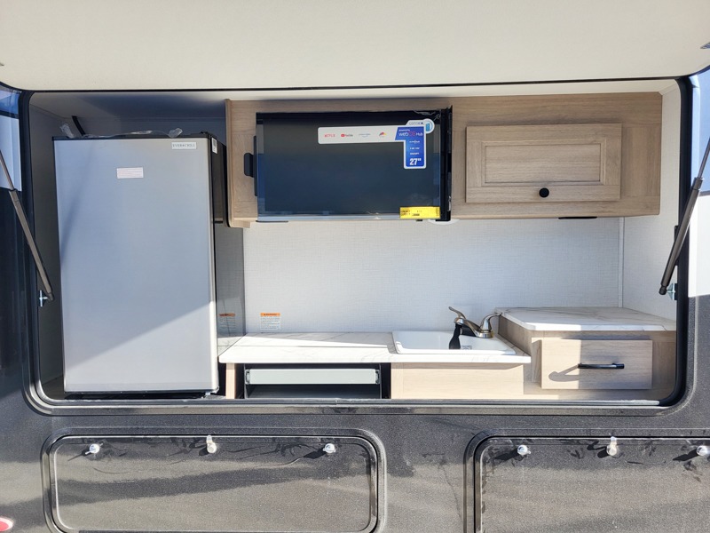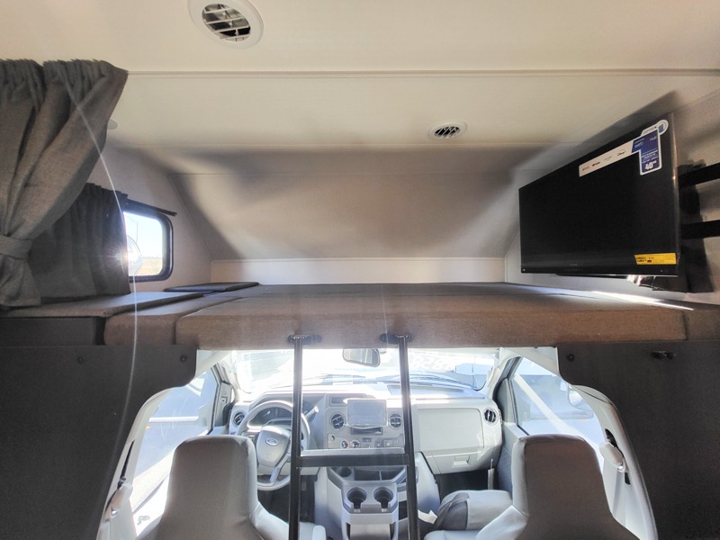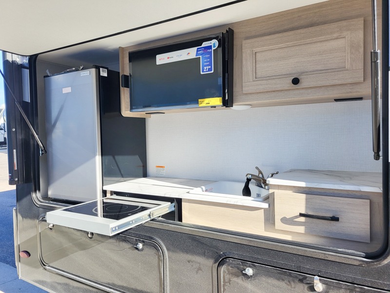 The chef will love cooking with this motorhome! They can choose to cook either indoors with the three burner cooktop and flip-up countertop or head to the outside kitchen to breathe in some fresh air while they grill up some juicy burgers on the cooktop. The separated bathroom makes it easy for one to freshen up in the 24" x 36" shower while another uses the private toilet and sink with a medicine cabinet above it. The rear private bedroom has a 60" x 74" queen bed slide with nightstands to set your glass of water and wardrobes on either side of a linen closet with a 12V TV for your entertainment. The booth dinette and sofa also offer comfortable sleeping spaces once converted, as well as the 60" x 80" bunk over cab mat which can be switched out for an optional Trekker cap with a built-in entertainment center!