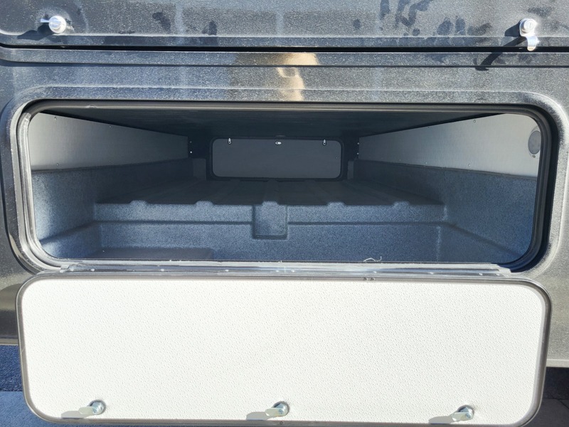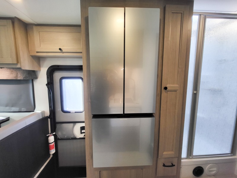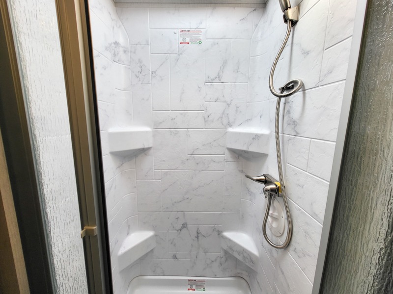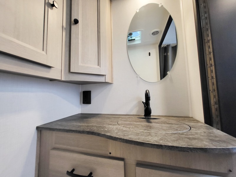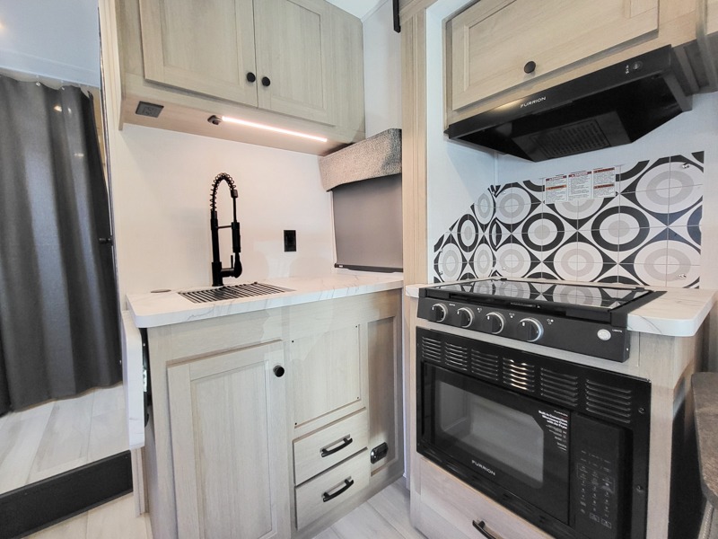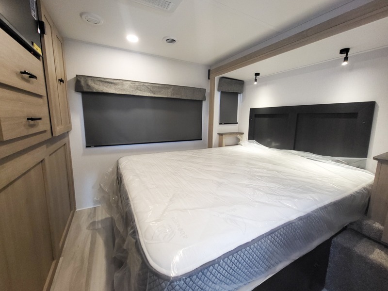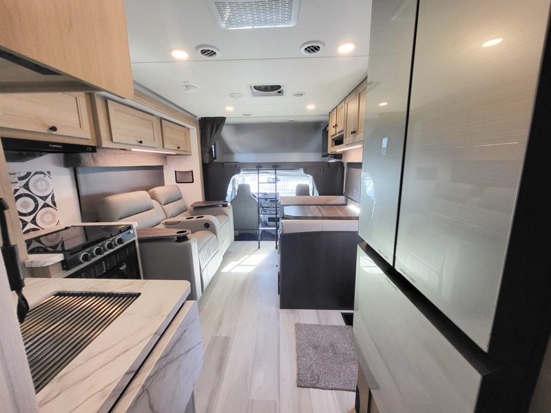 The chef will love cooking with this motorhome! They can choose to cook either indoors with the three burner cooktop and flip-up countertop or head to the outside kitchen to breathe in some fresh air while they grill up some juicy burgers on the cooktop. The separated bathroom makes it easy for one to freshen up in the 24" x 36" shower while another uses the private toilet and sink with a medicine cabinet above it. The rear private bedroom has a 60" x 74" queen bed slide with nightstands to set your glass of water and wardrobes on either side of a linen closet with a 12V TV for your entertainment. The booth dinette and sofa also offer comfortable sleeping spaces once converted, as well as the 60" x 80" bunk over cab mat which can be switched out for an optional Trekker cap with a built-in entertainment center!