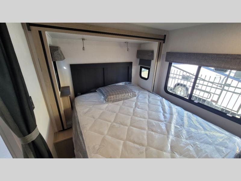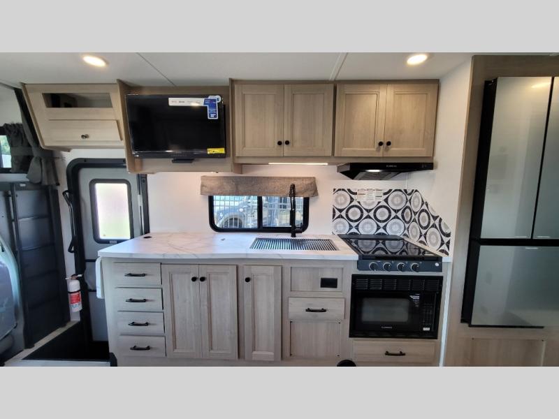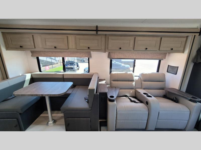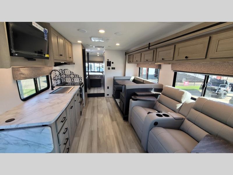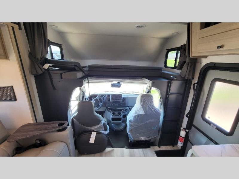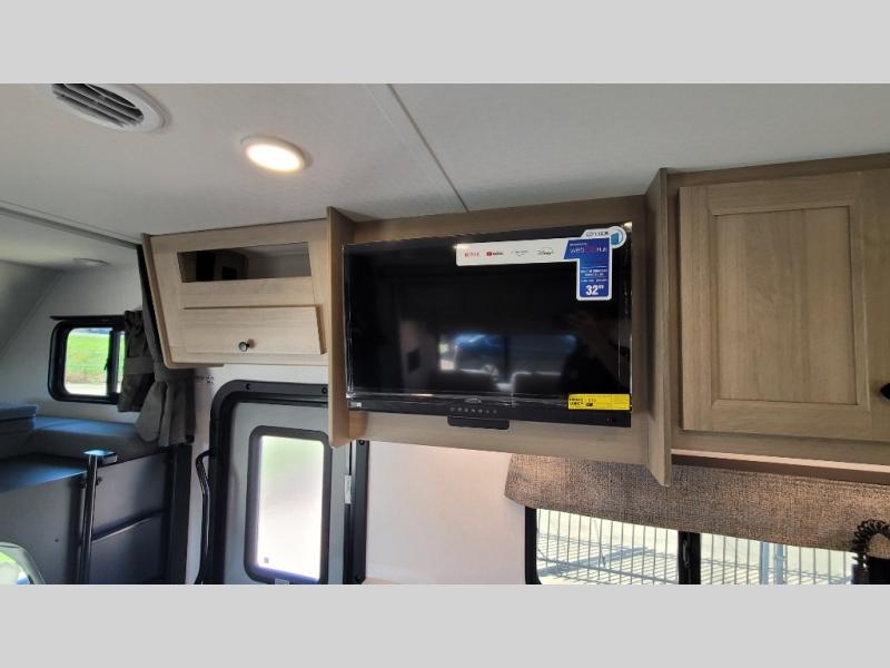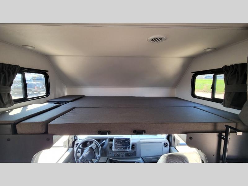 Escape the hustle and bustle of everyday life with this motorhome! It features a 60" x 80" bunk over cab mat which can be switched out for an optional Trekker cap with a built-in entertainment center. The sofa and U-shaped dinette slide offer comfortable places to enjoy meals, socialize, and even sleep once converted. Prepare your best meals with the 10.7 cu. ft. 12V refrigerator, the three burner cooktop, the flip-up countertop, and even the 1.3 cu. ft. undermount convection microwave. The separated bathroom has a 24" x 36" shower across from a toilet with a sink and countertop space, plus it leads directly into the rear private bedroom which has a 60" x 74" queen bed slide across from a linen/12V TV area with wardrobes on either side. You can even add an optional outside 12V TV and stay protected by the 15' 6" power awning!