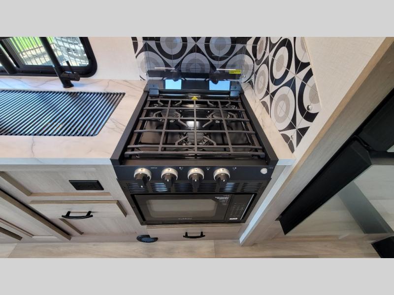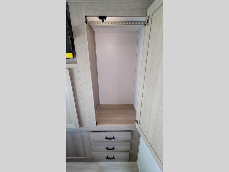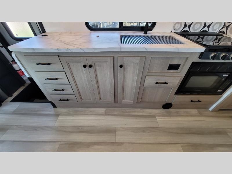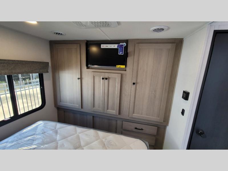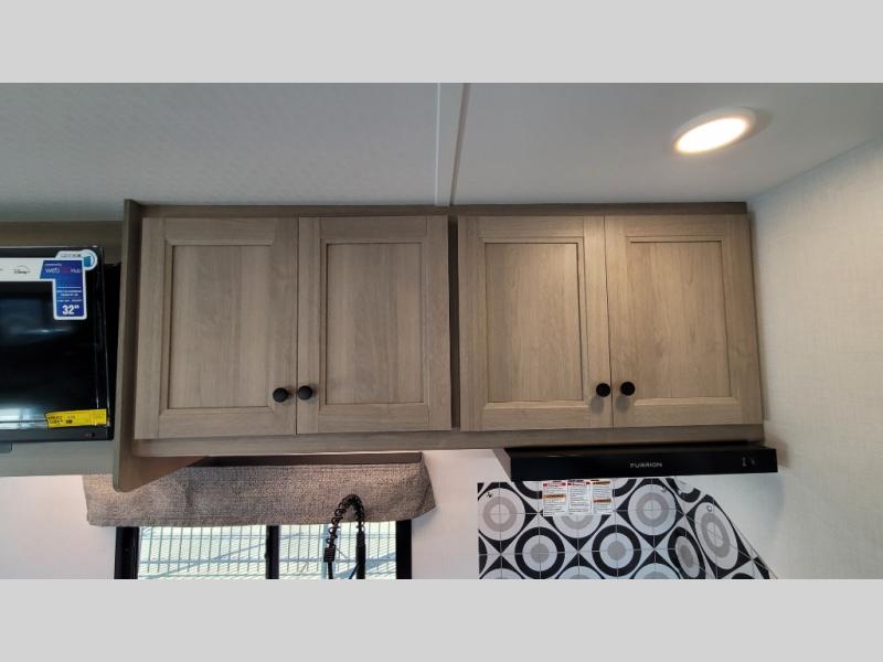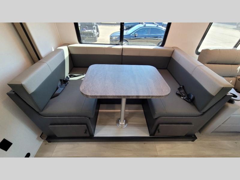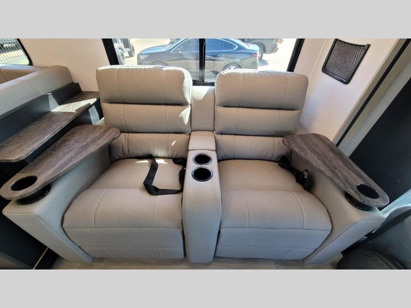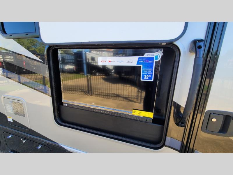 Escape the hustle and bustle of everyday life with this motorhome! It features a 60" x 80" bunk over cab mat which can be switched out for an optional Trekker cap with a built-in entertainment center. The sofa and U-shaped dinette slide offer comfortable places to enjoy meals, socialize, and even sleep once converted. Prepare your best meals with the 10.7 cu. ft. 12V refrigerator, the three burner cooktop, the flip-up countertop, and even the 1.3 cu. ft. undermount convection microwave. The separated bathroom has a 24" x 36" shower across from a toilet with a sink and countertop space, plus it leads directly into the rear private bedroom which has a 60" x 74" queen bed slide across from a linen/12V TV area with wardrobes on either side. You can even add an optional outside 12V TV and stay protected by the 15' 6" power awning!