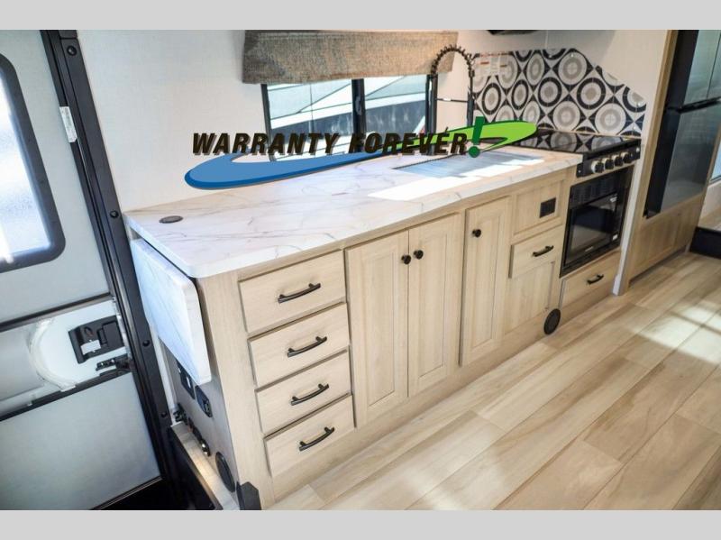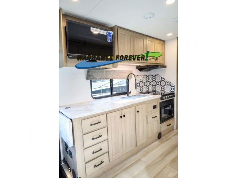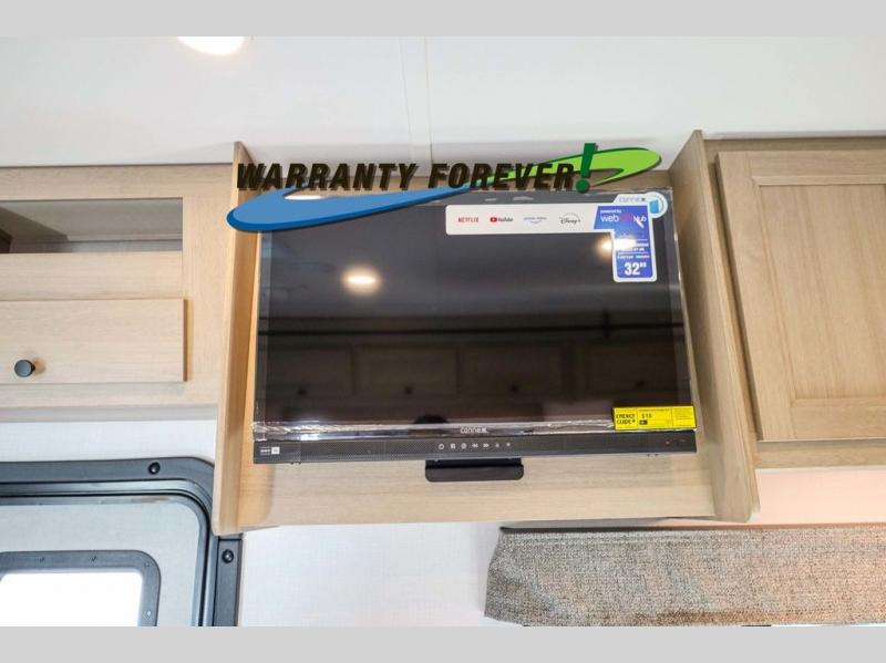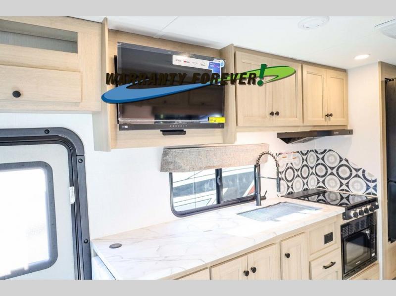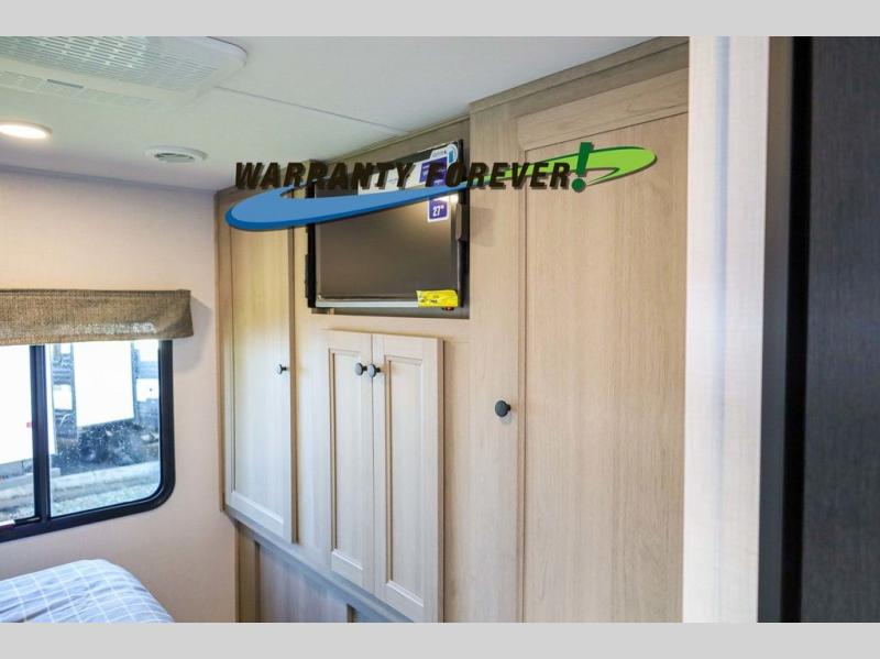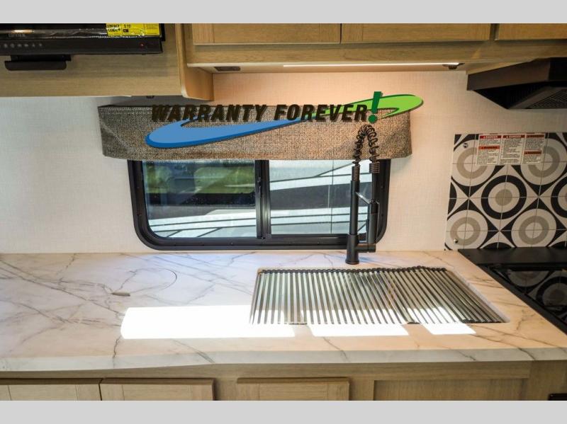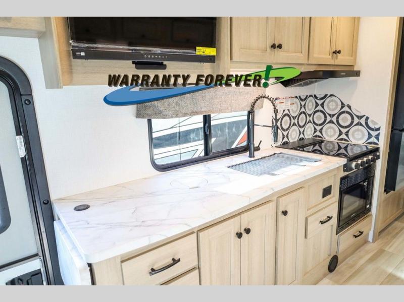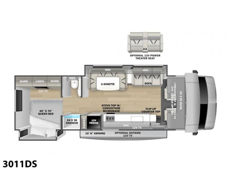 Escape the hustle and bustle of everyday life with this motorhome! It features a 60" x 80" bunk over cab mat which can be switched out for an optional Trekker cap with a built-in entertainment center. The sofa and U-shaped dinette slide offer comfortable places to enjoy meals, socialize, and even sleep once converted. Prepare your best meals with the 10.7 cu. ft. 12V refrigerator, the three burner cooktop, the flip-up countertop, and even the 1.3 cu. ft. undermount convection microwave. The separated bathroom has a 24" x 36" shower across from a toilet with a sink and countertop space, plus it leads directly into the rear private bedroom which has a 60" x 74" queen bed slide across from a linen/12V TV area with wardrobes on either side. You can even add an optional outside 12V TV and stay protected by the 15' 6" power awning!