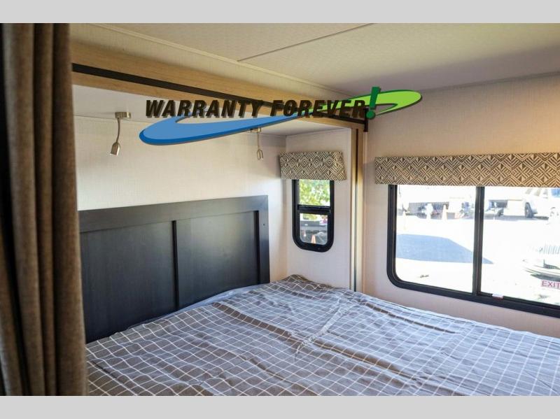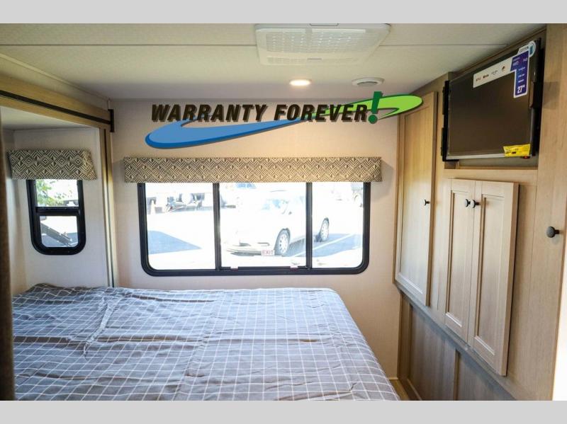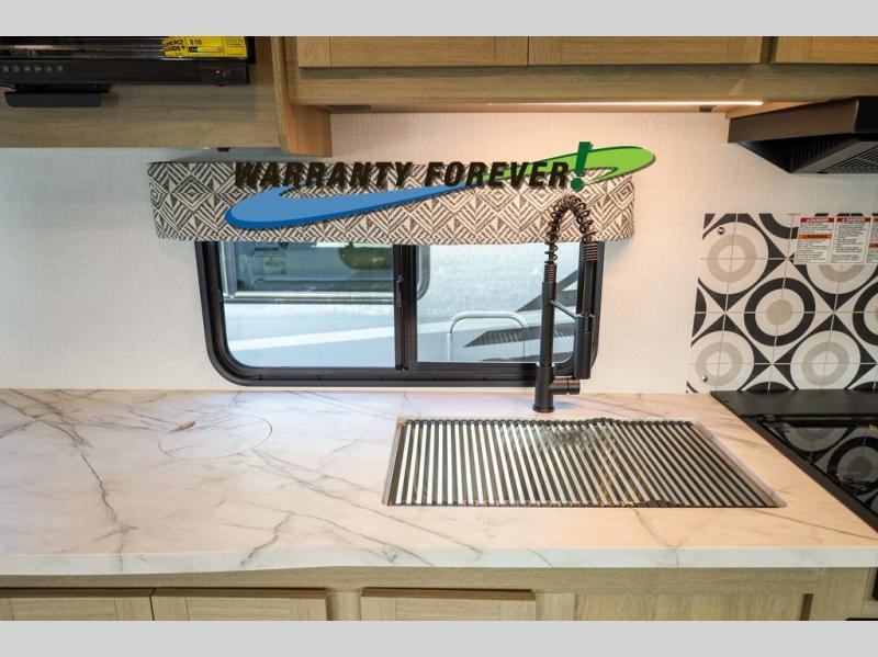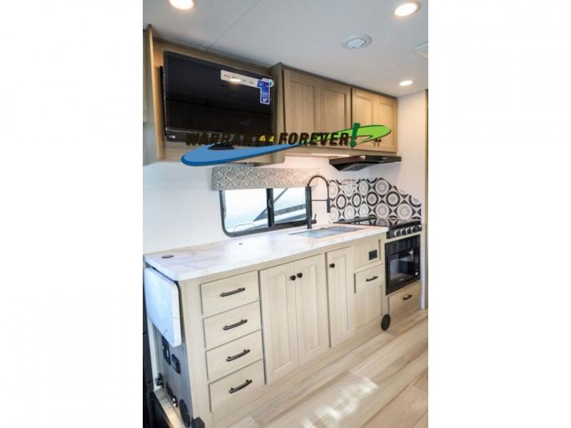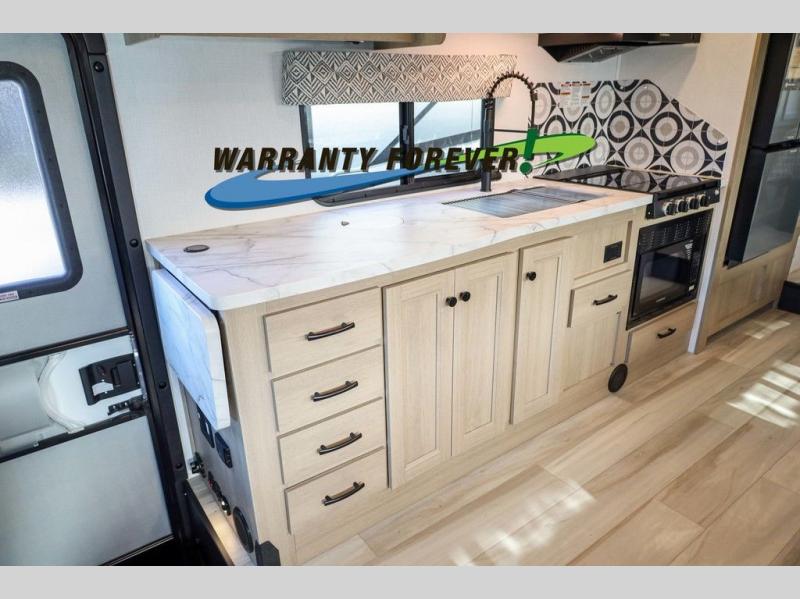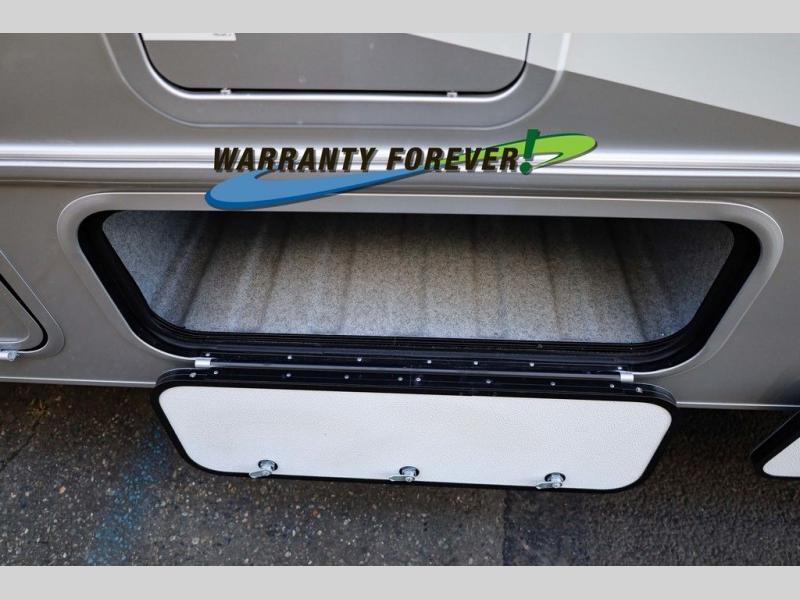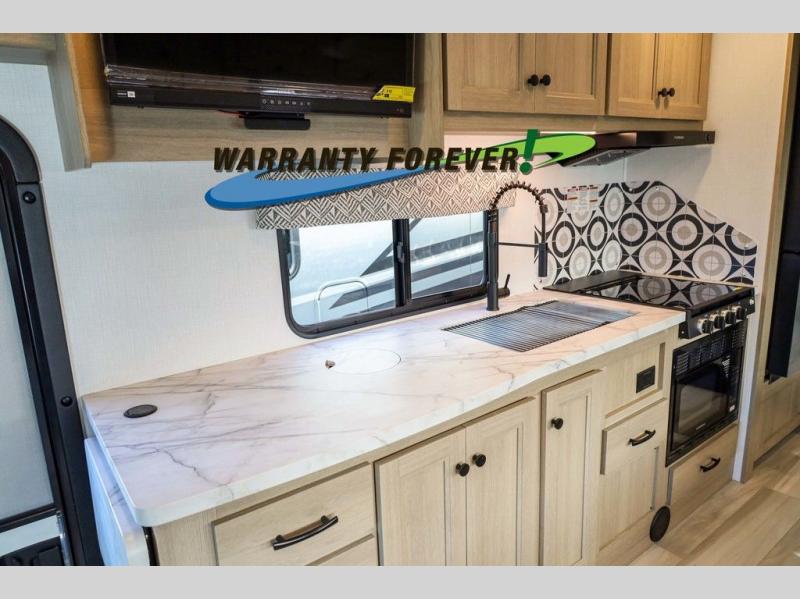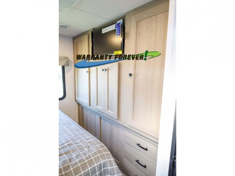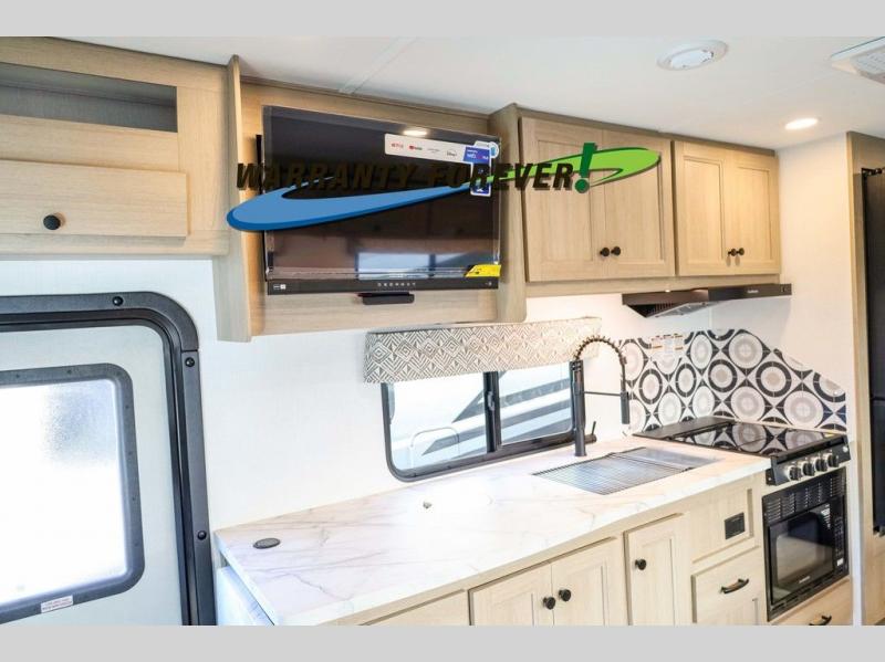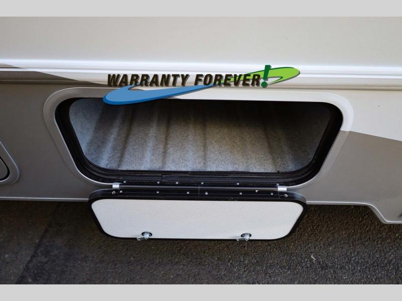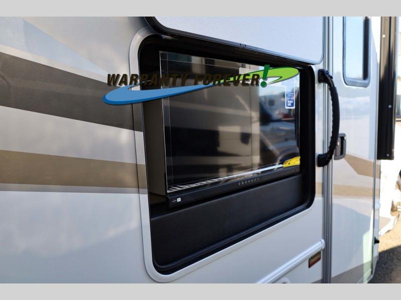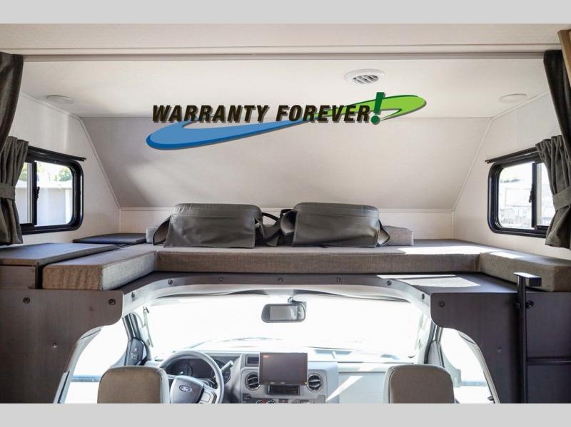 Escape the hustle and bustle of everyday life with this motorhome! It features a 60" x 80" bunk over cab mat which can be switched out for an optional Trekker cap with a built-in entertainment center. The sofa and U-shaped dinette slide offer comfortable places to enjoy meals, socialize, and even sleep once converted. Prepare your best meals with the 10.7 cu. ft. 12V refrigerator, the three burner cooktop, the flip-up countertop, and even the 1.3 cu. ft. undermount convection microwave. The separated bathroom has a 24" x 36" shower across from a toilet with a sink and countertop space, plus it leads directly into the rear private bedroom which has a 60" x 74" queen bed slide across from a linen/12V TV area with wardrobes on either side. You can even add an optional outside 12V TV and stay protected by the 15' 6" power awning!
