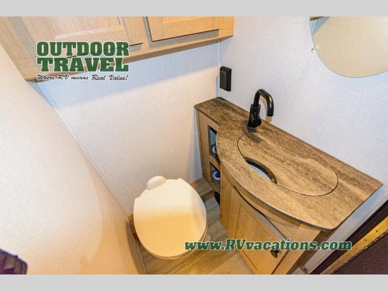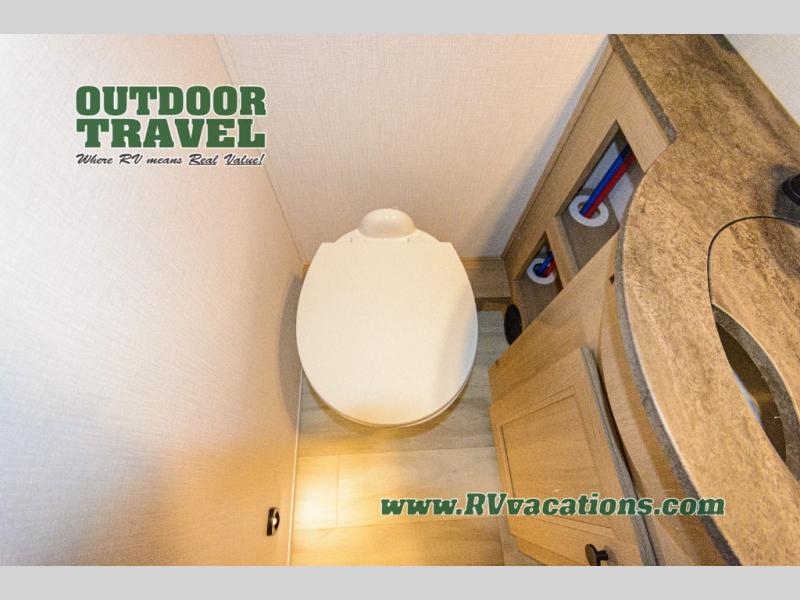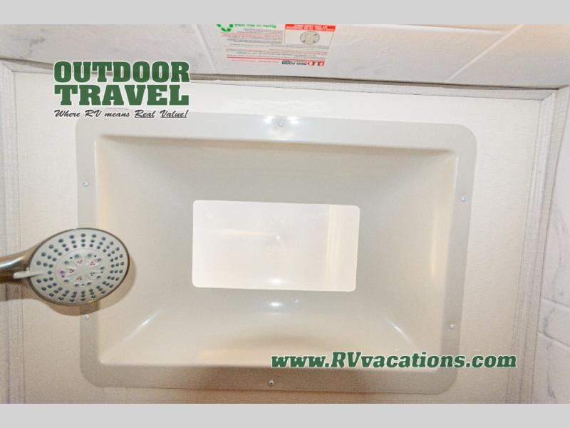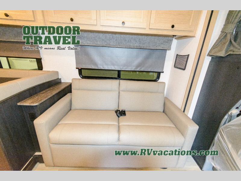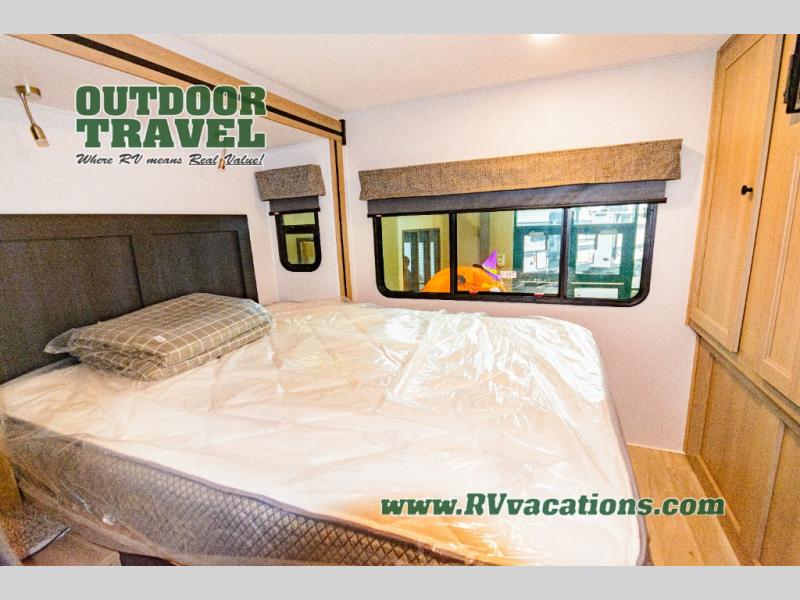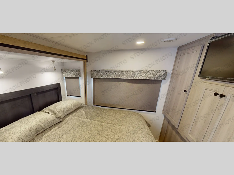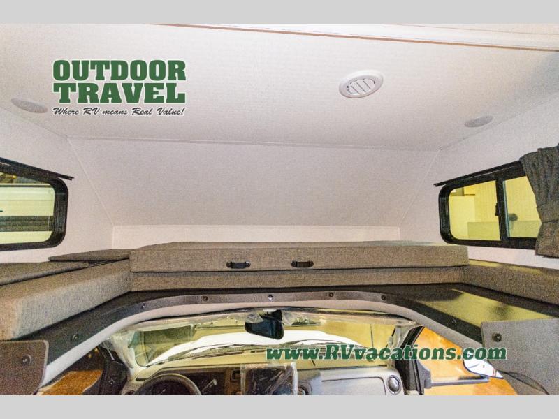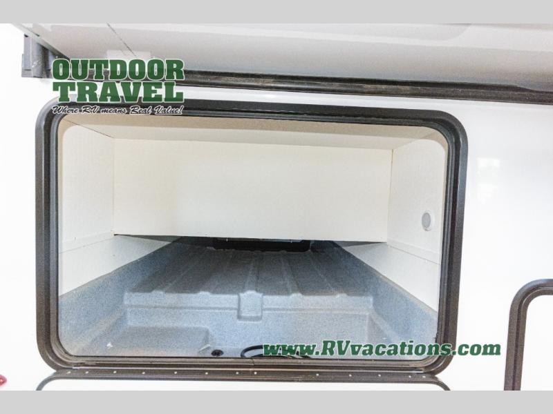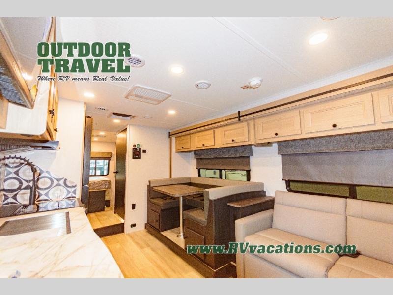 Escape the hustle and bustle of everyday life with this motorhome! It features a 60" x 80" bunk over cab mat which can be switched out for an optional Trekker cap with a built-in entertainment center. The sofa and U-shaped dinette slide offer comfortable places to enjoy meals, socialize, and even sleep once converted. Prepare your best meals with the 10.7 cu. ft. 12V refrigerator, the three burner cooktop, the flip-up countertop, and even the 1.3 cu. ft. undermount convection microwave. The separated bathroom has a 24" x 36" shower across from a toilet with a sink and countertop space, plus it leads directly into the rear private bedroom which has a 60" x 74" queen bed slide across from a linen/12V TV area with wardrobes on either side. You can even add an optional outside 12V TV and stay protected by the 15' 6" power awning!