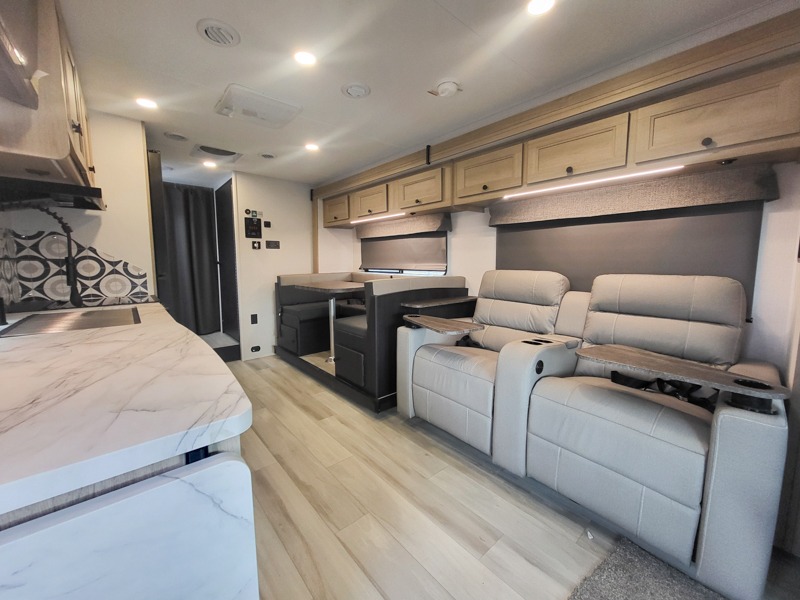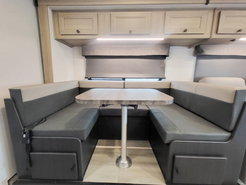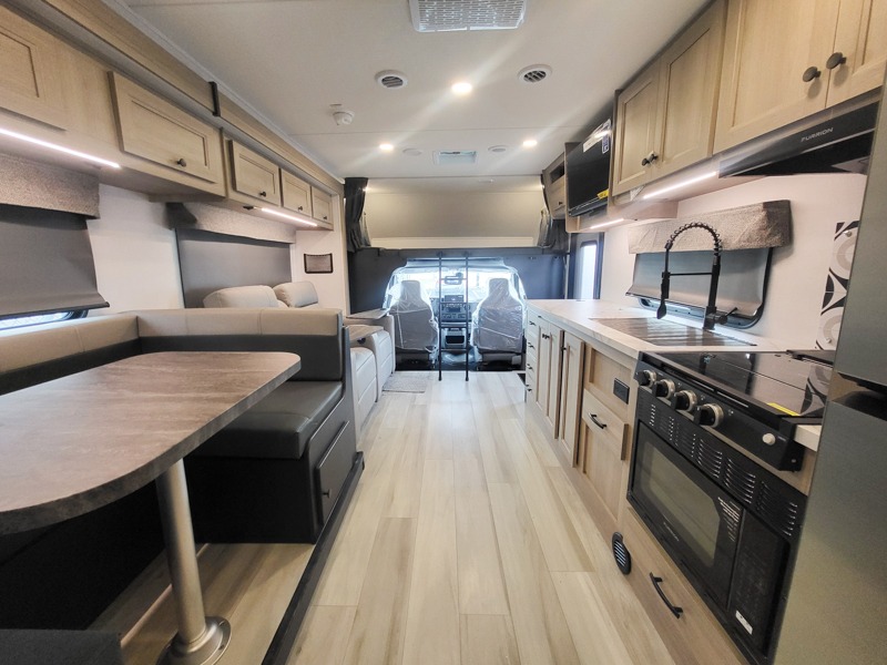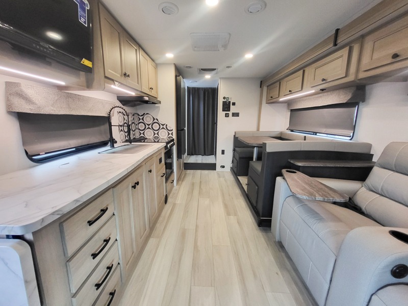 Escape the hustle and bustle of everyday life with this motorhome! It features a 60" x 80" bunk over cab mat which can be switched out for an optional Trekker cap with a built-in entertainment center. The sofa and U-shaped dinette slide offer comfortable places to enjoy meals, socialize, and even sleep once converted. Prepare your best meals with the 10.7 cu. ft. 12V refrigerator, the three burner cooktop, the flip-up countertop, and even the 1.3 cu. ft. undermount convection microwave. The separated bathroom has a 24" x 36" shower across from a toilet with a sink and countertop space, plus it leads directly into the rear private bedroom which has a 60" x 74" queen bed slide across from a linen/12V TV area with wardrobes on either side. You can even add an optional outside 12V TV and stay protected by the 15' 6" power awning!
