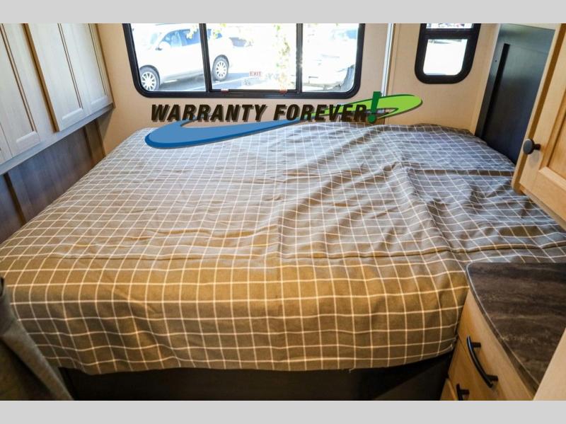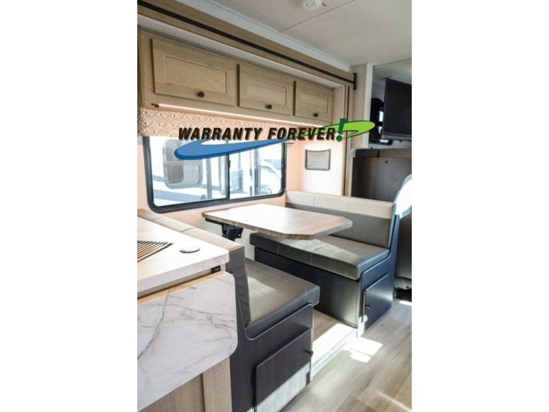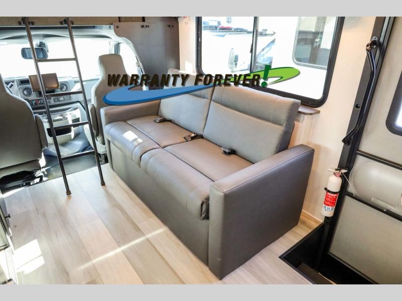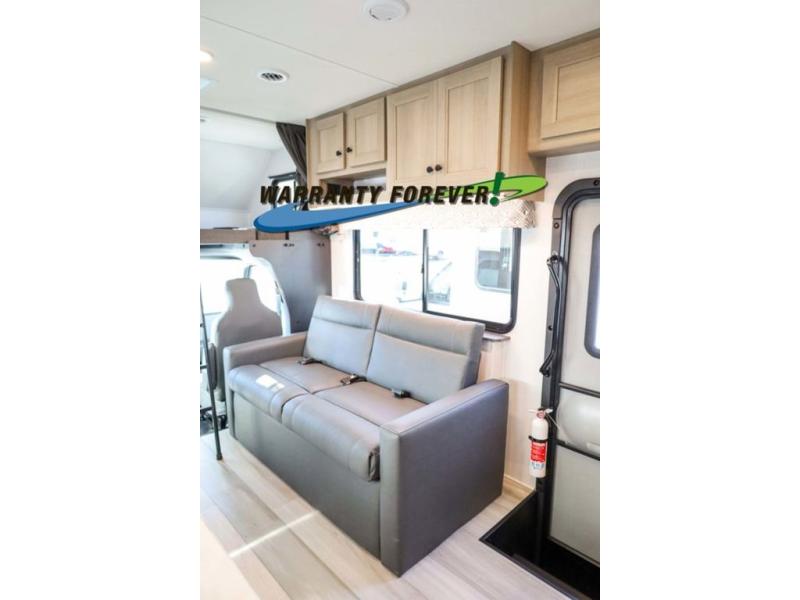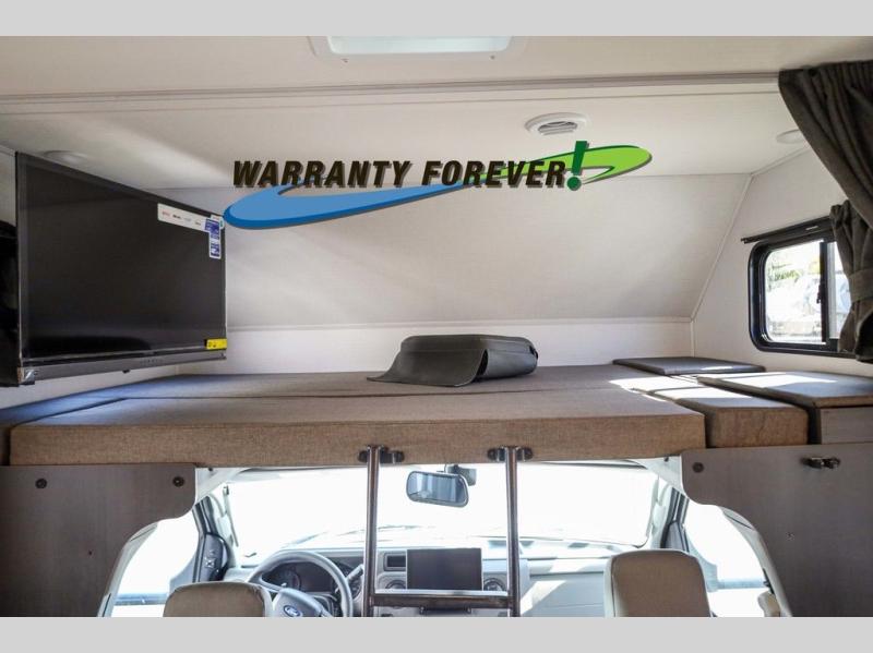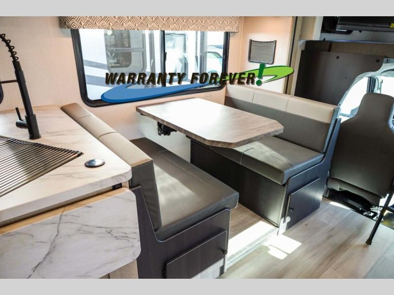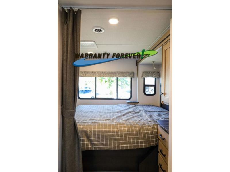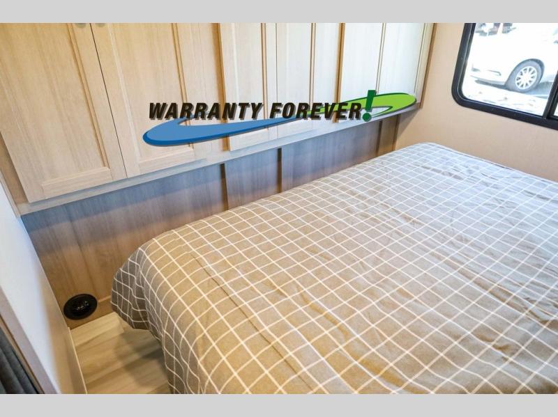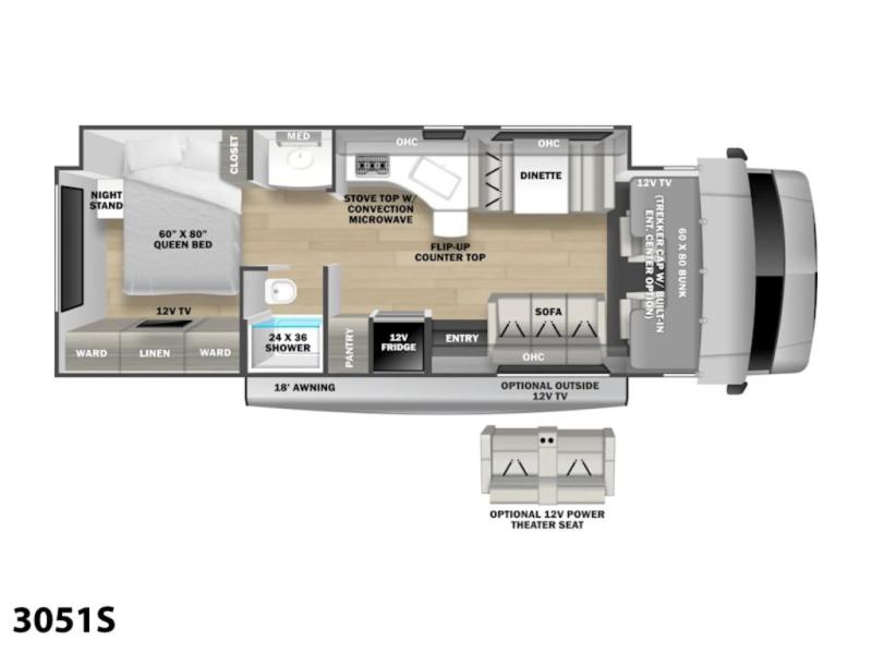 Start traveling in true luxury with this motorhome! The rear private bedroom has a queen bed to lay your head at night, a closet, and wardrobes on either side of the 12V TV. It also leads into the separated bathroom which has a 24" x 36" shower and toilet across from a sink with a medicine cabinet above it. The undermount 1.3 cu. ft. convection microwave will come in handy on those nights when you don't feel like cooking and the flip-up countertop will make your meal prepping easier. You can enjoy your meals at the booth dinette and lay down on the sofa to catch up on your book. The 60" x 80" bunk over cab mat offers a comfortable sleeping space but can be switched out for the optional Trekker cap with a built-in entertainment center!