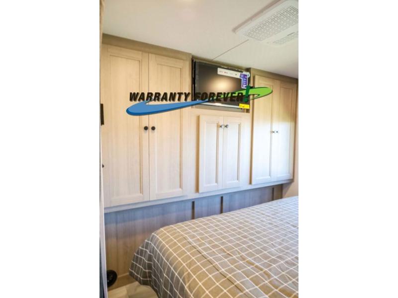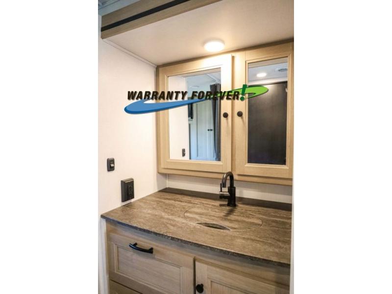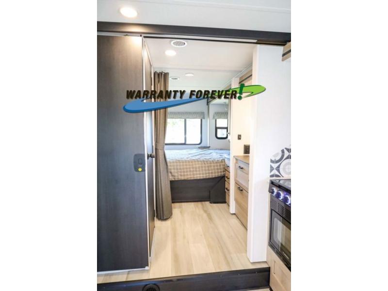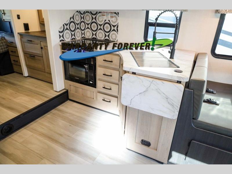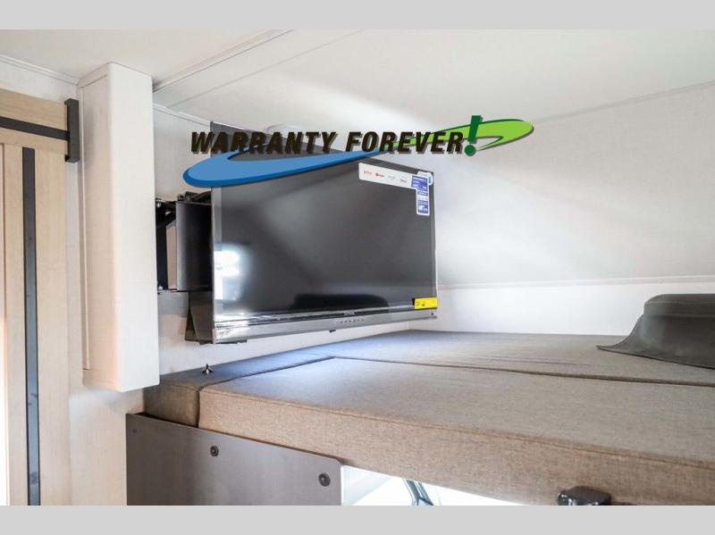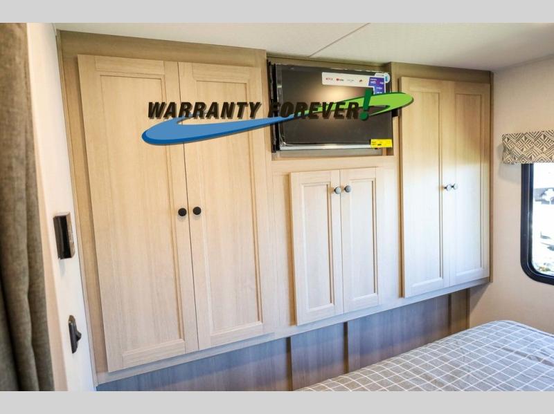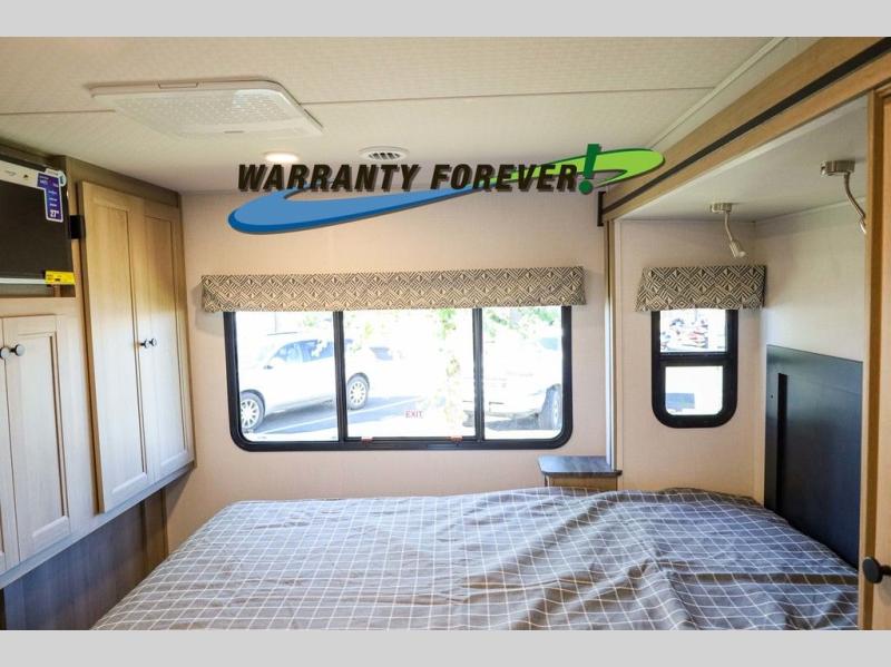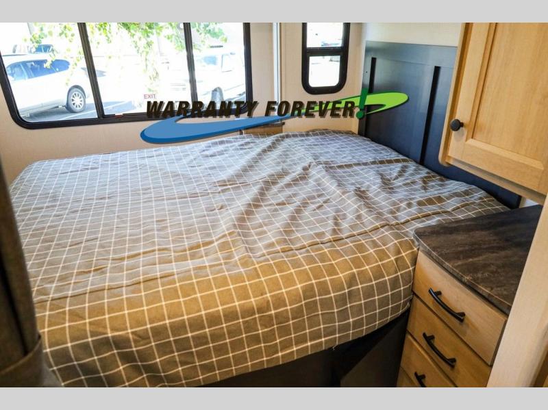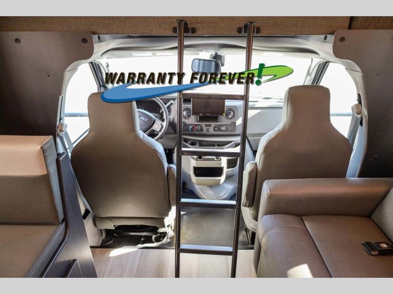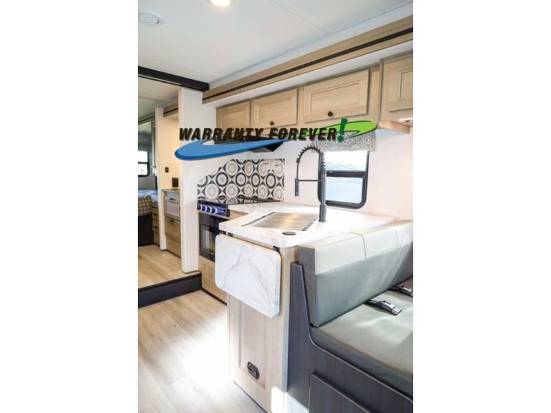 Start traveling in true luxury with this motorhome! The rear private bedroom has a queen bed to lay your head at night, a closet, and wardrobes on either side of the 12V TV. It also leads into the separated bathroom which has a 24" x 36" shower and toilet across from a sink with a medicine cabinet above it. The undermount 1.3 cu. ft. convection microwave will come in handy on those nights when you don't feel like cooking and the flip-up countertop will make your meal prepping easier. You can enjoy your meals at the booth dinette and lay down on the sofa to catch up on your book. The 60" x 80" bunk over cab mat offers a comfortable sleeping space but can be switched out for the optional Trekker cap with a built-in entertainment center!