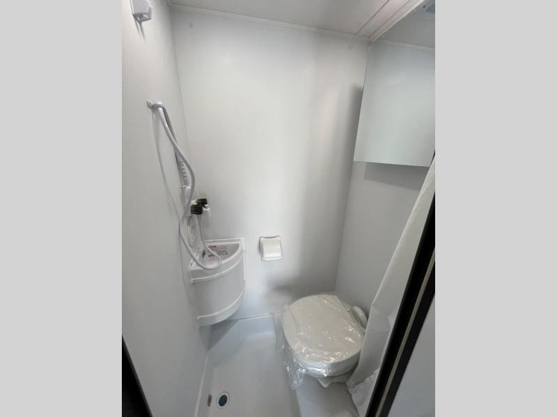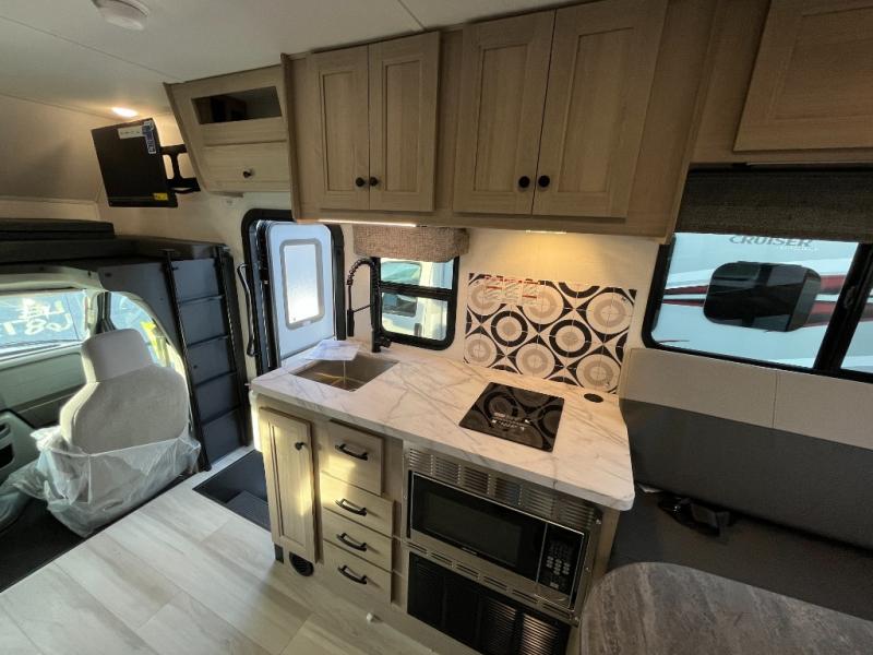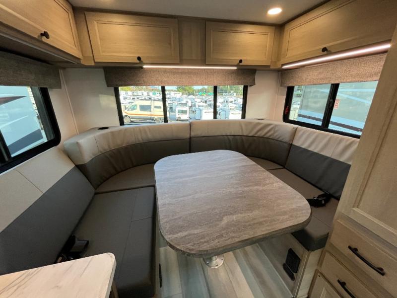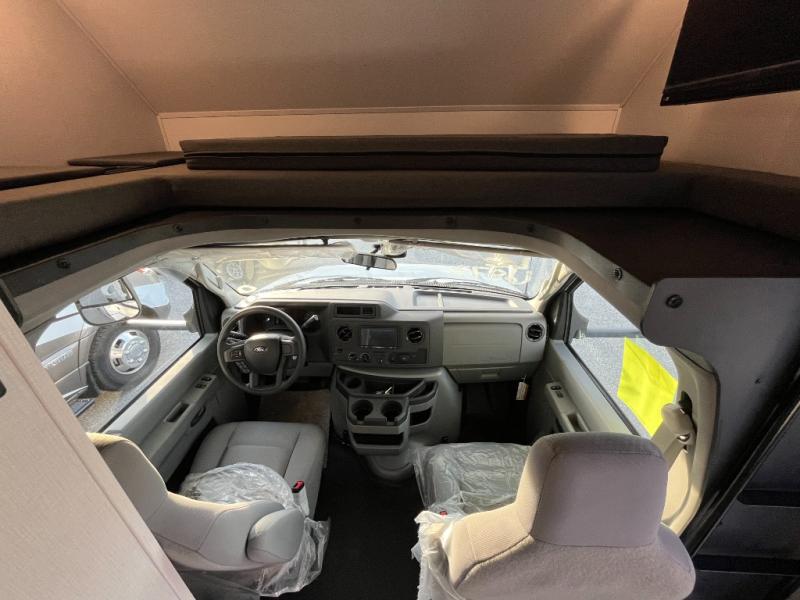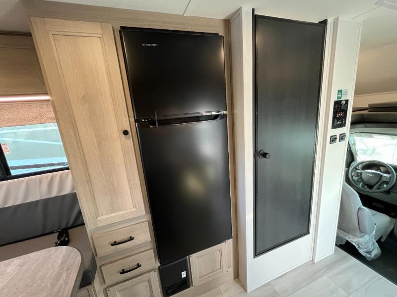 This motorhome is perfect for couples or small families. The bunk over the cab provides a cozy sleeping area, while the U-dinette offers additional sleeping space for guests or family members. The 12V TV is perfect for relaxing in the evenings or enjoying your favorite shows on the go. Plus, the wet bath is a practical and efficient space, making it easy to get ready in the morning or freshen up after a long day. Further, the kitchen is equipped with a 12V fridge, convection microwave/air fryer, and flip-up countertop, providing ample space to prepare meals and snacks. The pantry offers additional storage for your food and cooking essentials. Additionally, overhead cabinets throughout the unit provide plenty of storage for your belongings.
