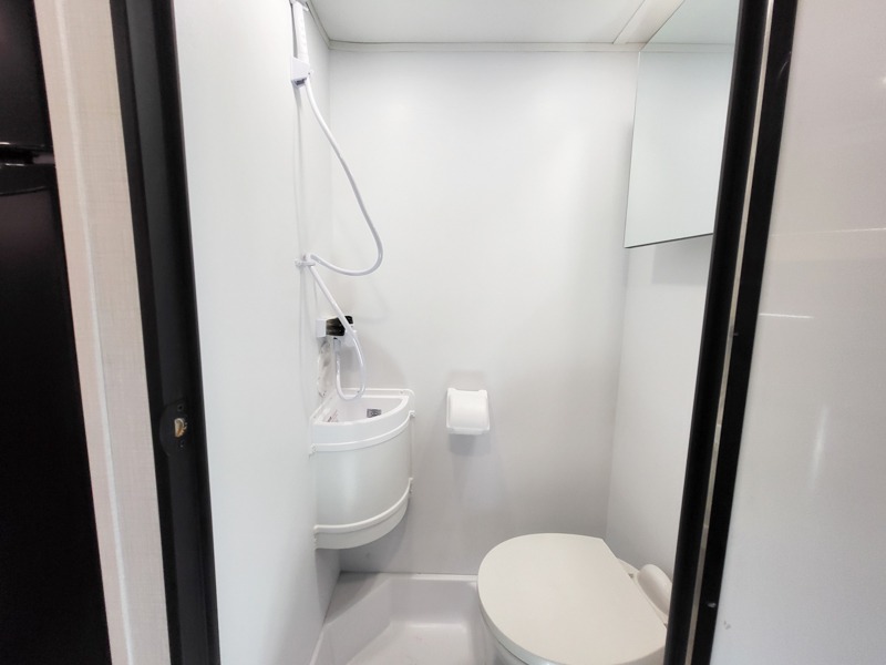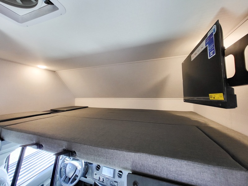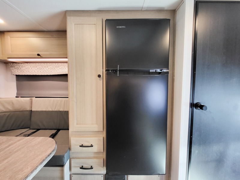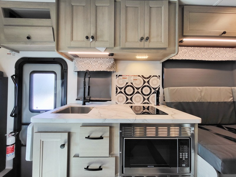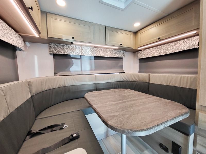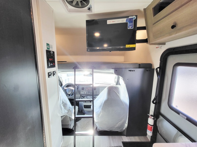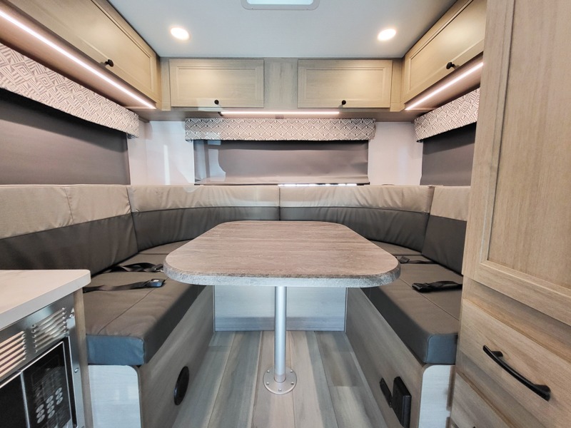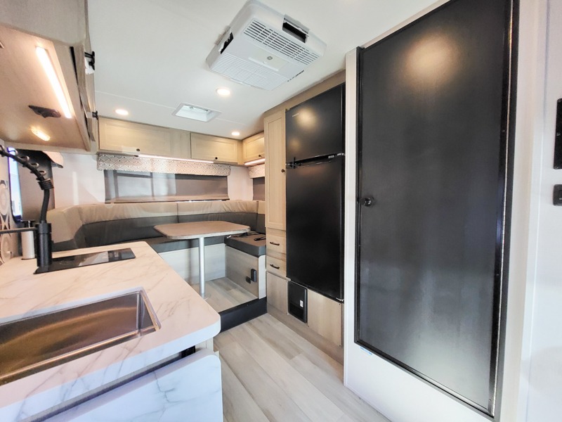 This motorhome is perfect for couples or small families. The bunk over the cab provides a cozy sleeping area, while the U-dinette offers additional sleeping space for guests or family members. The 12V TV is perfect for relaxing in the evenings or enjoying your favorite shows on the go. Plus, the wet bath is a practical and efficient space, making it easy to get ready in the morning or freshen up after a long day. Further, the kitchen is equipped with a 12V fridge, convection microwave/air fryer, and flip-up countertop, providing ample space to prepare meals and snacks. The pantry offers additional storage for your food and cooking essentials. Additionally, overhead cabinets throughout the unit provide plenty of storage for your belongings.