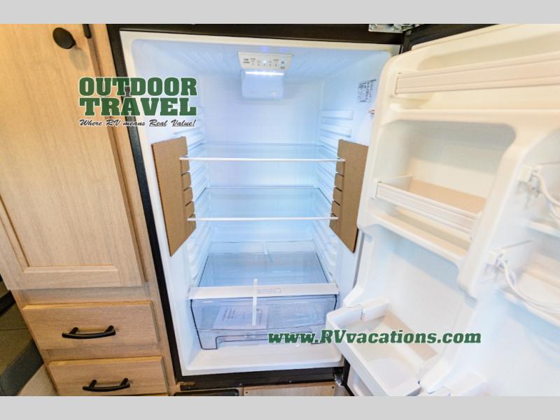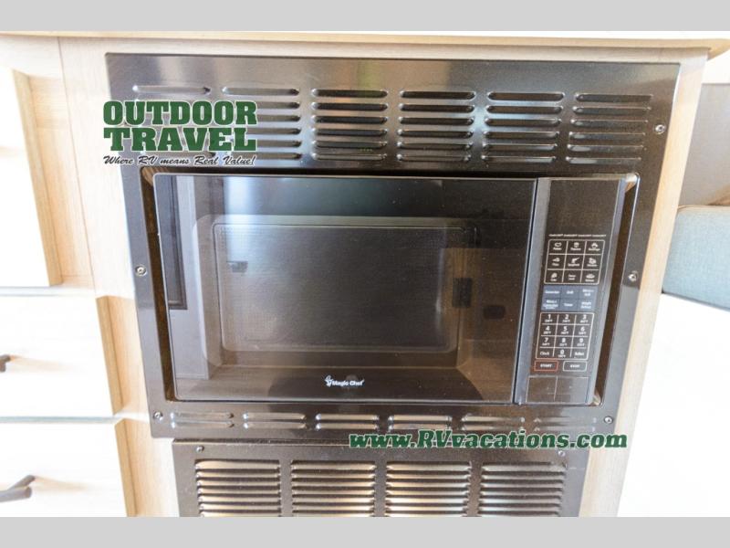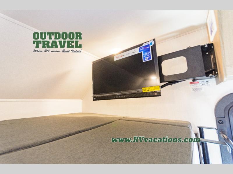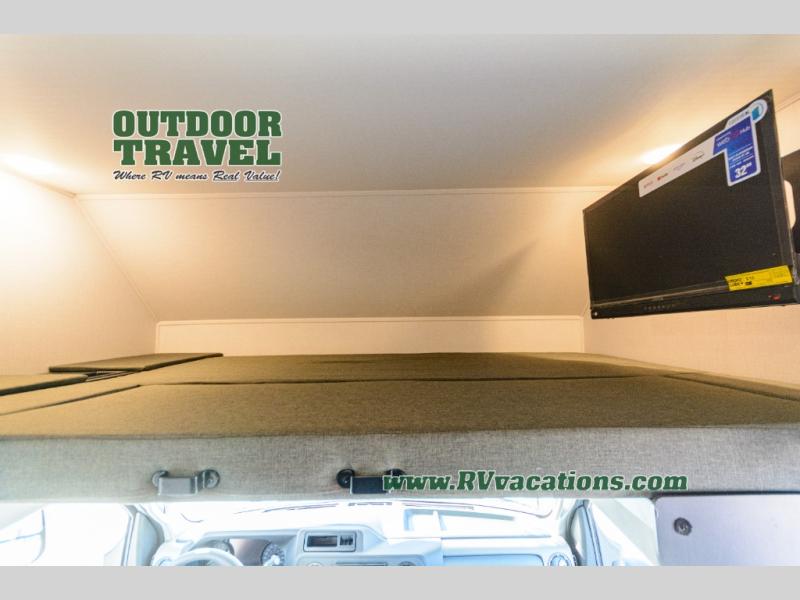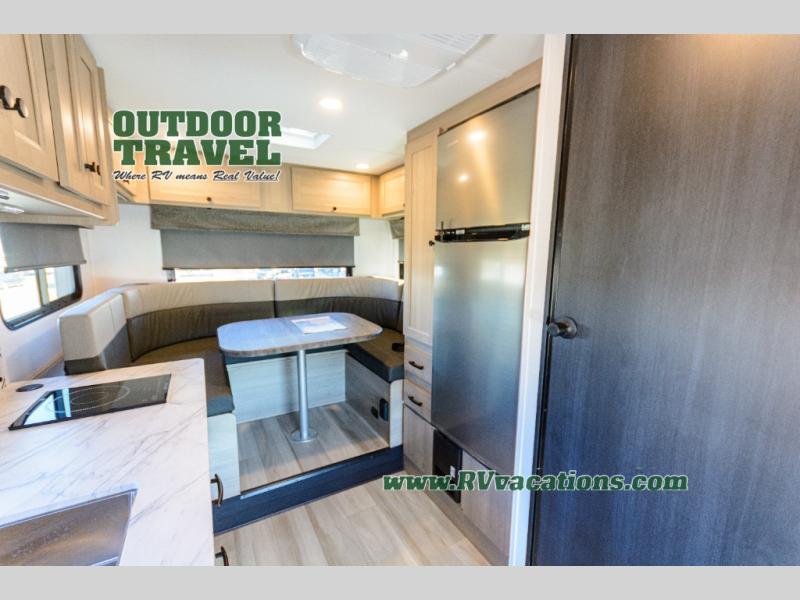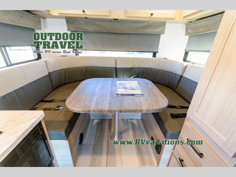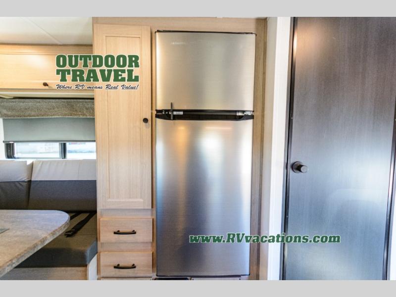 This motorhome is perfect for couples or small families. The bunk over the cab provides a cozy sleeping area, while the U-dinette offers additional sleeping space for guests or family members. The 12V TV is perfect for relaxing in the evenings or enjoying your favorite shows on the go. Plus, the wet bath is a practical and efficient space, making it easy to get ready in the morning or freshen up after a long day. Further, the kitchen is equipped with a 12V fridge, convection microwave/air fryer, and flip-up countertop, providing ample space to prepare meals and snacks. The pantry offers additional storage for your food and cooking essentials. Additionally, overhead cabinets throughout the unit provide plenty of storage for your belongings.