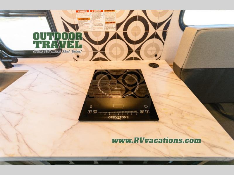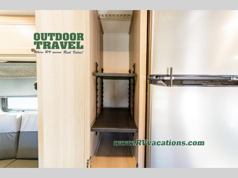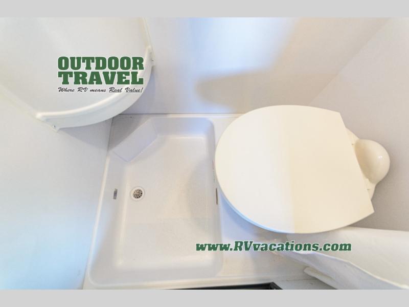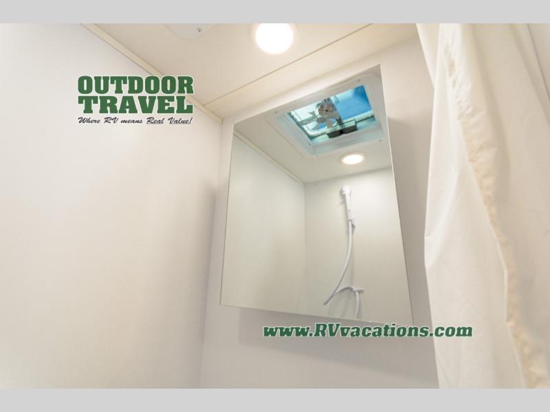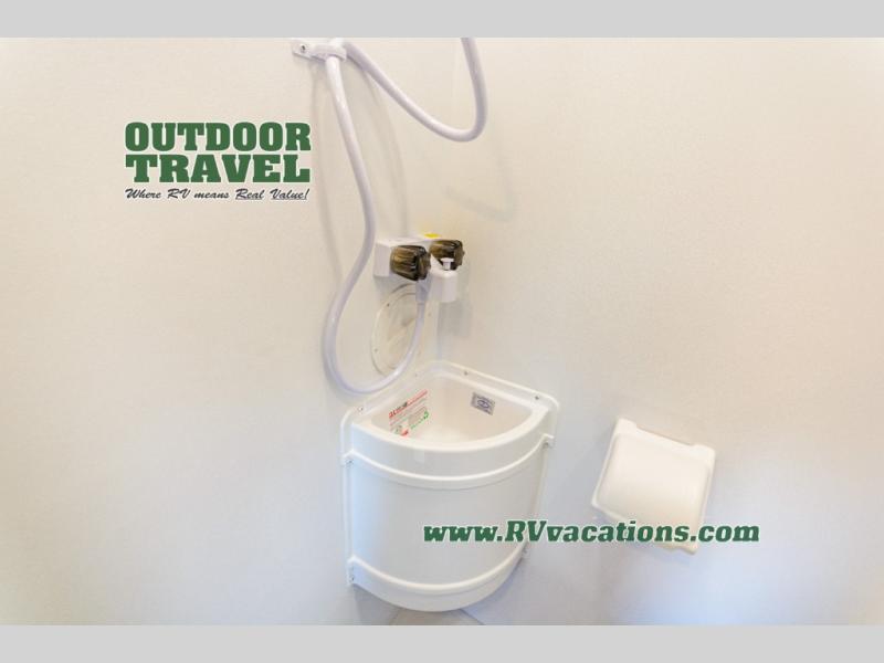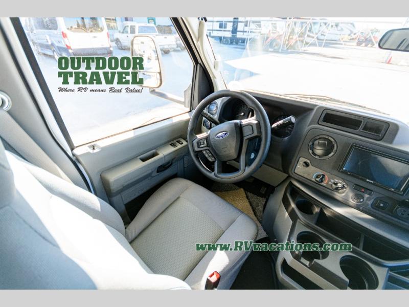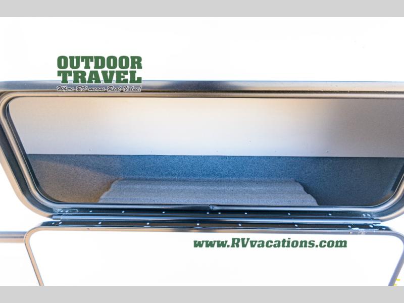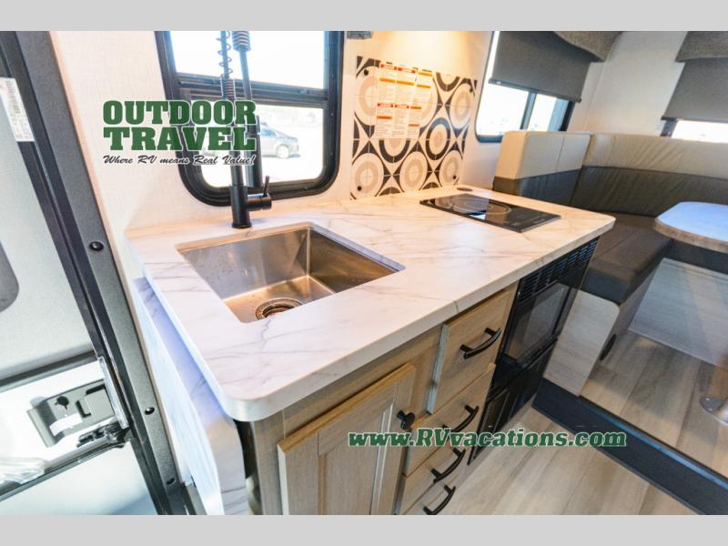 This motorhome is perfect for couples or small families. The bunk over the cab provides a cozy sleeping area, while the U-dinette offers additional sleeping space for guests or family members. The 12V TV is perfect for relaxing in the evenings or enjoying your favorite shows on the go. Plus, the wet bath is a practical and efficient space, making it easy to get ready in the morning or freshen up after a long day. Further, the kitchen is equipped with a 12V fridge, convection microwave/air fryer, and flip-up countertop, providing ample space to prepare meals and snacks. The pantry offers additional storage for your food and cooking essentials. Additionally, overhead cabinets throughout the unit provide plenty of storage for your belongings.