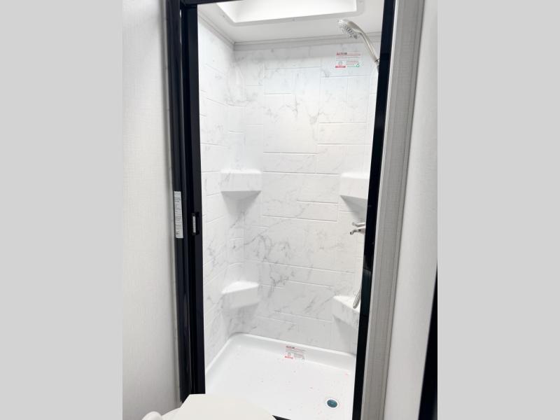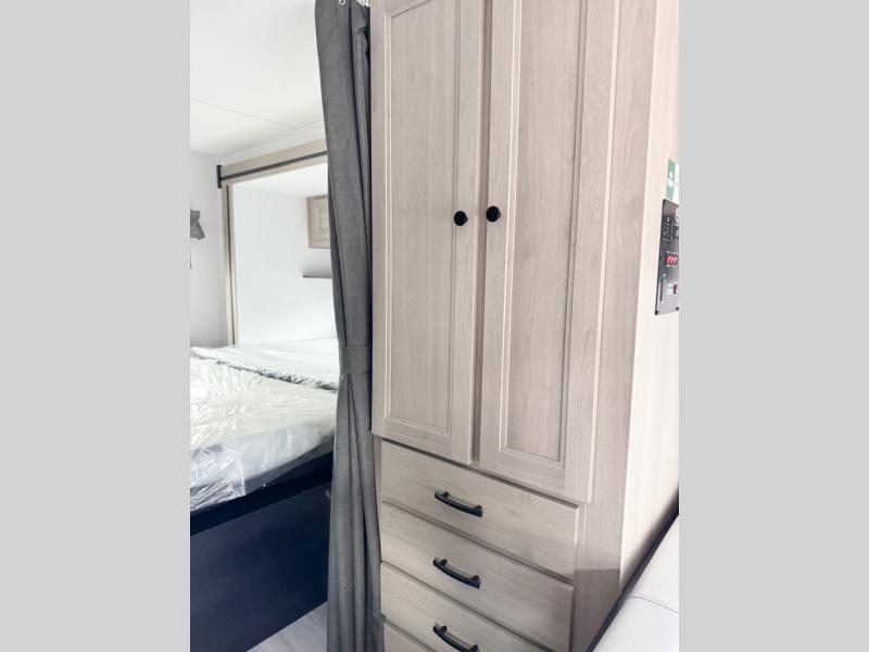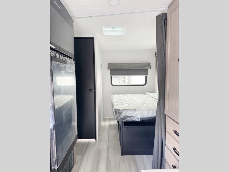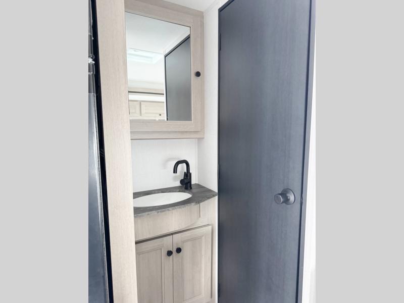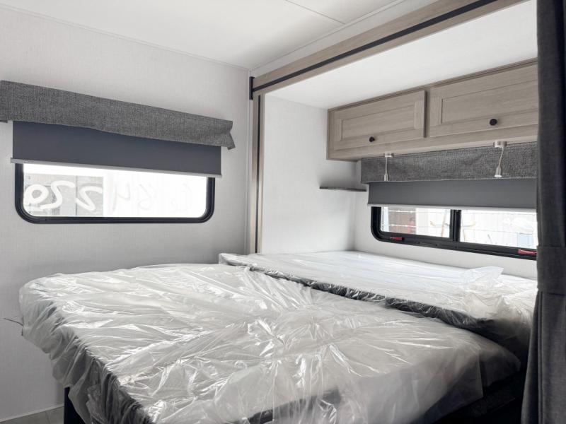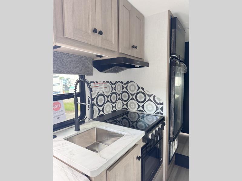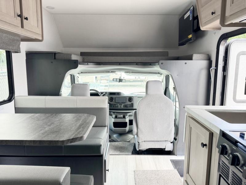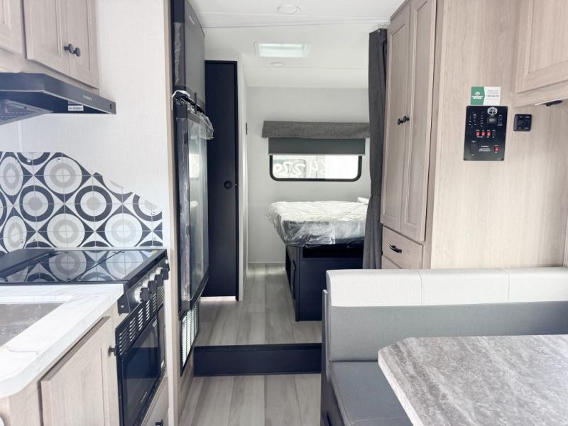 Enjoy trips near and far in this single slide out coach. The kitchen provides a 10.7 cu. ft. 12V refrigerator to store the cold items, a convection microwave and a recessed three-burner range to whip up meals. The private toilet and shower give you a place to get cleaned up, and the bathroom sink is just outside the door. This model includes a queen bed slide out with a wedge mattress, and there is a cab-over bunk for your guests. You can spend your evenings playing cards at the booth dinette, or head outdoors to relax under the 14' power awning with LED lights!