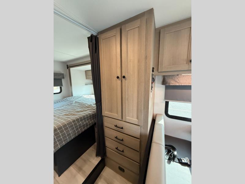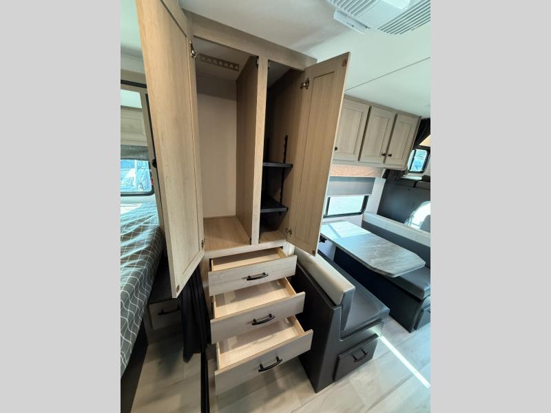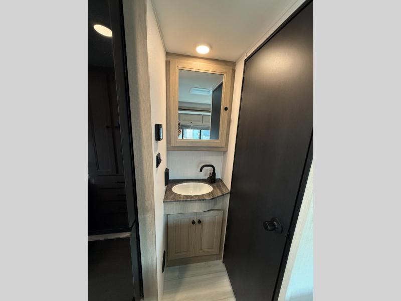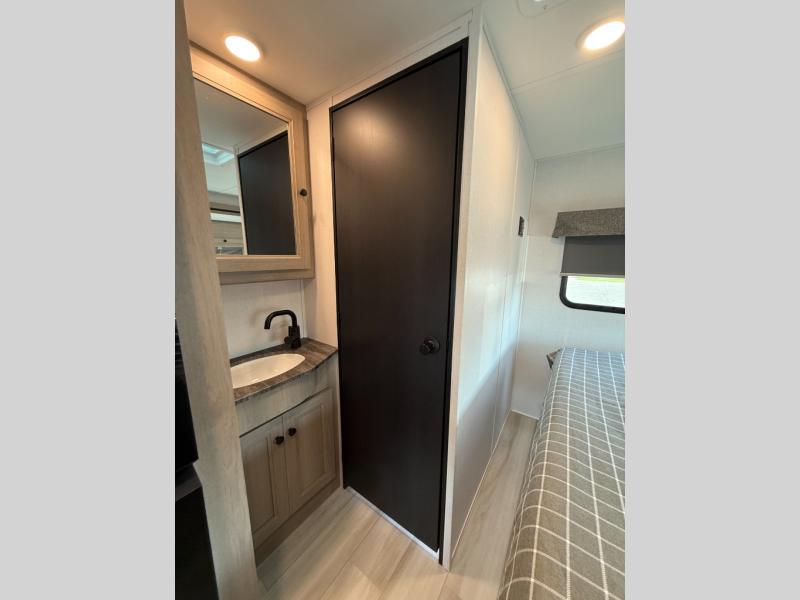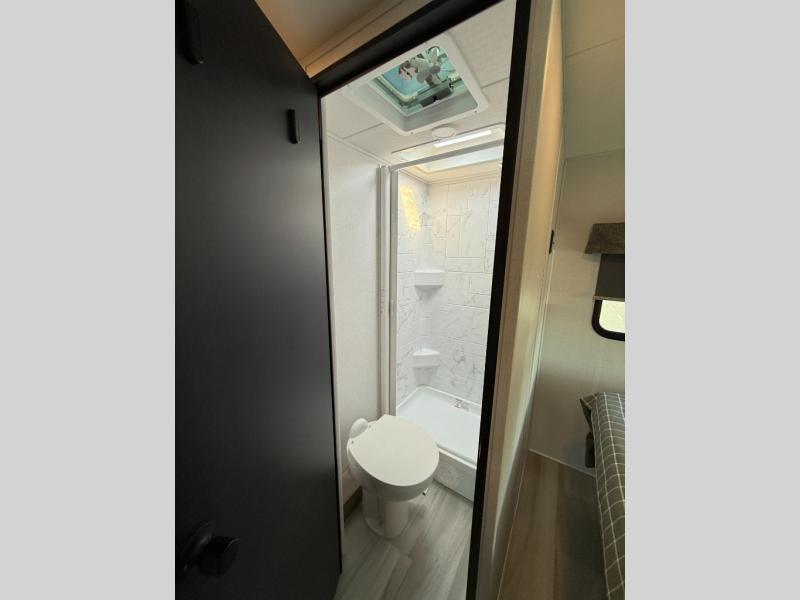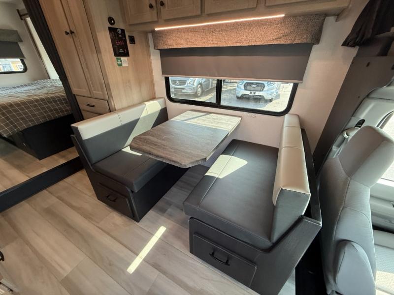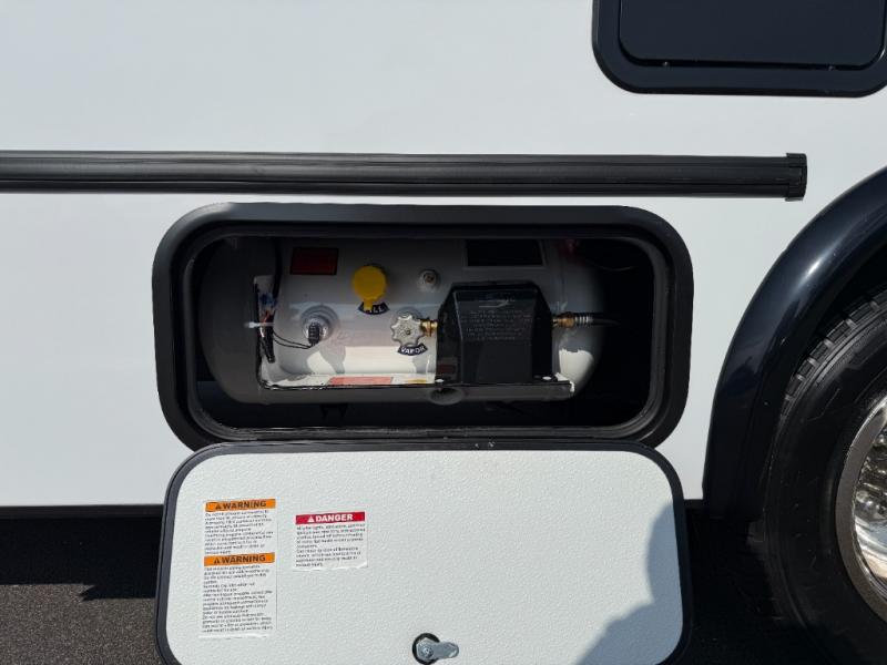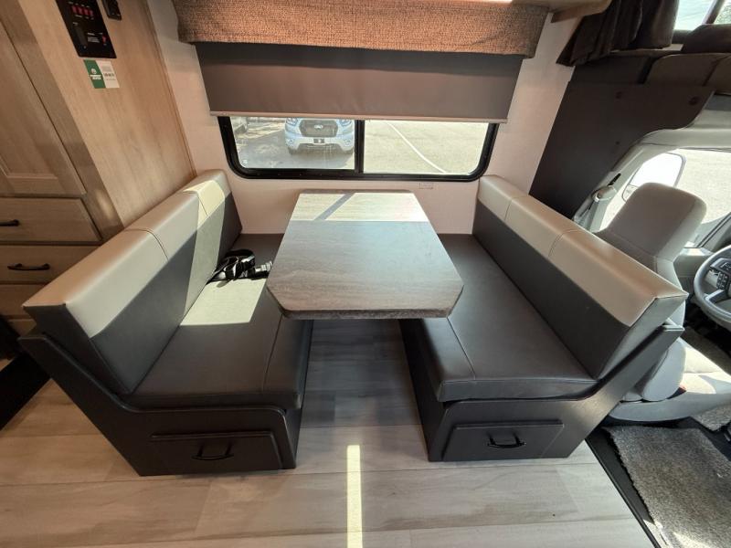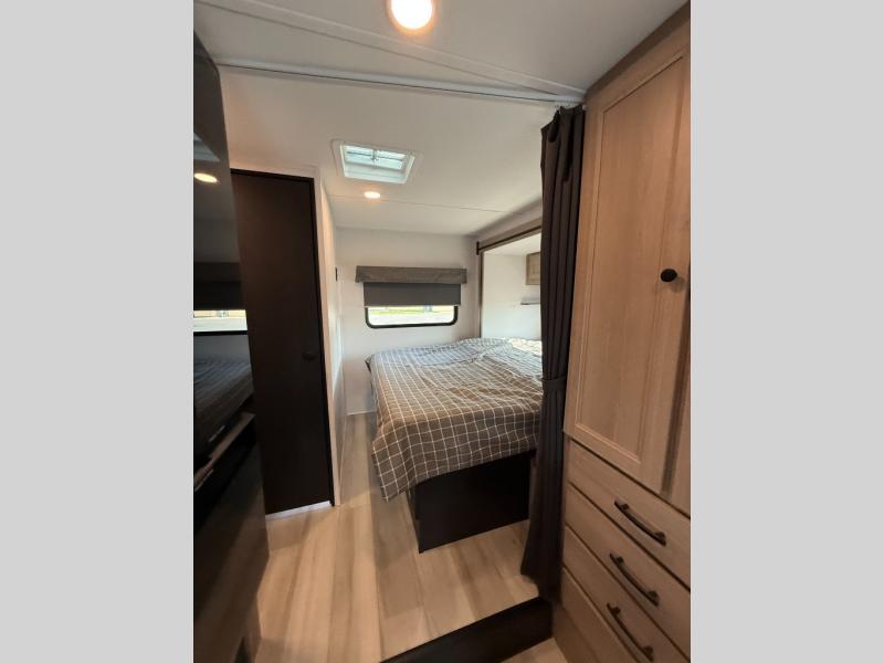 Enjoy trips near and far in this single slide out coach. The kitchen provides a 10.7 cu. ft. 12V refrigerator to store the cold items, a convection microwave and a recessed three-burner range to whip up meals. The private toilet and shower give you a place to get cleaned up, and the bathroom sink is just outside the door. This model includes a queen bed slide out with a wedge mattress, and there is a cab-over bunk for your guests. You can spend your evenings playing cards at the booth dinette, or head outdoors to relax under the 14' power awning with LED lights!