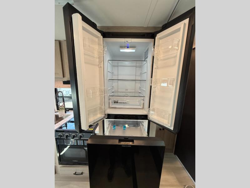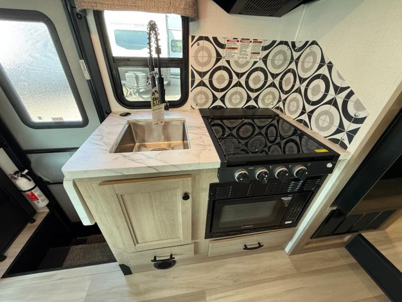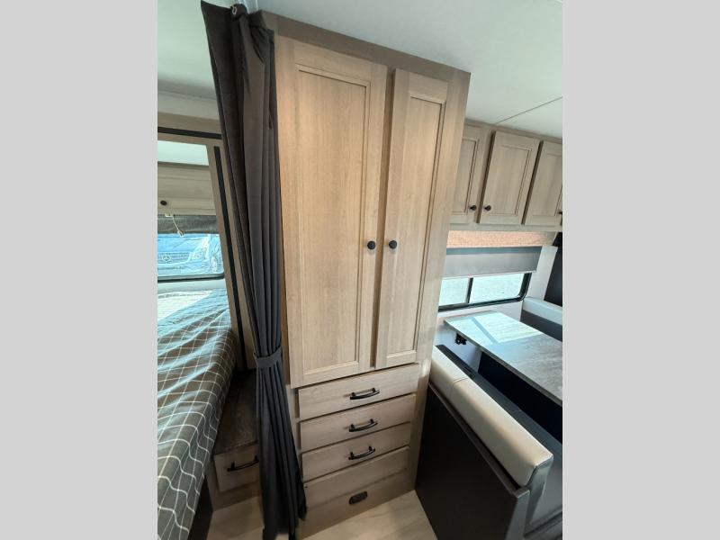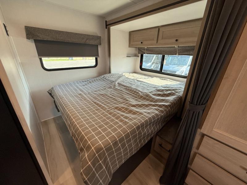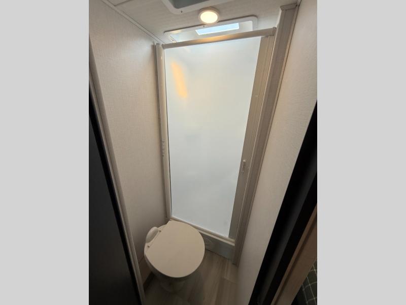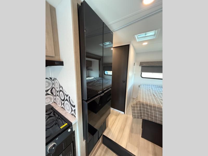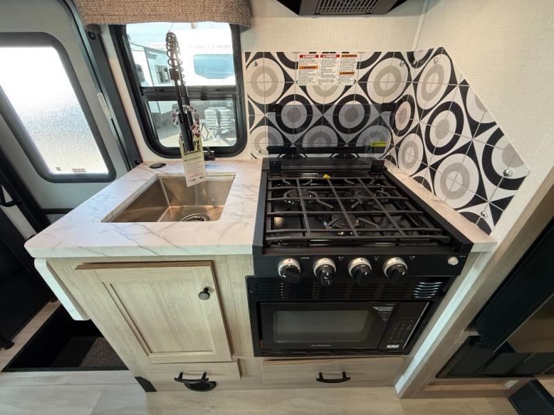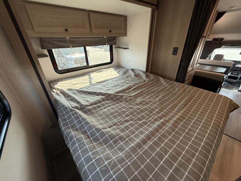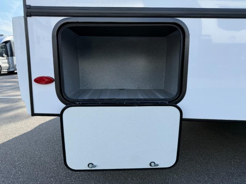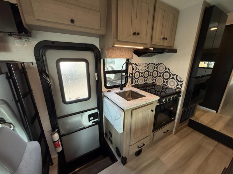 Enjoy trips near and far in this single slide out coach. The kitchen provides a 10.7 cu. ft. 12V refrigerator to store the cold items, a convection microwave and a recessed three-burner range to whip up meals. The private toilet and shower give you a place to get cleaned up, and the bathroom sink is just outside the door. This model includes a queen bed slide out with a wedge mattress, and there is a cab-over bunk for your guests. You can spend your evenings playing cards at the booth dinette, or head outdoors to relax under the 14' power awning with LED lights!