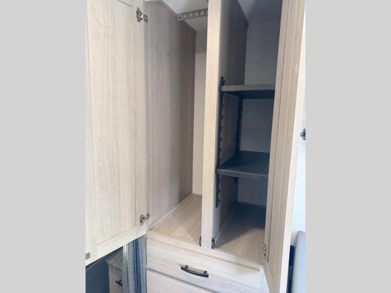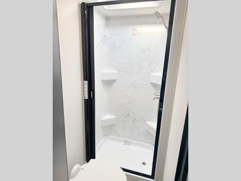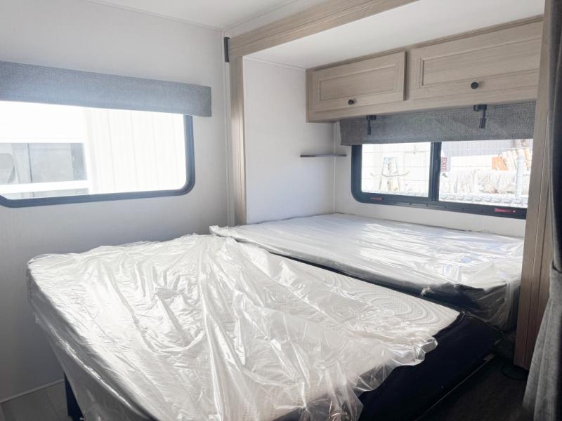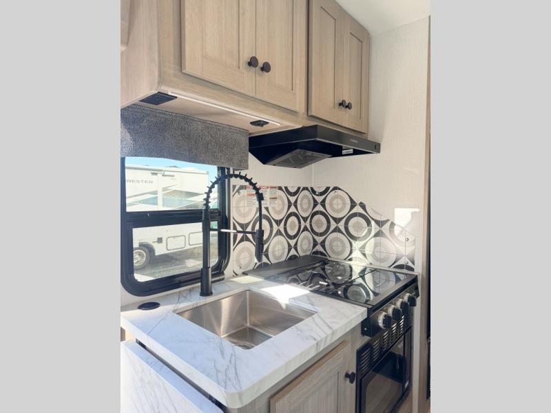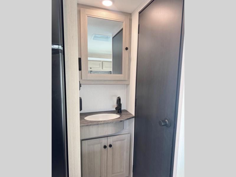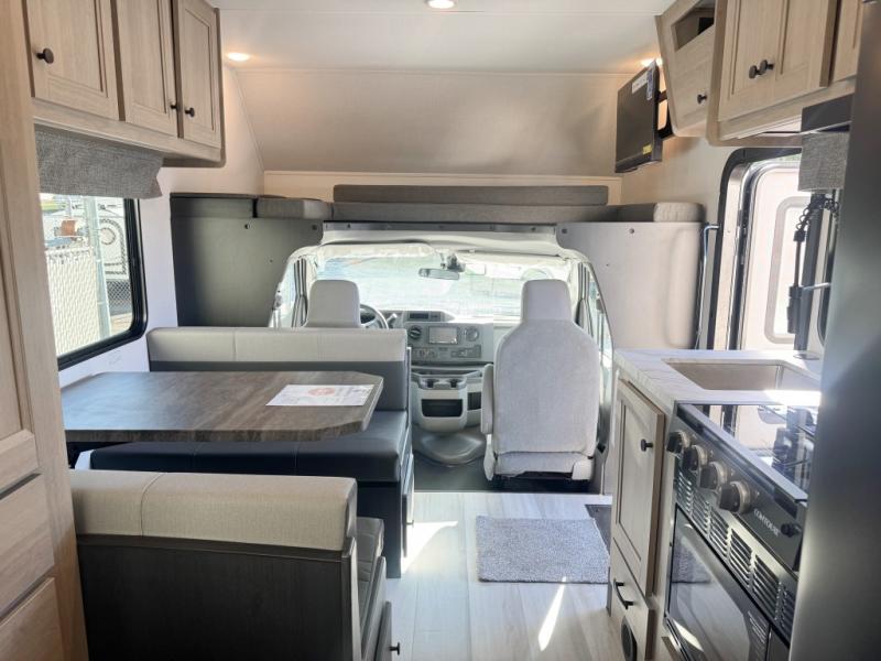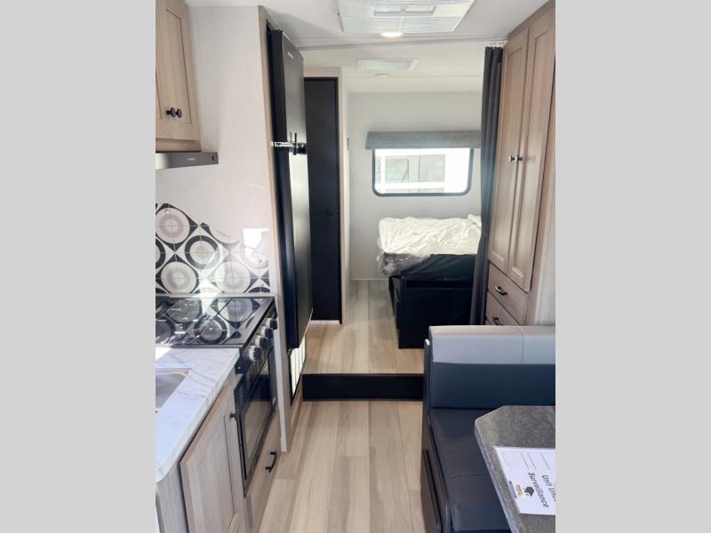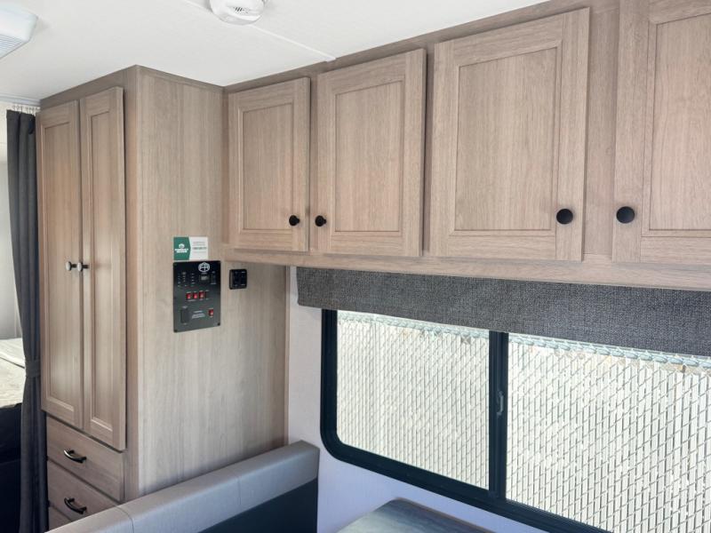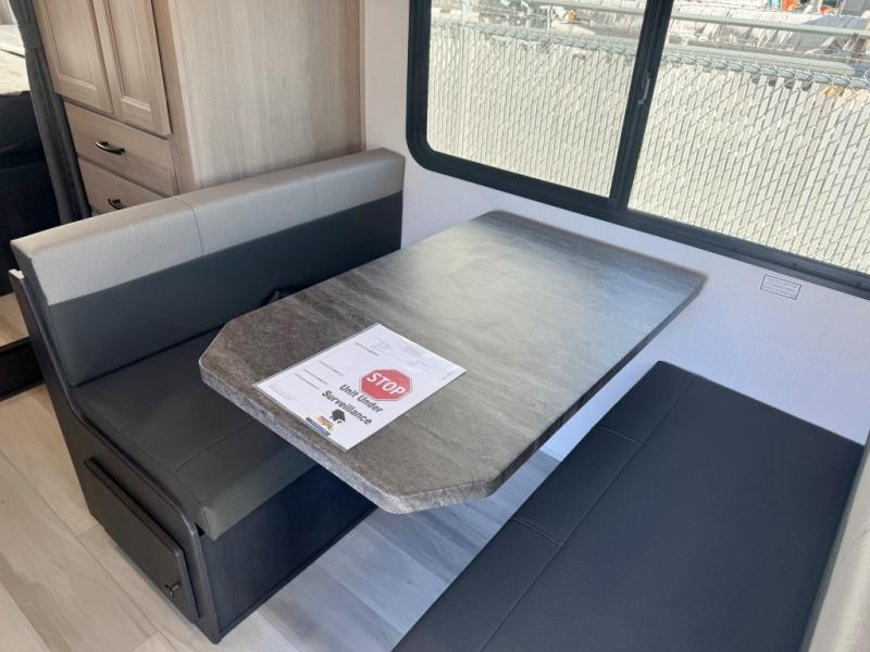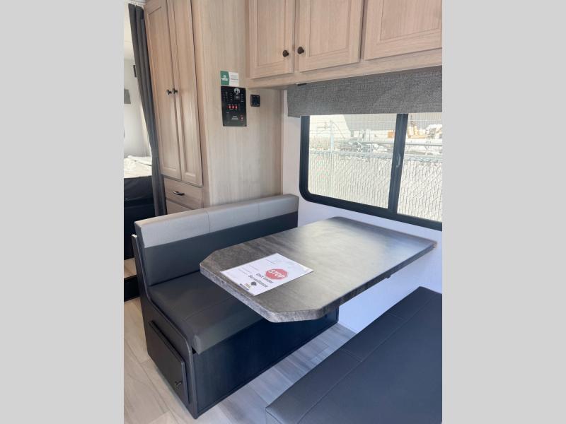 Enjoy trips near and far in this single slide out coach. The kitchen provides a 10.7 cu. ft. 12V refrigerator to store the cold items, a convection microwave and a recessed three-burner range to whip up meals. The private toilet and shower give you a place to get cleaned up, and the bathroom sink is just outside the door. This model includes a queen bed slide out with a wedge mattress, and there is a cab-over bunk for your guests. You can spend your evenings playing cards at the booth dinette, or head outdoors to relax under the 14' power awning with LED lights!