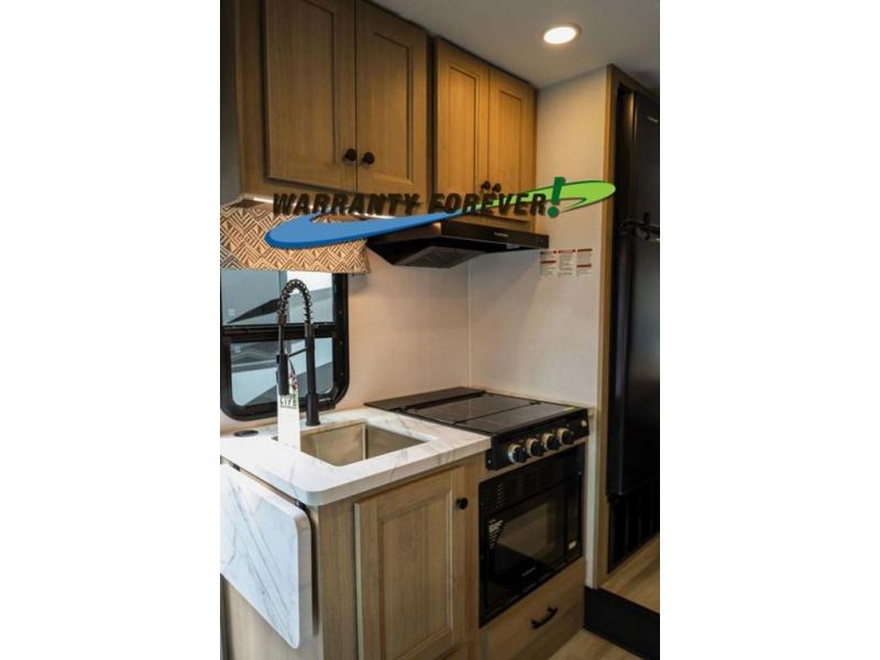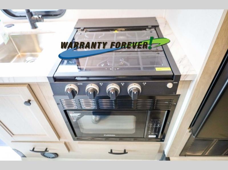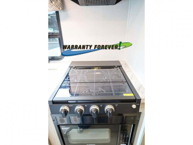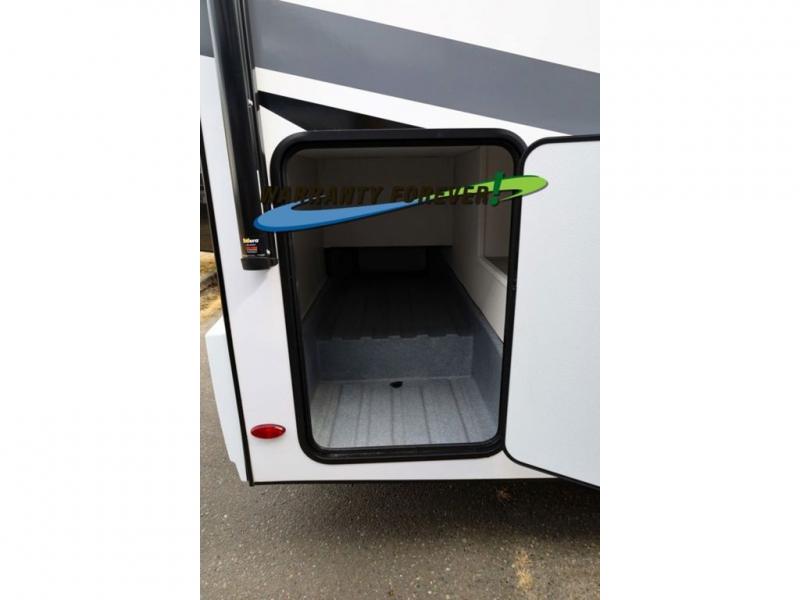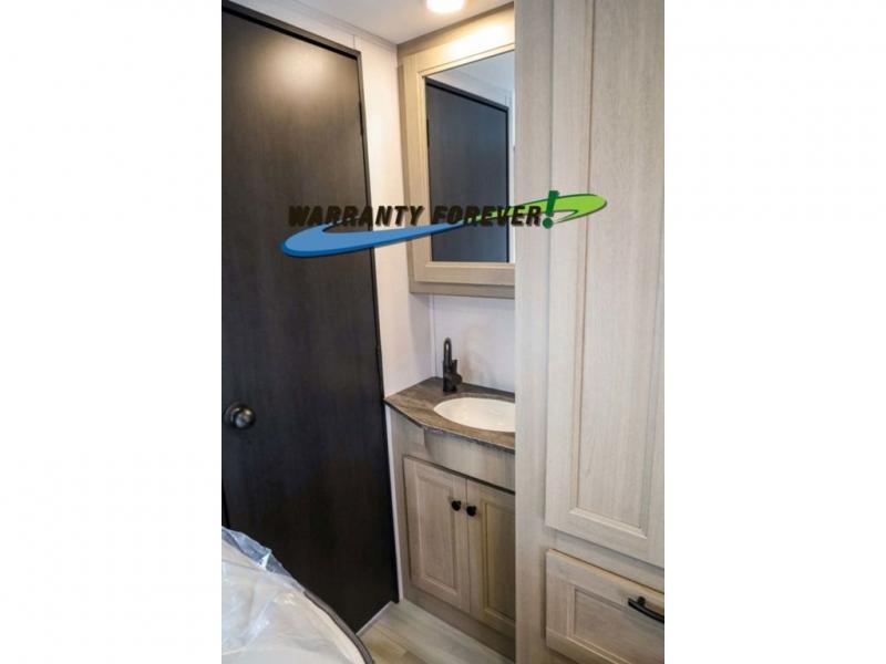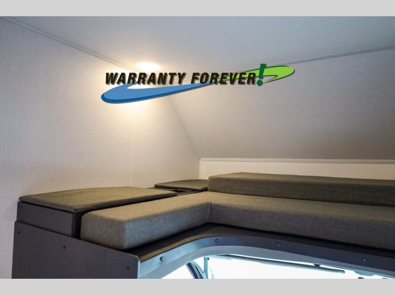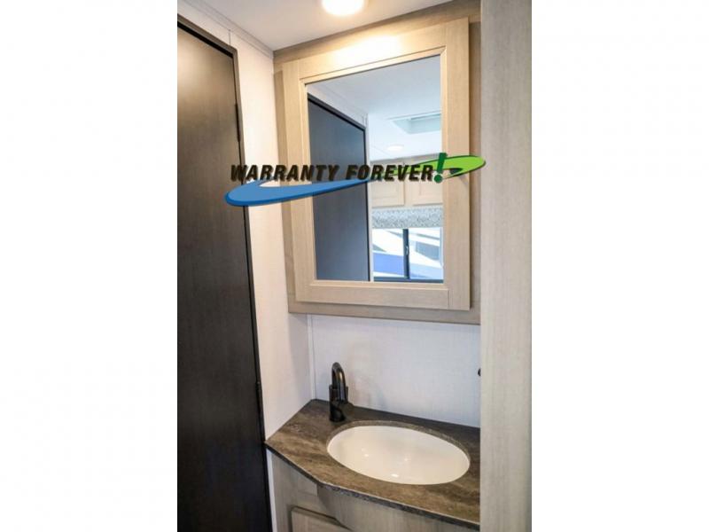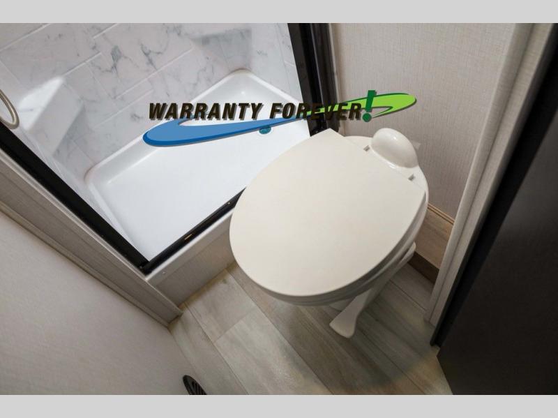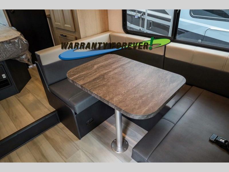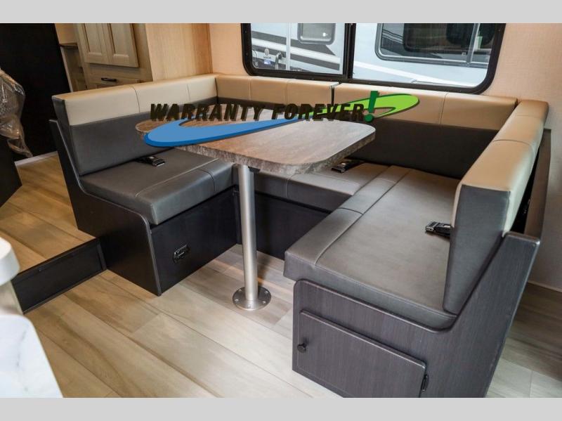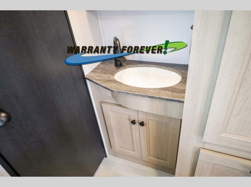 Travel in style with your own accommodations in this coach. You'll find a queen-size cab-over bunk that can be utilized as extra sleeping space or even storage, plus the rear corner offers a queen bed. And don't forget about the U-dinette as extra sleeping space after dining, playing games and relaxing. The kitchen offers a 10.7 cu. ft. 12V refrigerator, a convection microwave, a recessed three-burner range, soft touch self-closing drawer guides and a cordless 12V charging plate. The private toilet and shower room gives you a place to get cleaned up, and the bathroom sink is just outside the door allowing someone else the ability to get ready at the same time.
