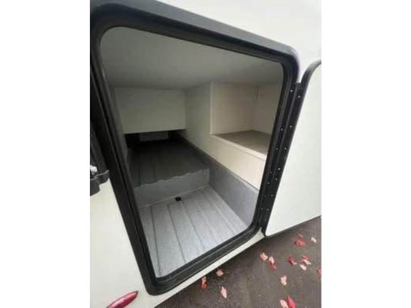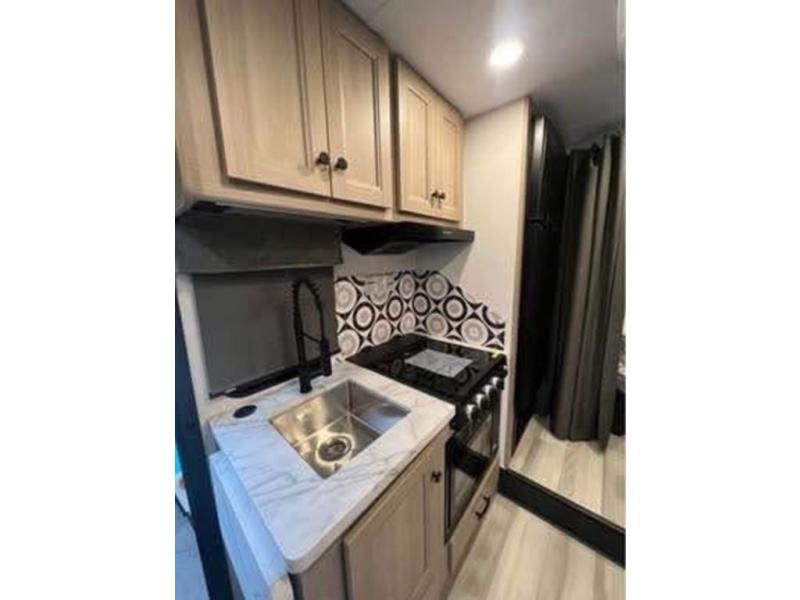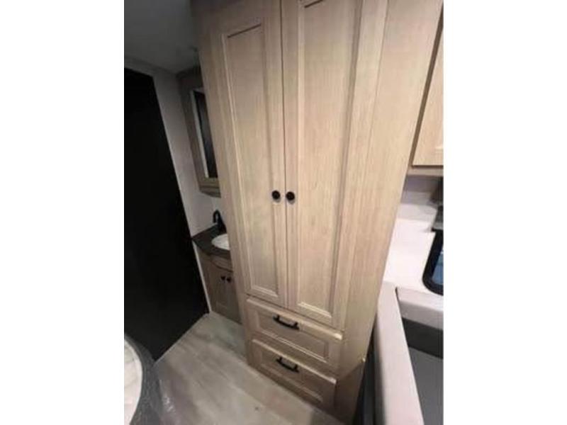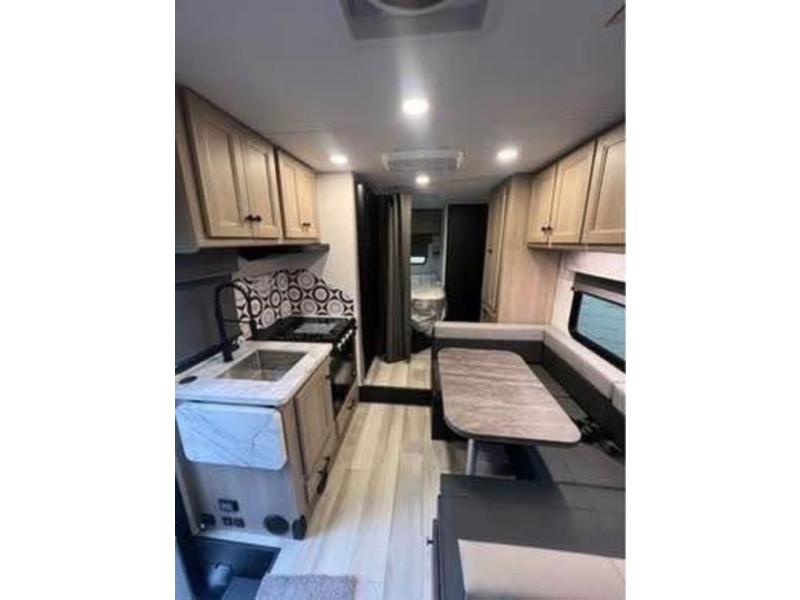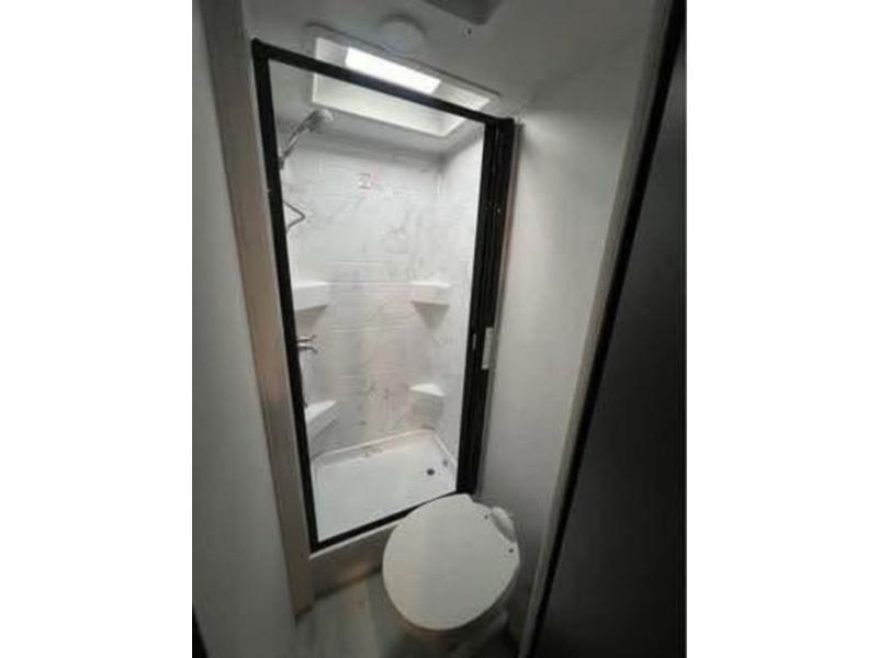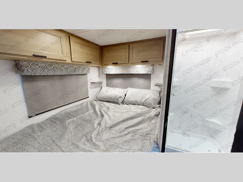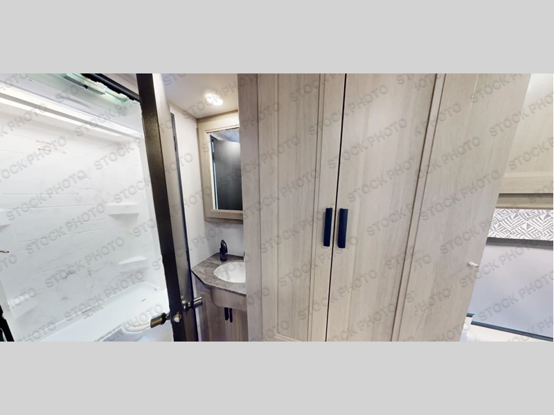 Travel in style with your own accommodations in this coach. You'll find a queen-size cab-over bunk that can be utilized as extra sleeping space or even storage, plus the rear corner offers a queen bed. And don't forget about the U-dinette as extra sleeping space after dining, playing games and relaxing. The kitchen offers a 10.7 cu. ft. 12V refrigerator, a convection microwave, a recessed three-burner range, soft touch self-closing drawer guides and a cordless 12V charging plate. The private toilet and shower room gives you a place to get cleaned up, and the bathroom sink is just outside the door allowing someone else the ability to get ready at the same time.