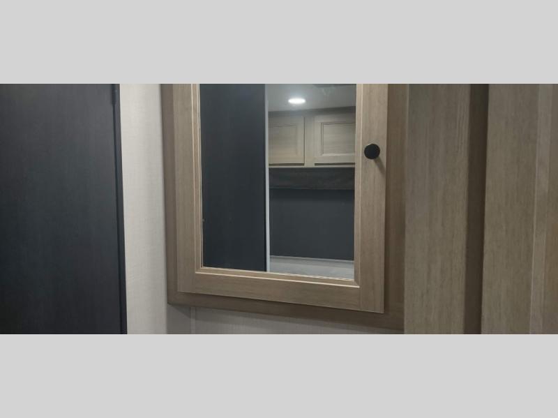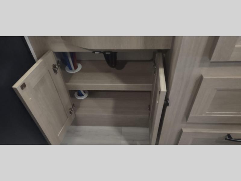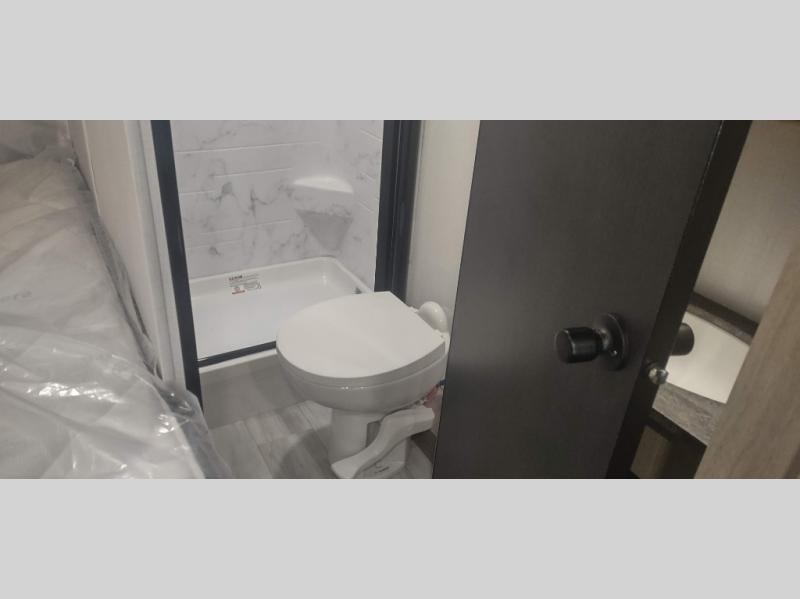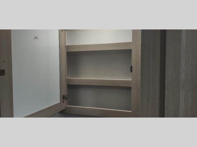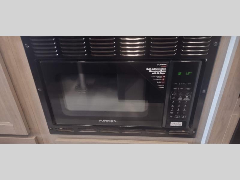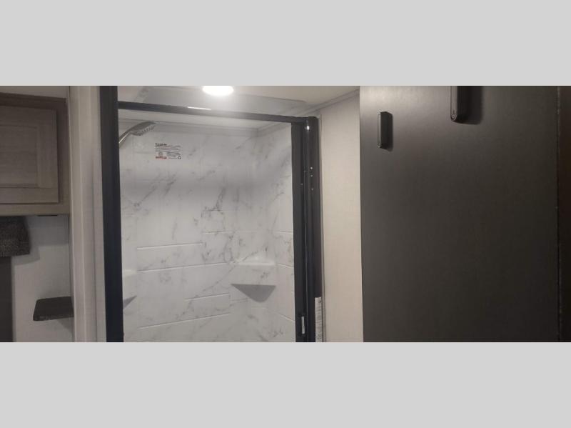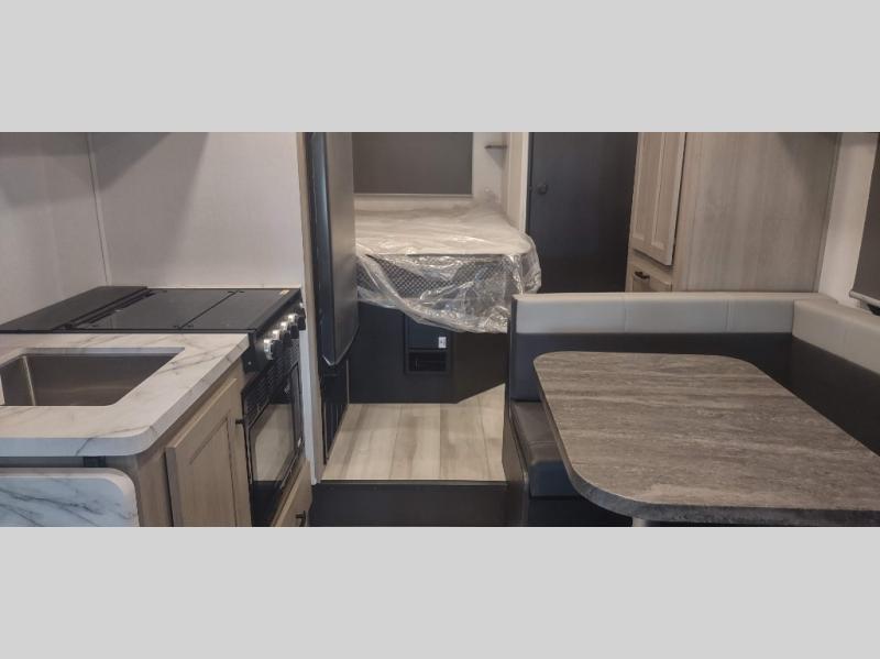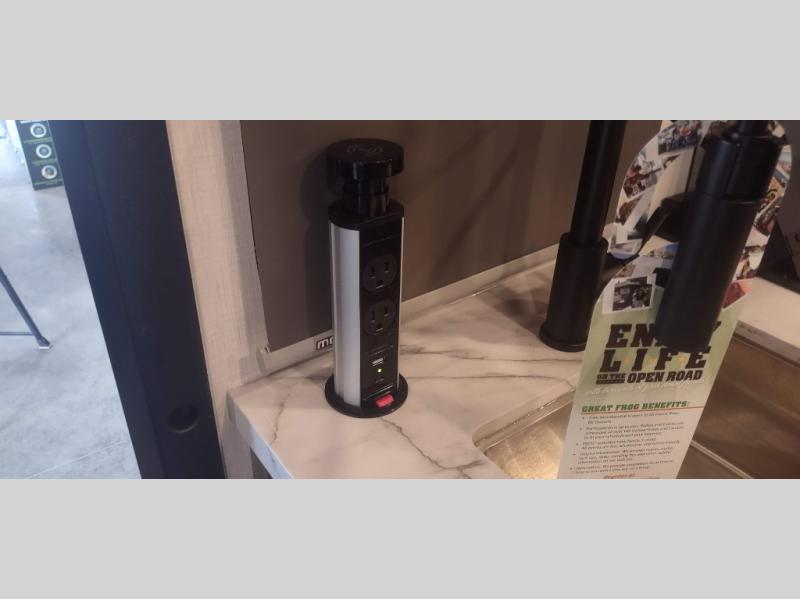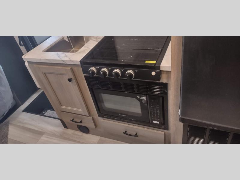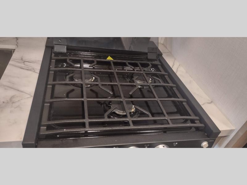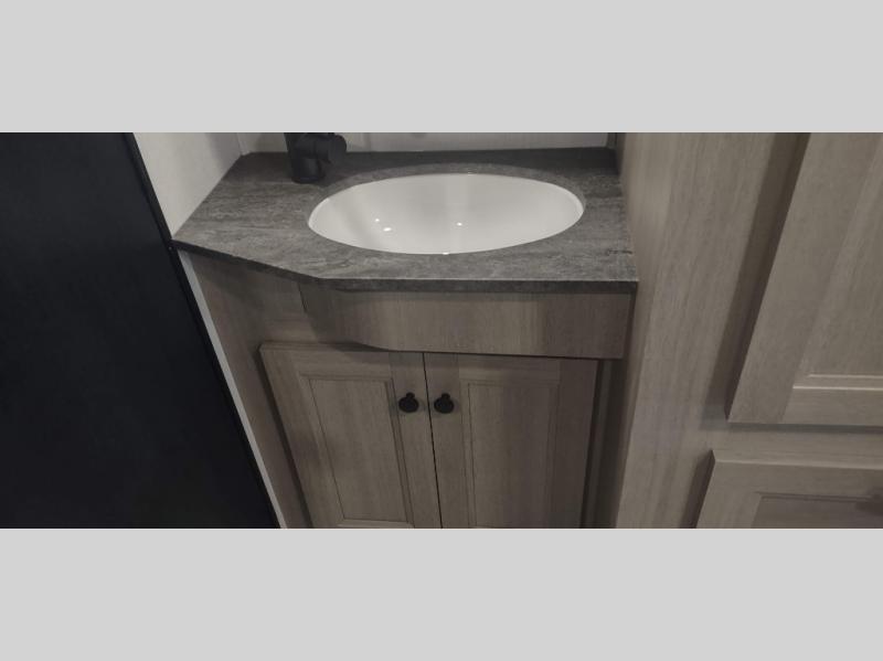 Cook up your favorite meals in the fully equipped kitchen featuring a 10.7 cu. ft. 12V refrigerator, a convection microwave, recessed three-burner range, soft touch self-closing drawer guides, and a handy cordless 12V charging plate to keep devices powered up. The split bathroom design offers convenience for busy mornings — with a private toilet and shower on one side, and a separate sink area outside so two can freshen up at once.