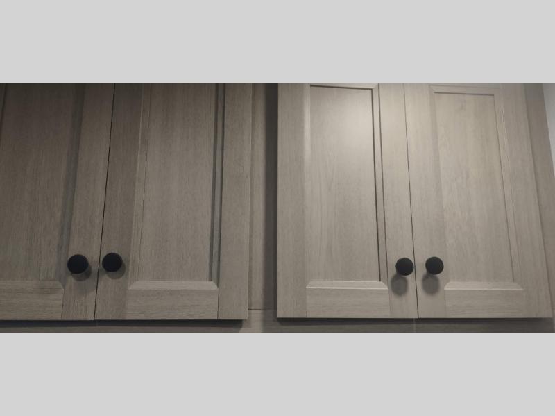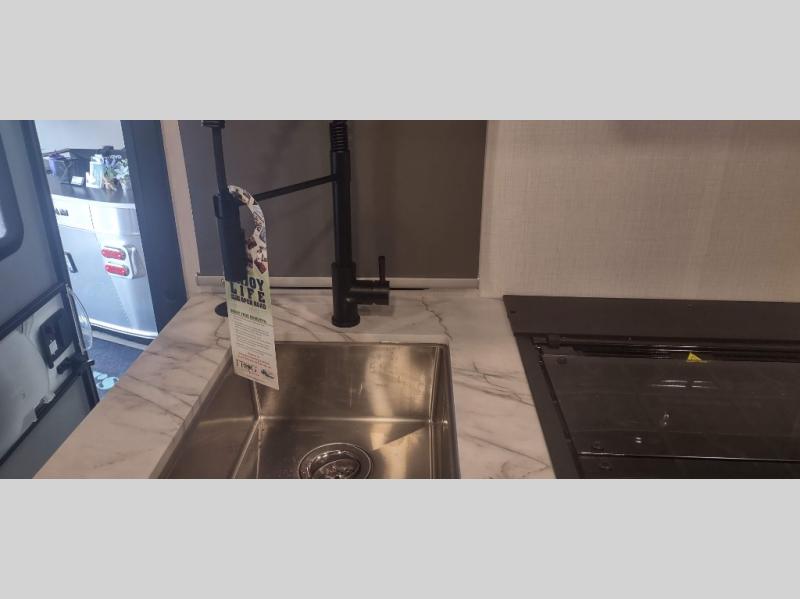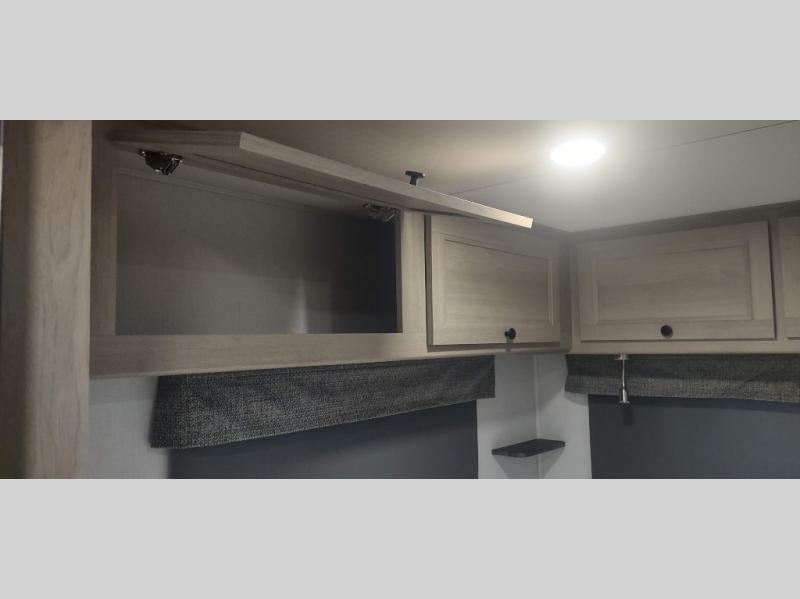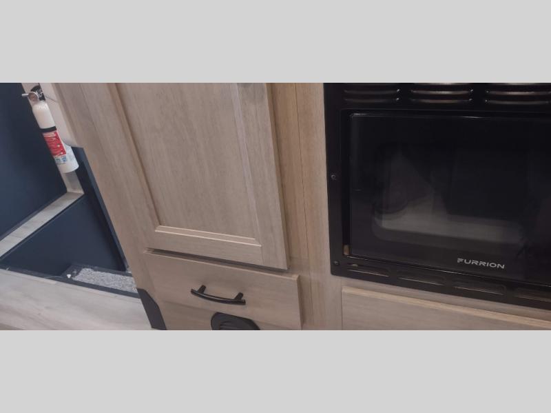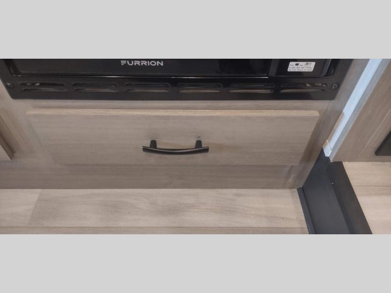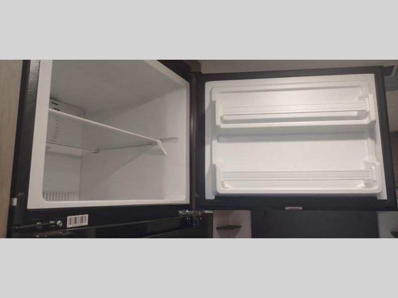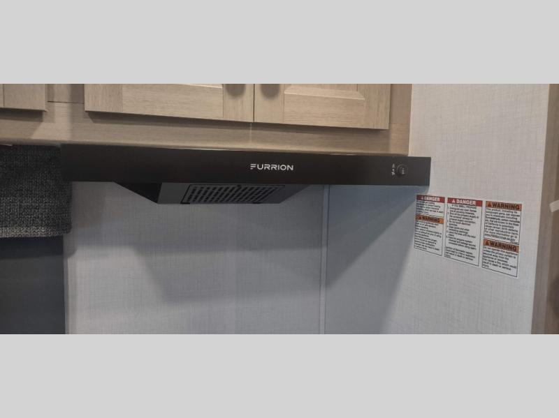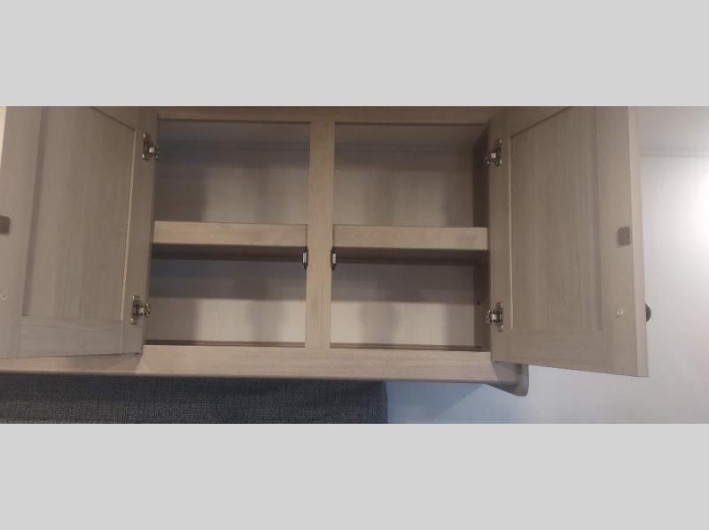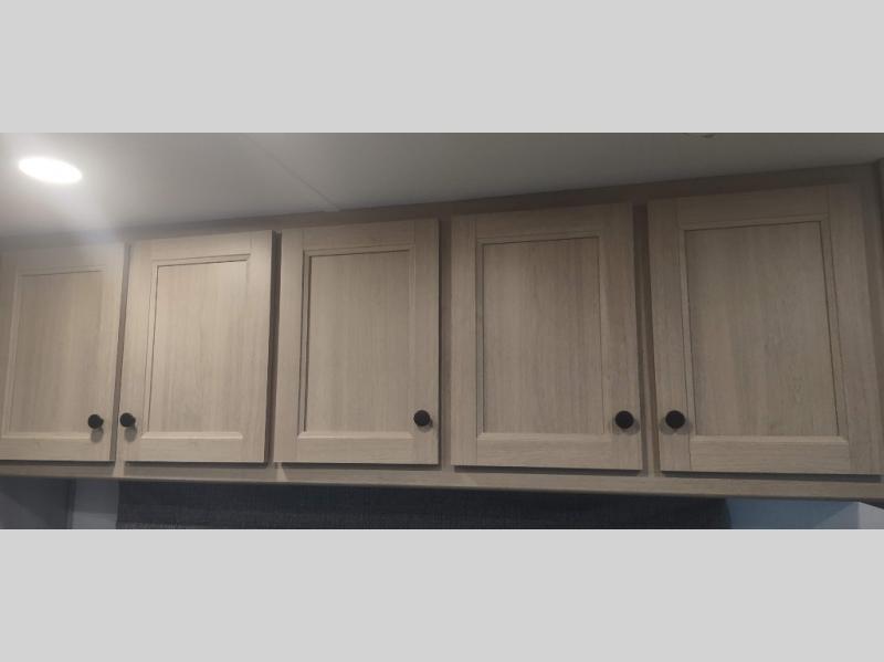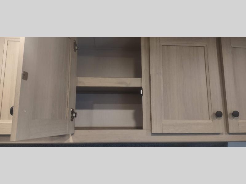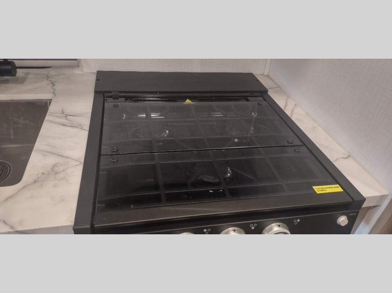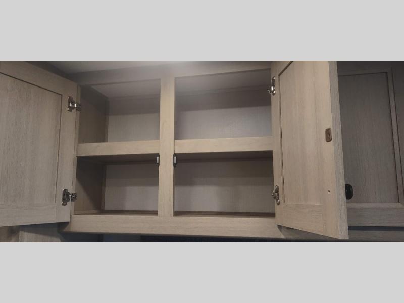 Cook up your favorite meals in the fully equipped kitchen featuring a 10.7 cu. ft. 12V refrigerator, a convection microwave, recessed three-burner range, soft touch self-closing drawer guides, and a handy cordless 12V charging plate to keep devices powered up. The split bathroom design offers convenience for busy mornings — with a private toilet and shower on one side, and a separate sink area outside so two can freshen up at once.