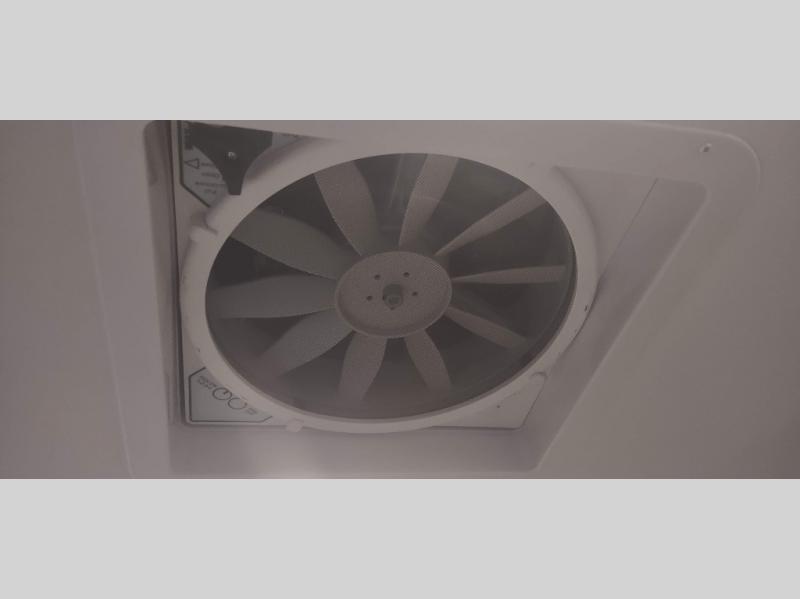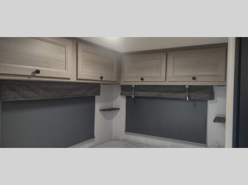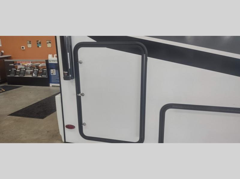 On the outside, this coach is just as impressive — boasting aluminum-framed laminated sidewalls, a gel-coat fiberglass exterior, a one-piece fiberglass front cap, and slide room toppers for added protection and durability. Inside, you'll appreciate thoughtful touches like the Maxx Air multi-speed power fan in the kitchen, a high-pressure oxygen-infused shower head, and blackout roller shades for a peaceful night’s rest.