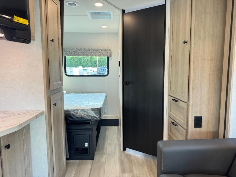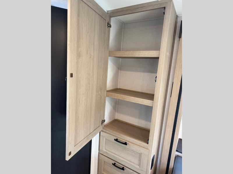 This flush floor bedroom and living area is spacious and inviting with a slide out sofa and booth dinette across from the kitchen amenities. The kitchen offers a 10.7 cu. ft. 12V refrigerator, a convection microwave, and a recessed three-burner range. You will also find the 12V TV with work station below and a pantry. More storage can be found in the linen cabinet next to the rear bathroom plus there is a wardrobe in the rear bedroom. You'll get a great night's rest on the queen bed slide out and your guests can sleep on the cab-over bunk or living area furniture.