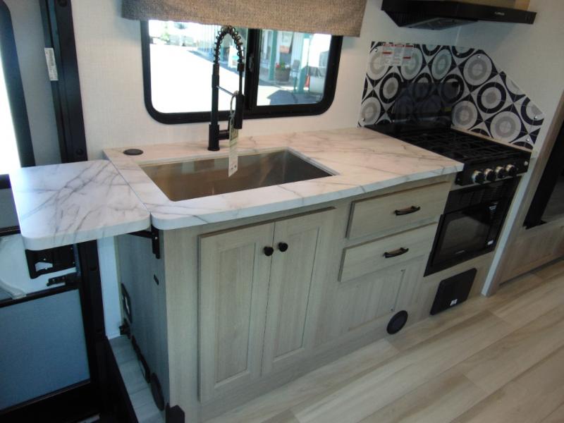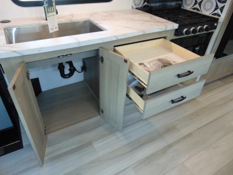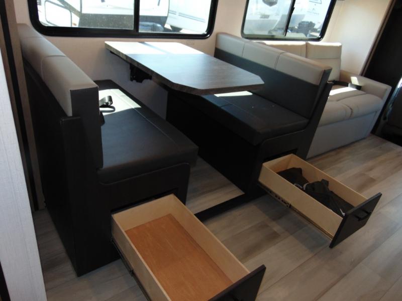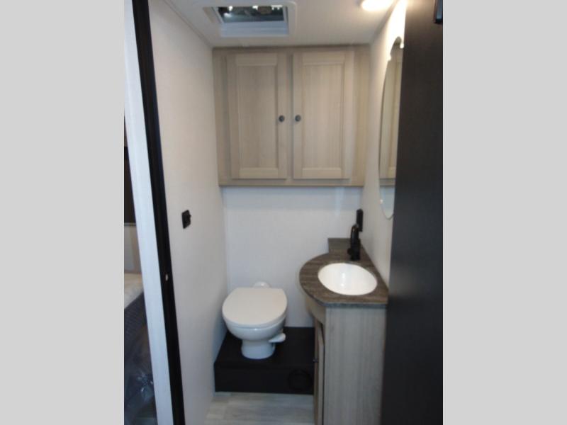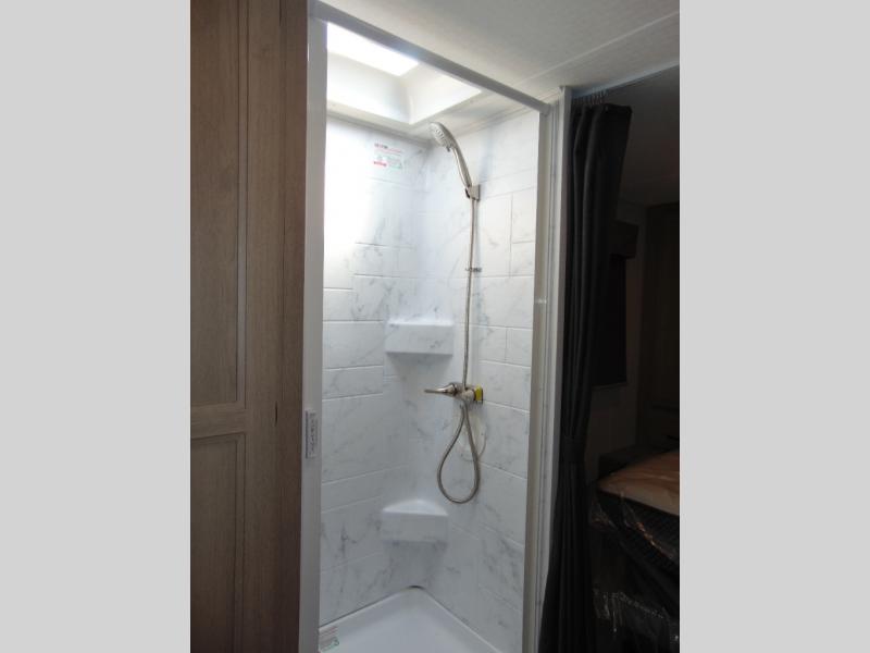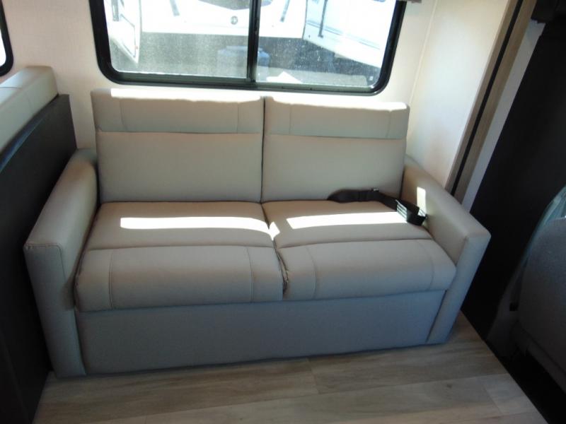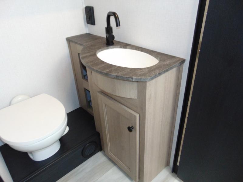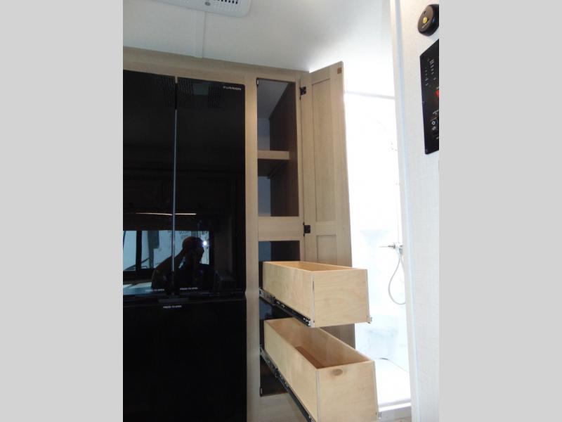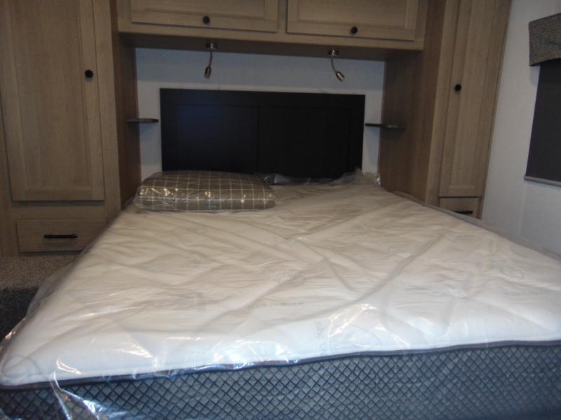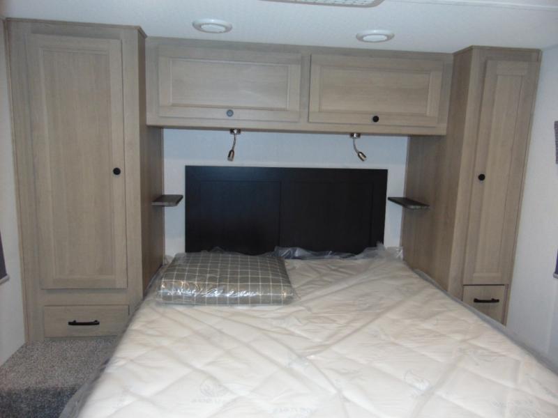 You and your favorite person will love this coach for many reasons including having your own private bedroom with a split bathroom, a walk-around queen bed, plus your own wardrobe. The split bathroom is pretty handy since one person can get ready in the private toilet and sink room while another is taking a shower. The kitchen offers a 10.7 cu. ft. 12V refrigerator, a convection microwave, a recessed three-burner range, soft touch self-closing drawer guides and a cordless 12V charging plate. You will have overhead cabinets and a pantry for storage. T