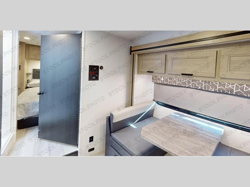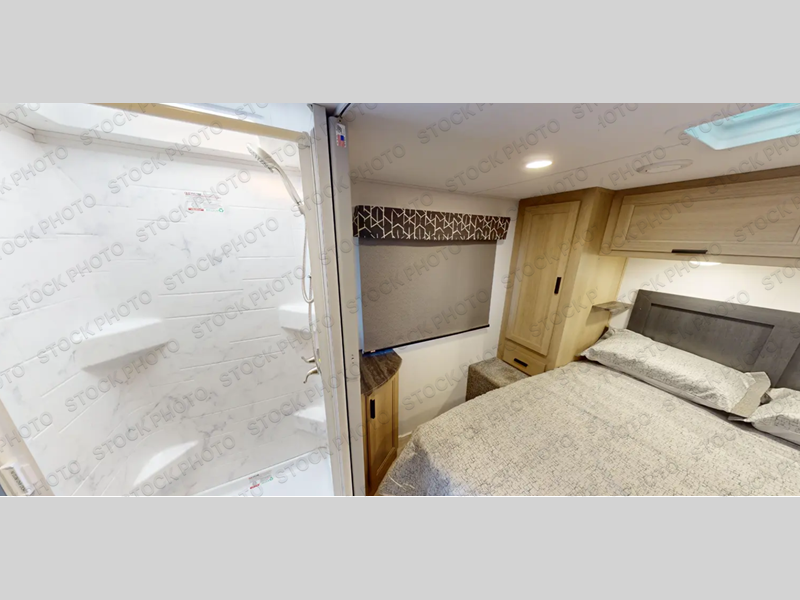 You and your favorite person will love this coach for many reasons including having your own private bedroom with a split bathroom, a walk-around queen bed, plus your own wardrobe. The split bathroom is pretty handy since one person can get ready in the private toilet and sink room while another is taking a shower. The kitchen offers a 10.7 cu. ft. 12V refrigerator, a convection microwave, a recessed three-burner range, soft touch self-closing drawer guides and a cordless 12V charging plate. You will have overhead cabinets and a pantry for storage. The slide out sofa and booth dinette offer a great place to relax and dine plus gives you more floor space. And the queen bunk over the cab will be a popular sleeping space for overnight guests.