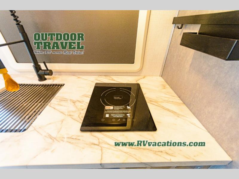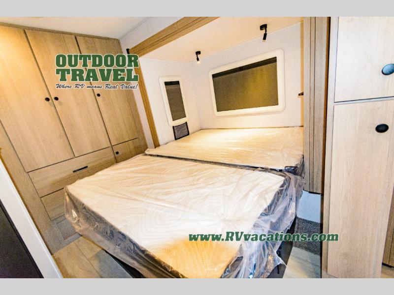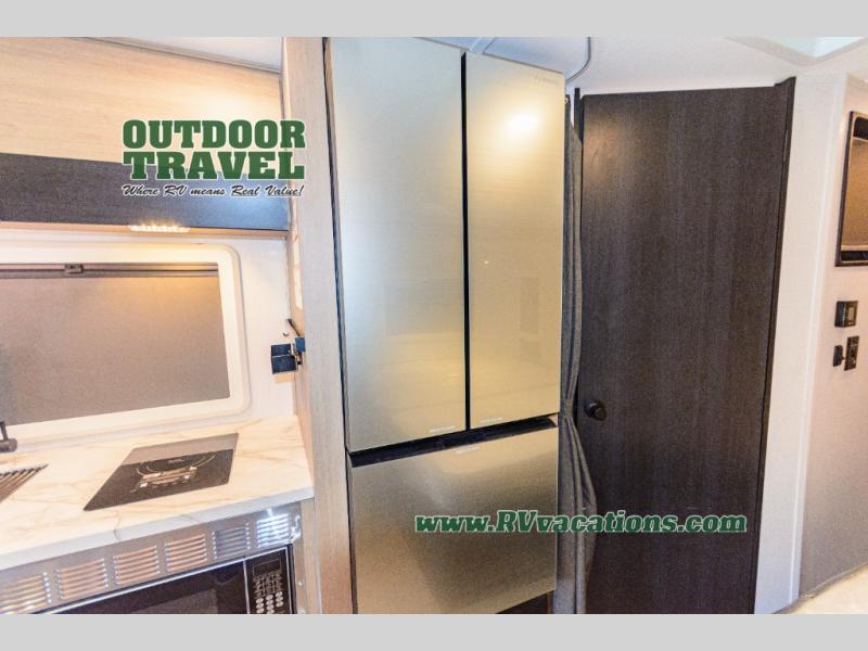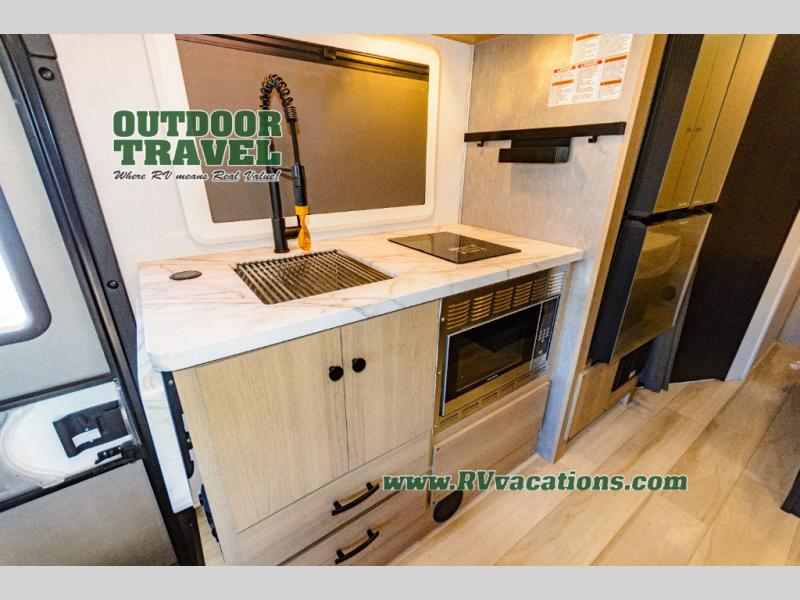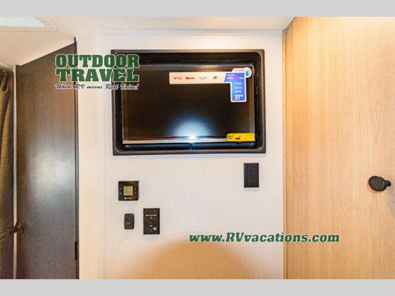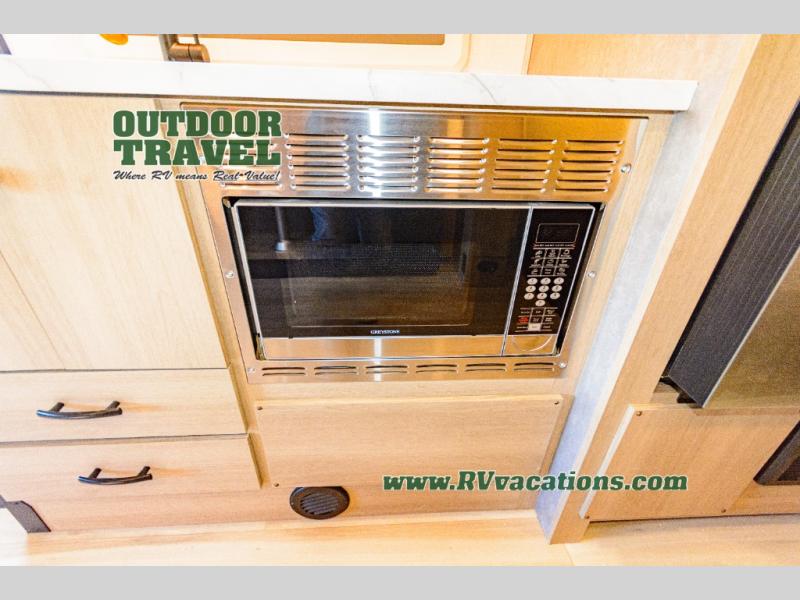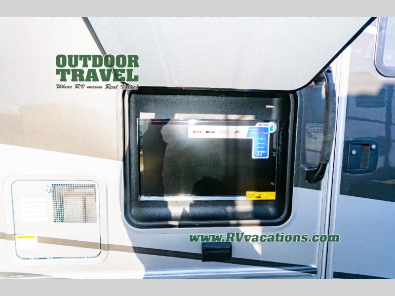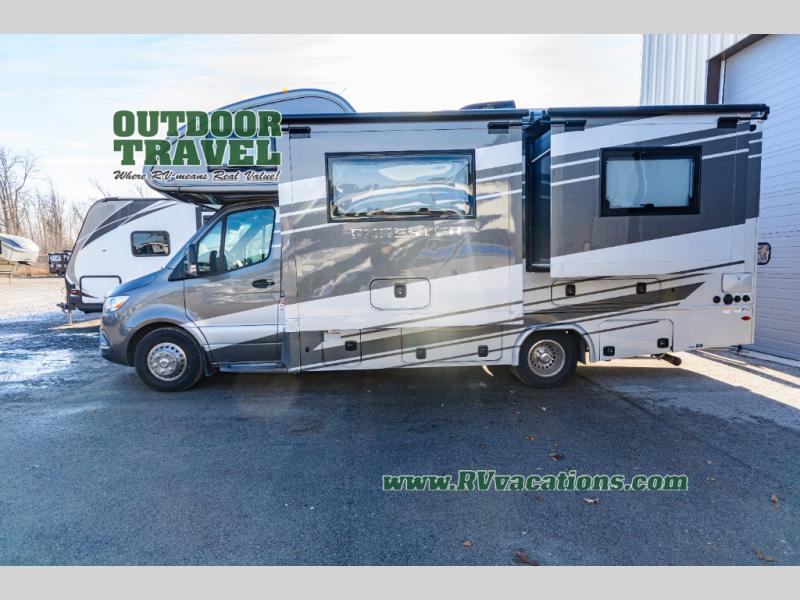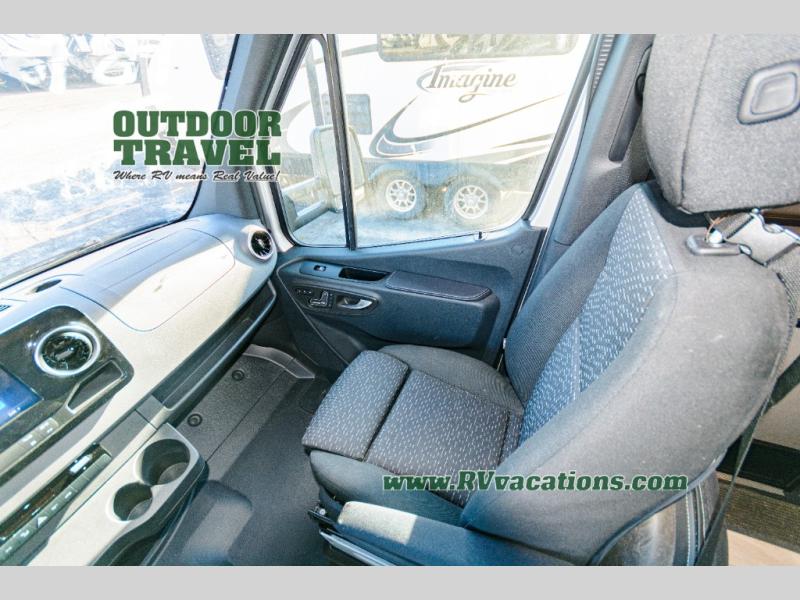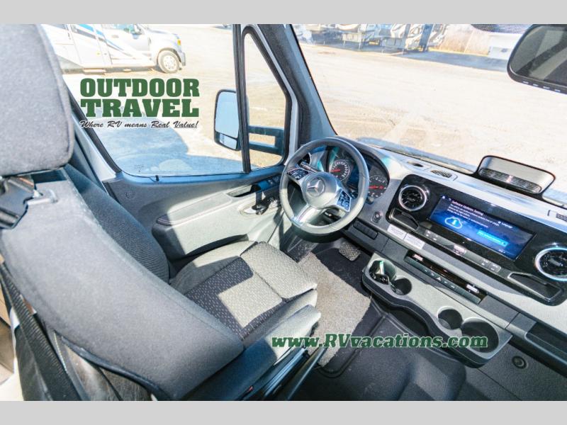 About This RV This beautiful RV rides on the Mercedes Benz Sprinter Chassis and features flush floor bedroom and living areas. This well equipped RV features the premium camping package which includes undermount 1.3 stainless steel convection microwave, 10 Cu. 12V Refrigerator, back up camera/side view cameras with monitor, Winegard 360+ antenna with gateway WiFi capability, 12V bedroom TV, slide room toppers, ultra leather driver/passenger seating with boosters, fiberglass running boards, LP quick connect, 15K A/C with heat pump.
