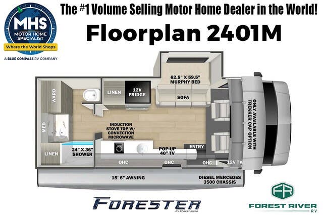 MSRP $213,291. All new 2025 Forest River Forester MBS 2401M for sale at Motor Home Specialist; the #1 volume selling motor home dealership in the world. This beautiful RV rides on the Mercedes Benz Sprinter Chassis and features flush floor bedroom and living areas. This well equipped RV features the optional full body paint, roof mounted solar charging system, auto leveling system, and the premium camping package which includes undermount 1.3 stainless steel convection microwave, 10 Cu. 12V Refrigerator, back up camera/side view cameras with monitor, Winegard 360+ antenna with gateway WiFi capability, 12V bedroom TV, slide room toppers, ultra leather driver/passenger seating with boosters, fiberglass running boards, LP quick connect, 15K A/C with heat pump. Shop hundreds of motorhomes including class C diesel RVs at 1 location! Choose from Thor Delano – Tiburon – Chateau – Four Winds – Quantum – Entegra Coach Qwest – Qwest SE – East to West Entrada M Class – Forester MBS – Dynamax Isata 3 and much more. We also sell quality pre-owned models such as Jayco Melbourne – Melbourne Prestige – Tiffin Wayfarer – Forest River Sunseeker MBS – Solera – Winnebago View – Navion – Vita – Porto – Renegade Vienna – Coachmen Prism – Prism Elite – Grand Design Lineage – Holiday Rambler Element and much more. Visit MHSRV.com for our complete line-up and the sale prices that have made us the #1 volume selling motor home dealership in the world 12 years in a row! For additional details on this unit and our entire inventory including brochures, window sticker, videos, photos, reviews & testimonials as well as additional information about Motor Home Specialist and our manufacturers please visit us at MHSRV.com or call 800-335-6054. At Motor Home Specialist, we DO NOT charge any prep or orientation fees like you will find at other dealerships. All sale prices include a 200-point inspection, interior & exterior wash, detail service and a fully automated high-pressure rain booth test and coach wash that is a standout service unlike that of any other in the industry. You will also receive a thorough coach orientation with an MHSRV technician, a night stay in our delivery park featuring landscaped and covered pads with full hook-ups and much more! Read Thousands upon Thousands of 5-Star Reviews at MHSRV.com and See What They Had to Say About Their Experience at Motor Home Specialist. WHY PAY MORE? WHY SETTLE FOR LESS?
